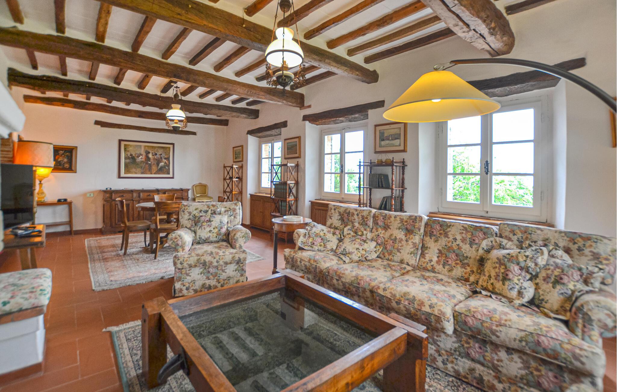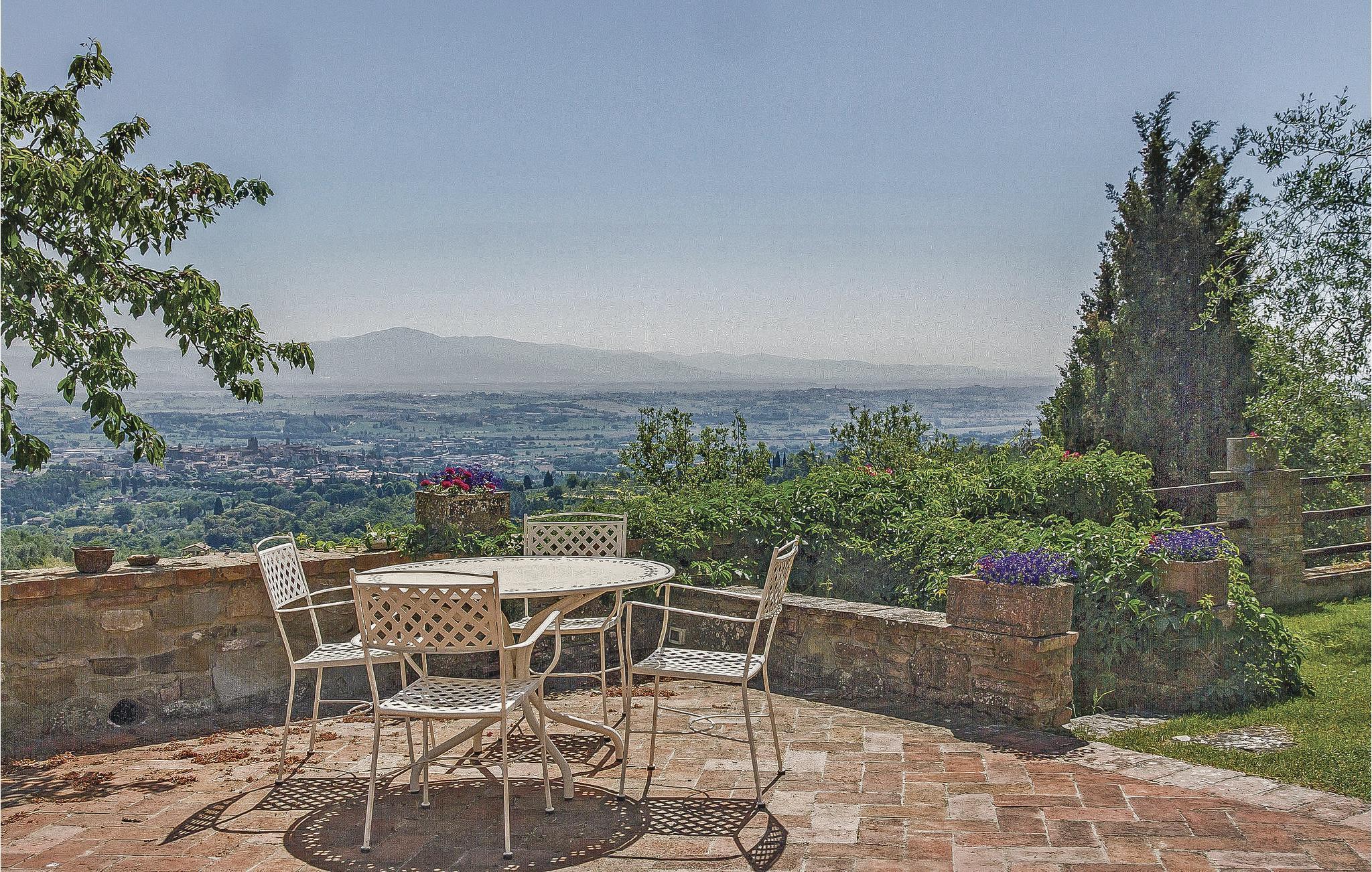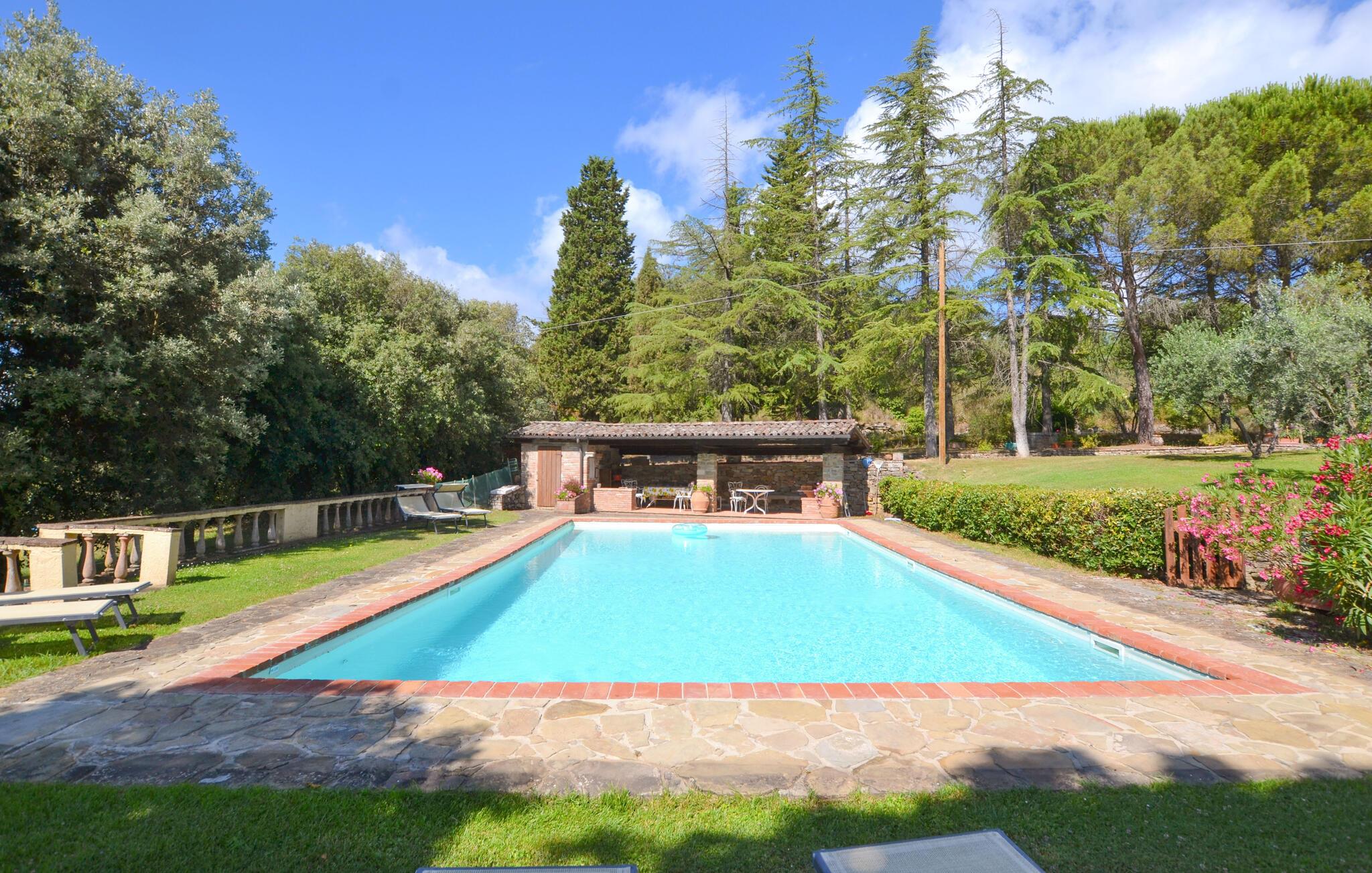 Komfortables Landhaus im toskanischen Stil, mit parkähnlichem Garten und exklusivem Poolbereich, zirka 3 km vom netten Städtchen Monte San Savino entfernt. Das ehemalige Bauernhaus, in leichter Hügellage über dem Chiana-Tal, wurde besonders geschmackvoll eingerichtet. Im EG bildet ein großer offener Wohnraum, nur durch Bögen unterteilt, den gemütlichen Mittelpunkt des Hauses. Zur Küche gehört eine eigene Terrasse mit Barbecue und weitem Blick über das grüne Chianatal. Weitere Terrassen umgeben das Haus sowohl im EG als auch im 1.Stock, wo sich die Schlafzimmer befinden. Etwas unterhalb vom Haus liegt der große Pool mit Sonnenterrassen und einer überdachten Terrasse, komfortabel möbliert - was braucht es mehr zum gediegenen Entspannen? In nur zwei km Entfernung erreichen Sie von hier aus ein gutes Restaurant - auch zu Fuß bei einem Spaziergang durch die malerische Landschaft. Im nahen Städtchen Monte San Savino (3 km) finden Sie alles für den täglichen Bedarf - mehrere gute Restaurants, Bars, eine Eisdiele, kleine Geschäfte mit Spezialitäten und mittwochs einen bunten Wochenmarkt. Die kulinarische Spezialität des Ortes ist die Porchetta, ein gut gewürztes Spanferkel. Für kulturell interessierte und leidenschaftliche Städtebummler ist es zudem nicht weit nach Arezzo (18 km, auch mit der Bummelbahn von Monte San Savino aus), Cortona 25 km, Montepulciano und Siena 45 km, oder nach Florenz 90 km. Das Grundstück ist vollständig umzäunt. Kurze unasphaltierte Zufahrt.