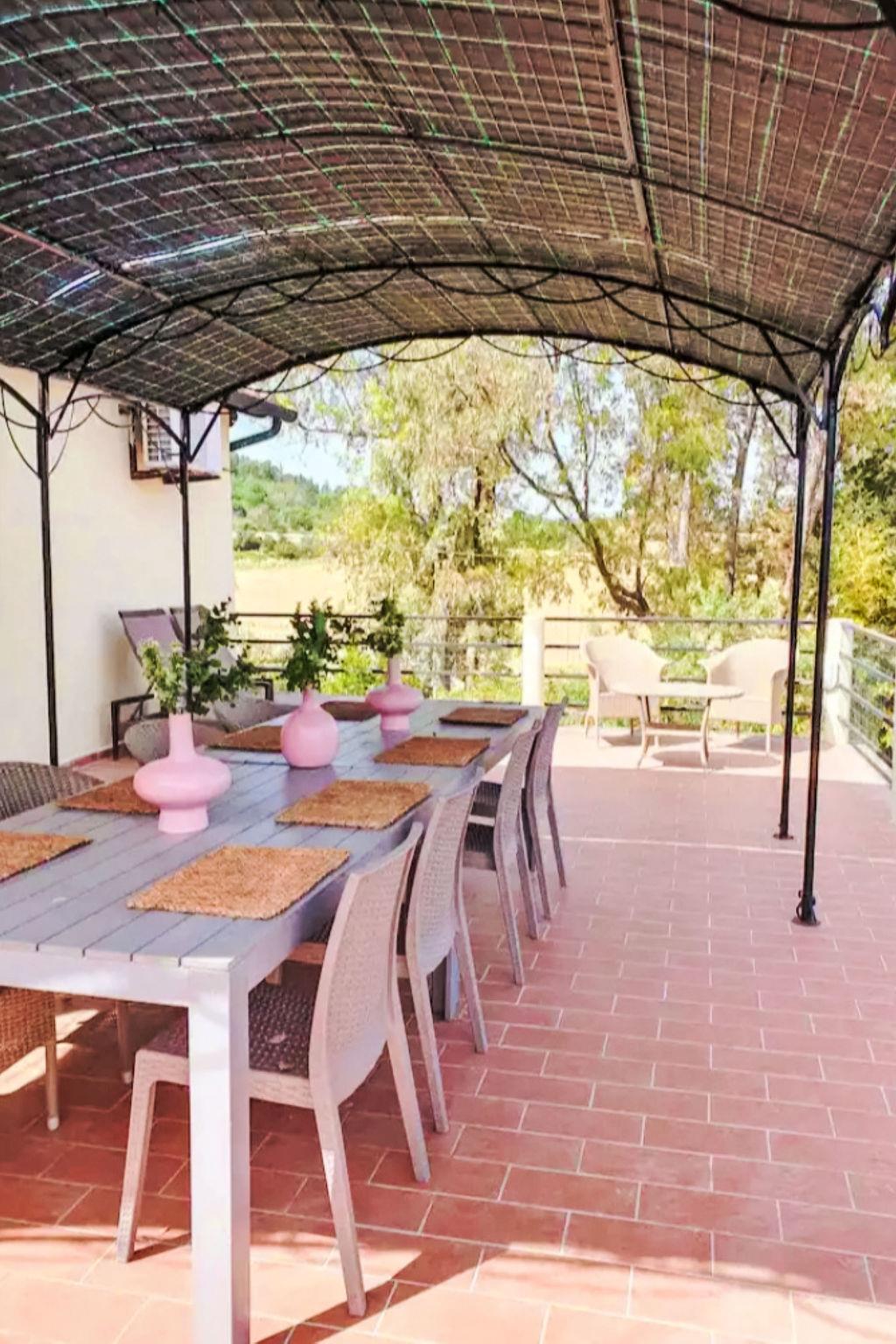 5-Zimmer-Wohnung 150 m2, im Obergeschoss. Geräumig, einfach und gemütlich eingerichtet: Obergeschoss: (Aussentreppe) Wohn-/Esszimmer. Wohnzimmer. 3 Doppelzimmer, jedes Zimmer mit 1 Doppelbett. Offene Küche (Backofen, Geschirrspüler, Gasherd, 4 Flammen, Toaster, Wasserkocher, Mikrowelle, elektrische Kaffeemaschine). Ausgang zur Terrasse. 2 Duschen/Bidet/WC. Terrasse 50 m2. Terrassenmöbel. Sehr schöne Panoramasicht auf die Landschaft. Zur Verfügung: Waschmaschine, Babybett bis 3 Jahre, Haartrockner. Internet (WLAN, gratis). Bitte beachten: eigener Eingang, Rauchmelder, Feuerlöscher. Der ausgeschriebene Pool ist zur alleinigen Nutzung. Bettwäsche, Handtücher, Endreinigung und alle Energiekosten sind inkludiert. IT050019C289WQJSQD