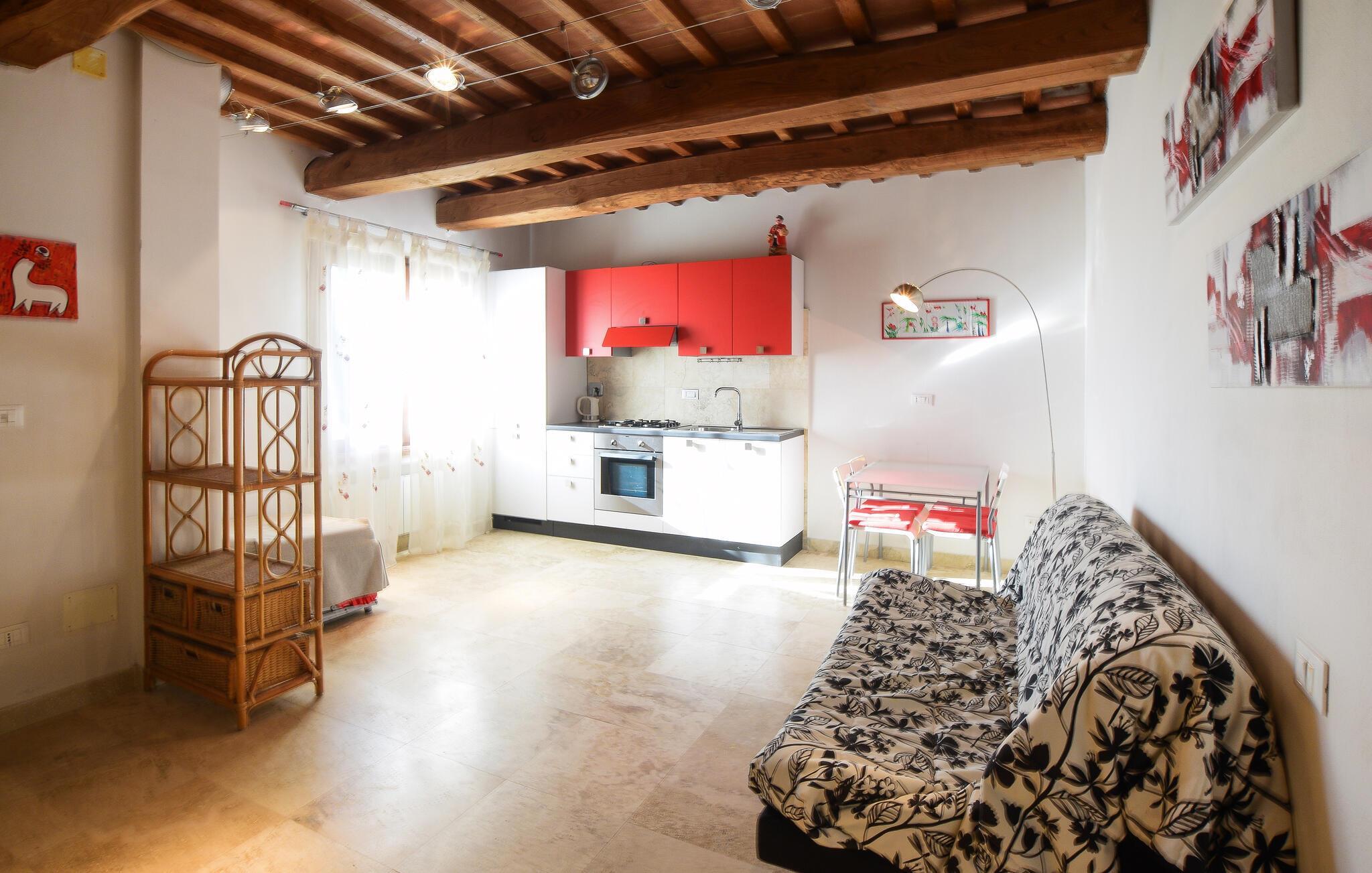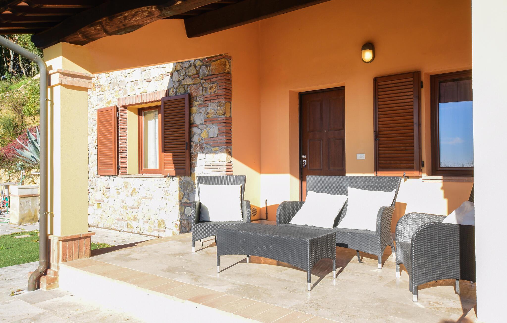 Genießen Sie entspannte Urlaubstage in diesem angenehmen Studioapartment mit traditioneller Holzdecke und einer einladenden überdachten Terrasse.