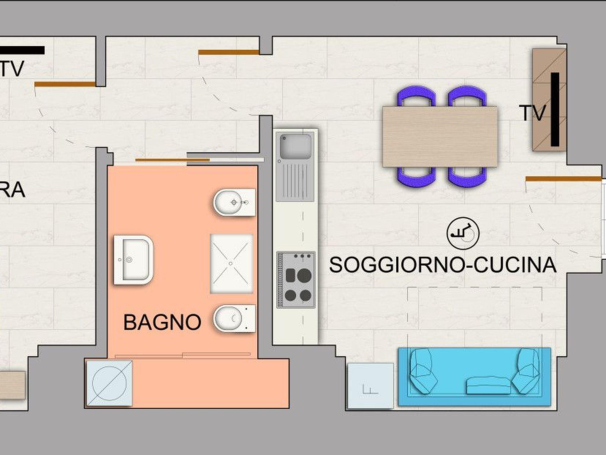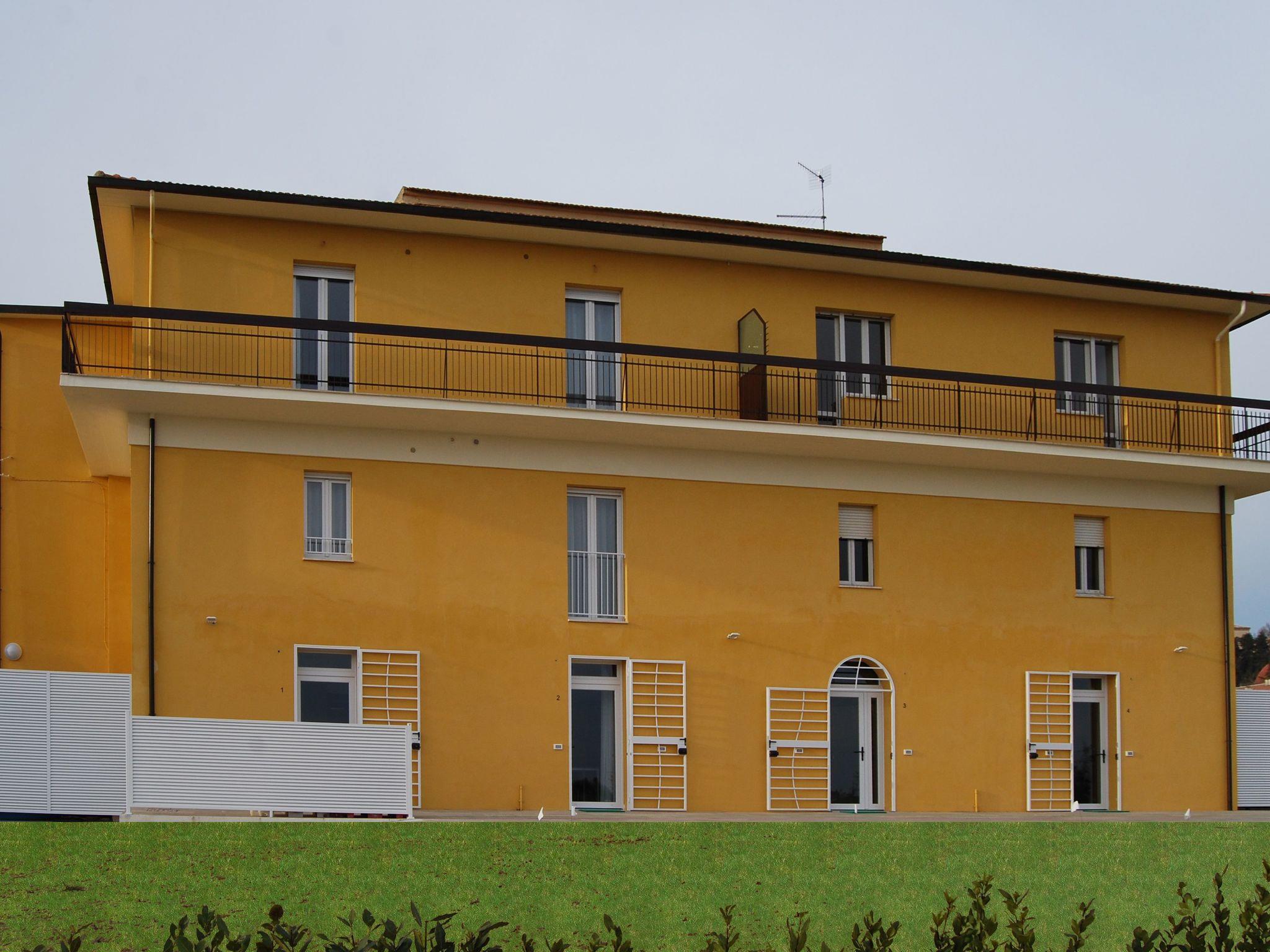 Das Gebäude verfügt über 7 Zweizimmerwohnungen mit 2/4 Betten, alle komfortabel und geräumig, gut eingerichtet, bestehend aus einer Wohnküche, einem Doppelzimmer, einem Bad mit Dusche und ausgestattet mit: voll eingerichteter Küche, Kühlschrank mit Gefrierfach, 4 Elektroherdplatten, Backofen, Geschirr, Bügeleisen und Bügelbrett, Haartrockner, unabhängige Heizung, Klimaanlage, Geschirrspüler, Waschmaschine. Beschreibung der Wohnung (ca. 45 qm) Wohnzimmer-Küche mit Kochnische, 2-Sitzer-Schlafsofa, Tisch und Stühlen; möbliertes Schlafzimmer mit zwei Betten, zwei Nachttischen und einem Kleiderschrank mit 3 Schubladen; Toilettenraum mit: Toilette, Waschbecken, Bidet, Dusche.