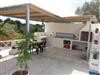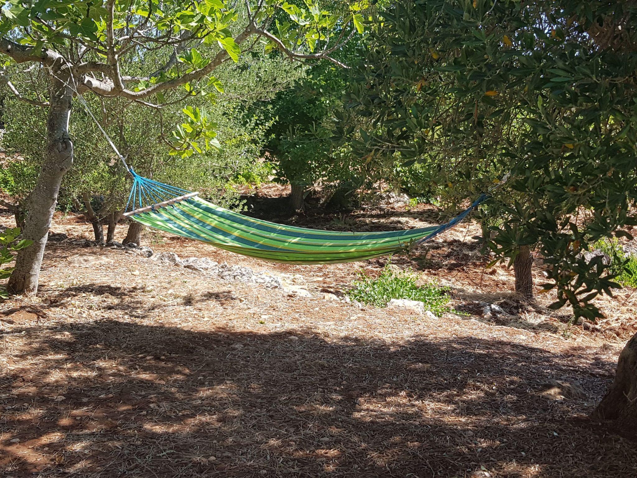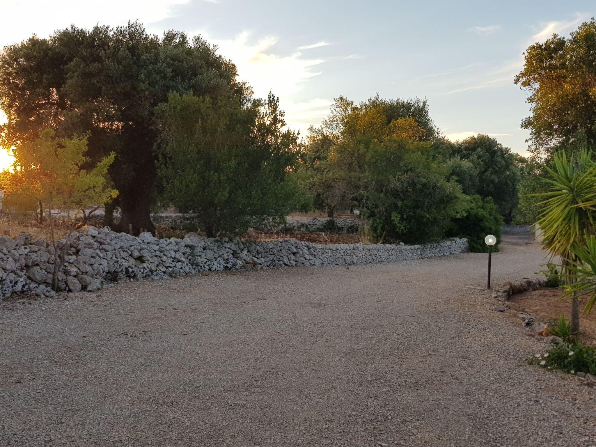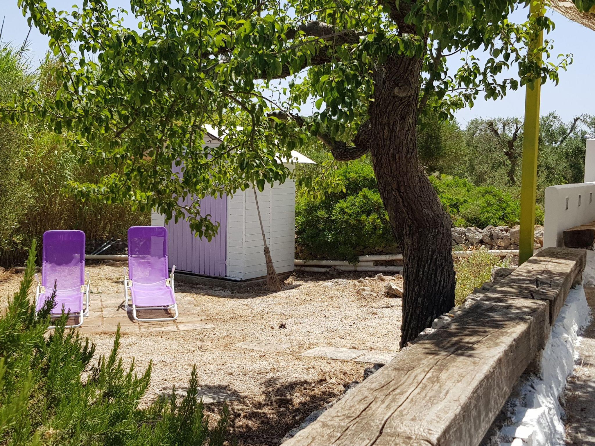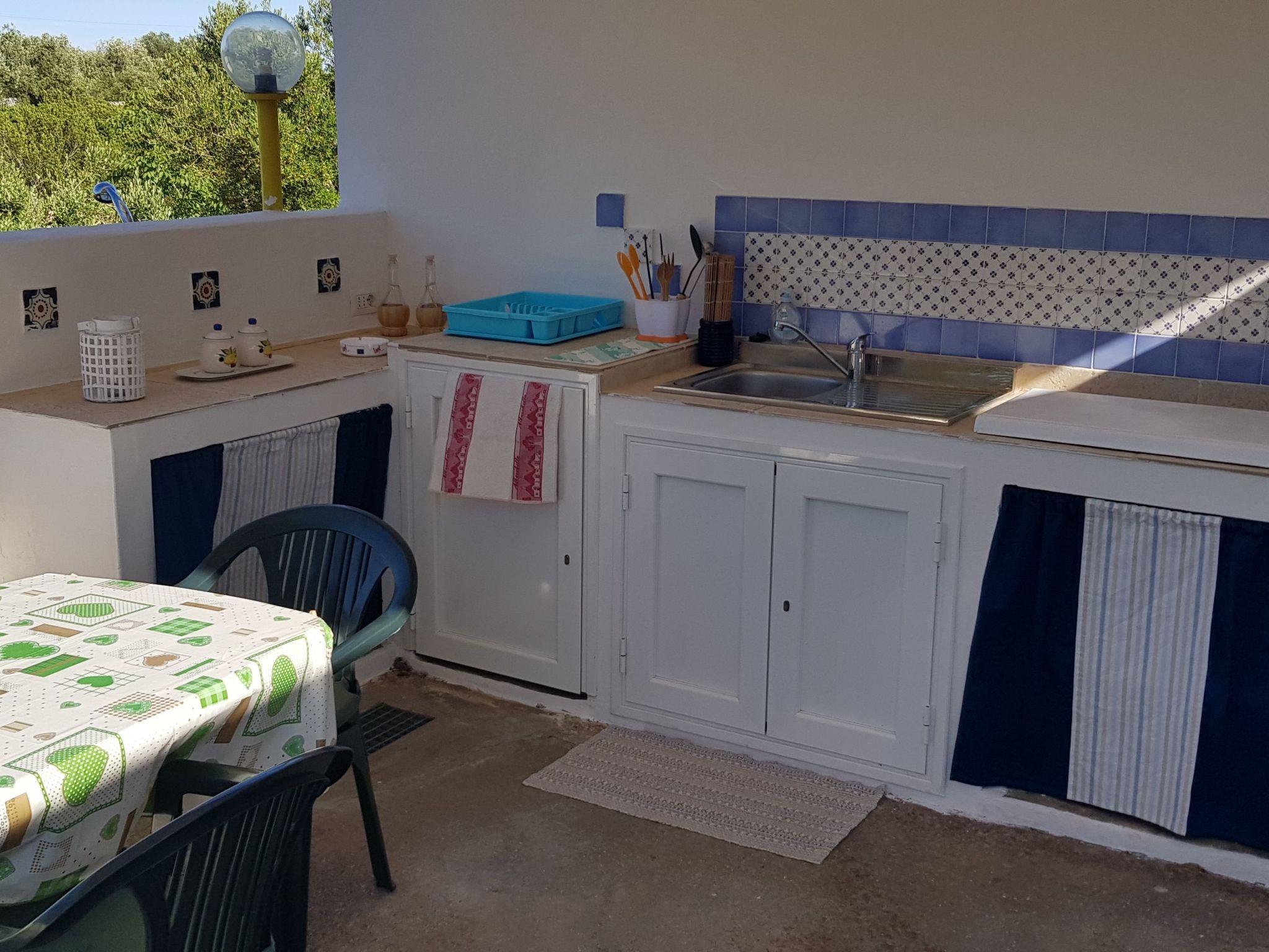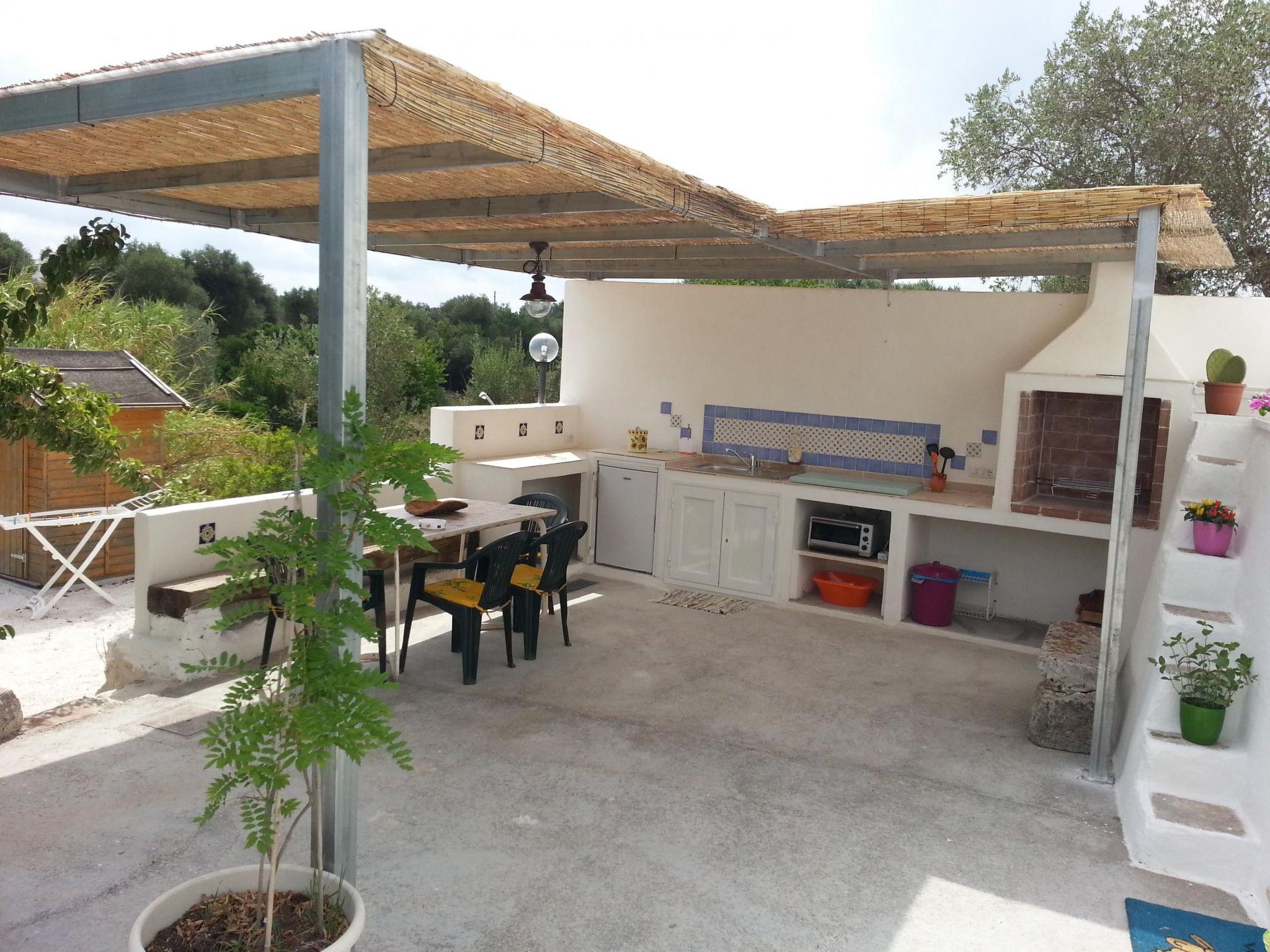 Die voll ausgestattete Außenküche befindet sich auf der Veranda vor dem Trullo. Sie verfügt über einen Kühlschrank mit Gefrierfach, einen Mini-Backofen und ein Induktionskochfeld. Ein gemauerter Grill und ein Esstisch mit Bank und Stühlen vervollständigen die Veranda. Unter der Veranda befindet sich eine schöne Sonnenterrasse mit Liegestühlen und einer Außendusche. Der Trullo ist von einem 5600 Quadratmeter großen Privatgrundstück mit allen Arten von mediterranen Bäumen umgeben: Walnüsse, Birnen, Kirschen, Kaktusfeigen, Feigen, Mandeln, Mispeln, Goldruten, Palmen und majestätische Olivenbäume.