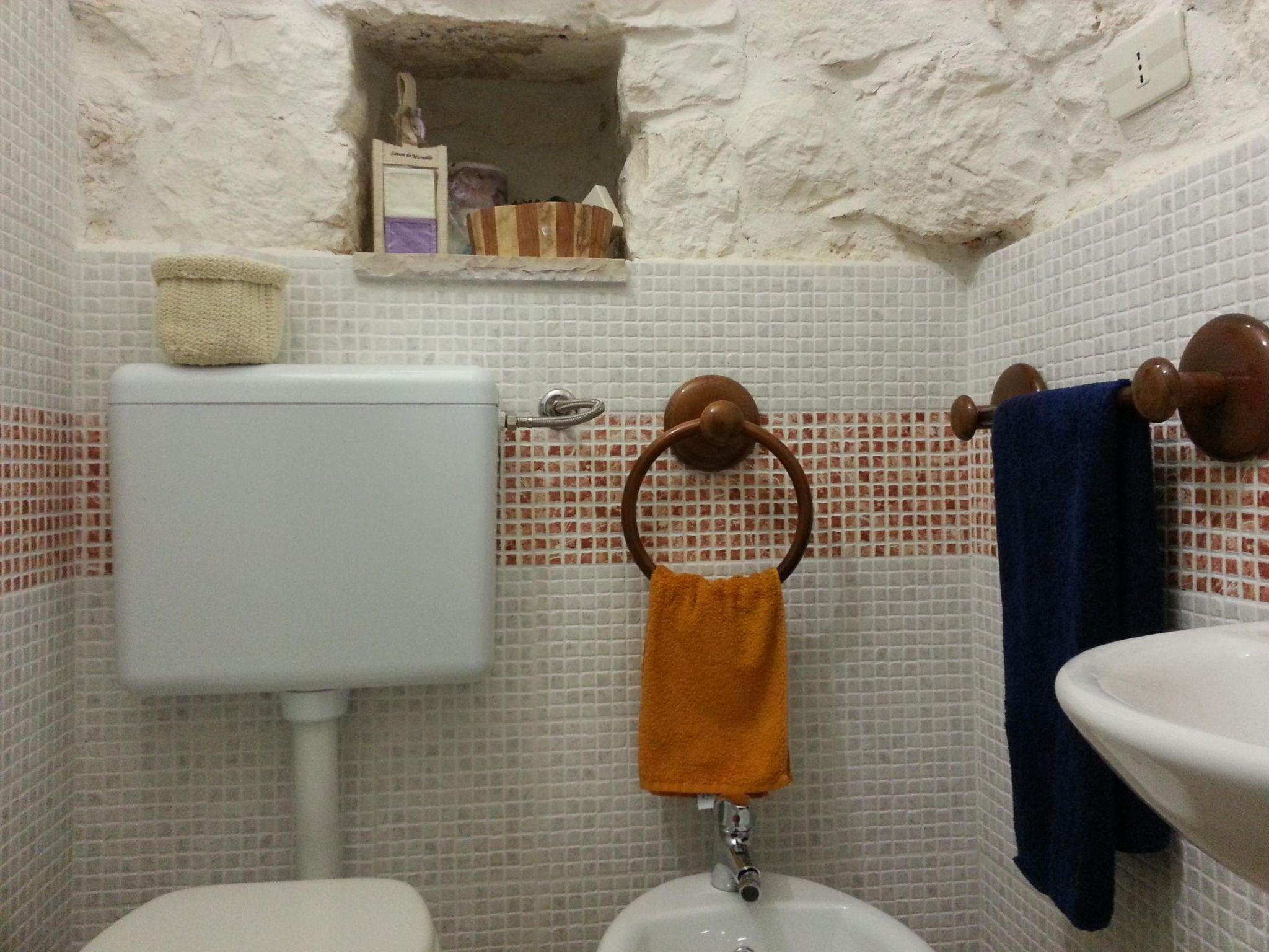 Dieser Trullo wurde kürzlich renoviert und ist daher ideal für einen Urlaub zu zweit. Aufgrund seiner eher geringen Größe ist er für ein Paar konzipiert und sehr romantisch. Die Steinwände und -decken im Inneren schaffen eine sehr gemütliche und komfortable Atmosphäre und sorgen auch in den heißesten Stunden des italienischen Sommers für eine ideale Temperatur im Inneren, ohne dass eine Klimaanlage erforderlich ist. Der Eingang führt direkt in das Wohnzimmer des Trullos, das mit einem Tisch und Stühlen, einer kleinen Anrichte, einem Kleiderschrank und einem Fernseher mit digitalem terrestrischem Fernsehen ausgestattet ist. Die Nische mit dem Bett befindet sich auf der linken Seite, während der Zugang zum Badezimmer auf der rechten Seite ist. Das Badezimmer ist etwas ganz Besonderes, mit allen modernen Annehmlichkeiten ausgestattet und mit sichtbaren Steinwänden. Es ist mit einer Dusche und einem Bidet ausgestattet. Der Trullo kann nicht beheizt werden. Es gibt keinen Internetanschluss. Ein Kinderbett kann auf Anfrage zur Verfügung gestellt werden.