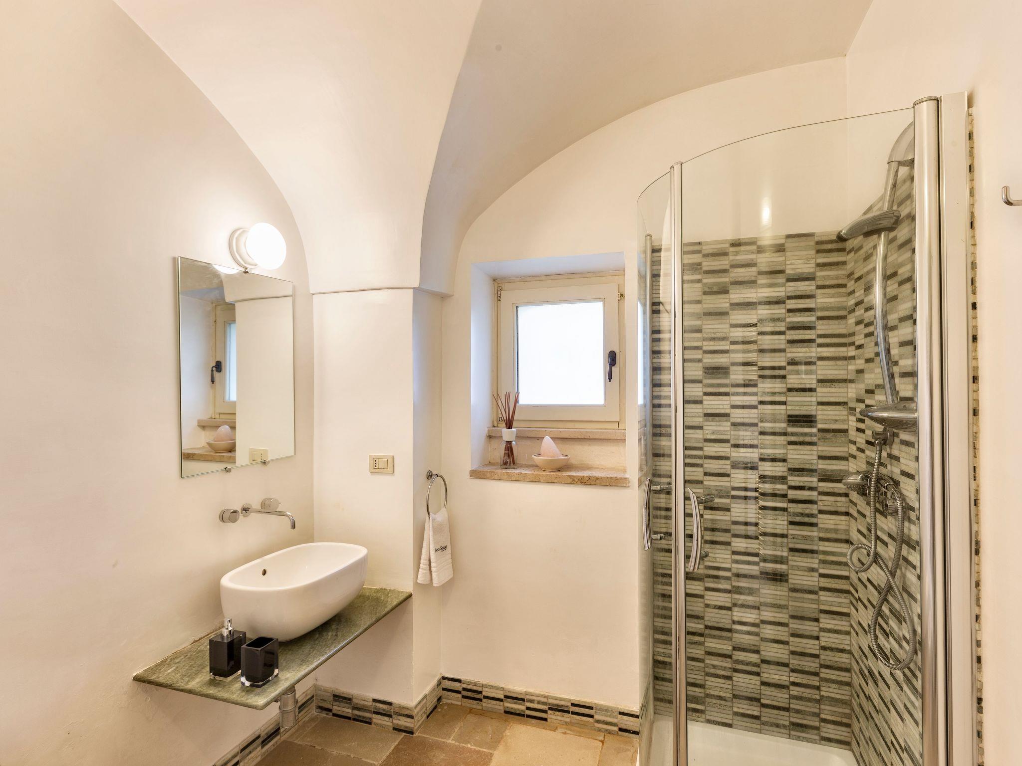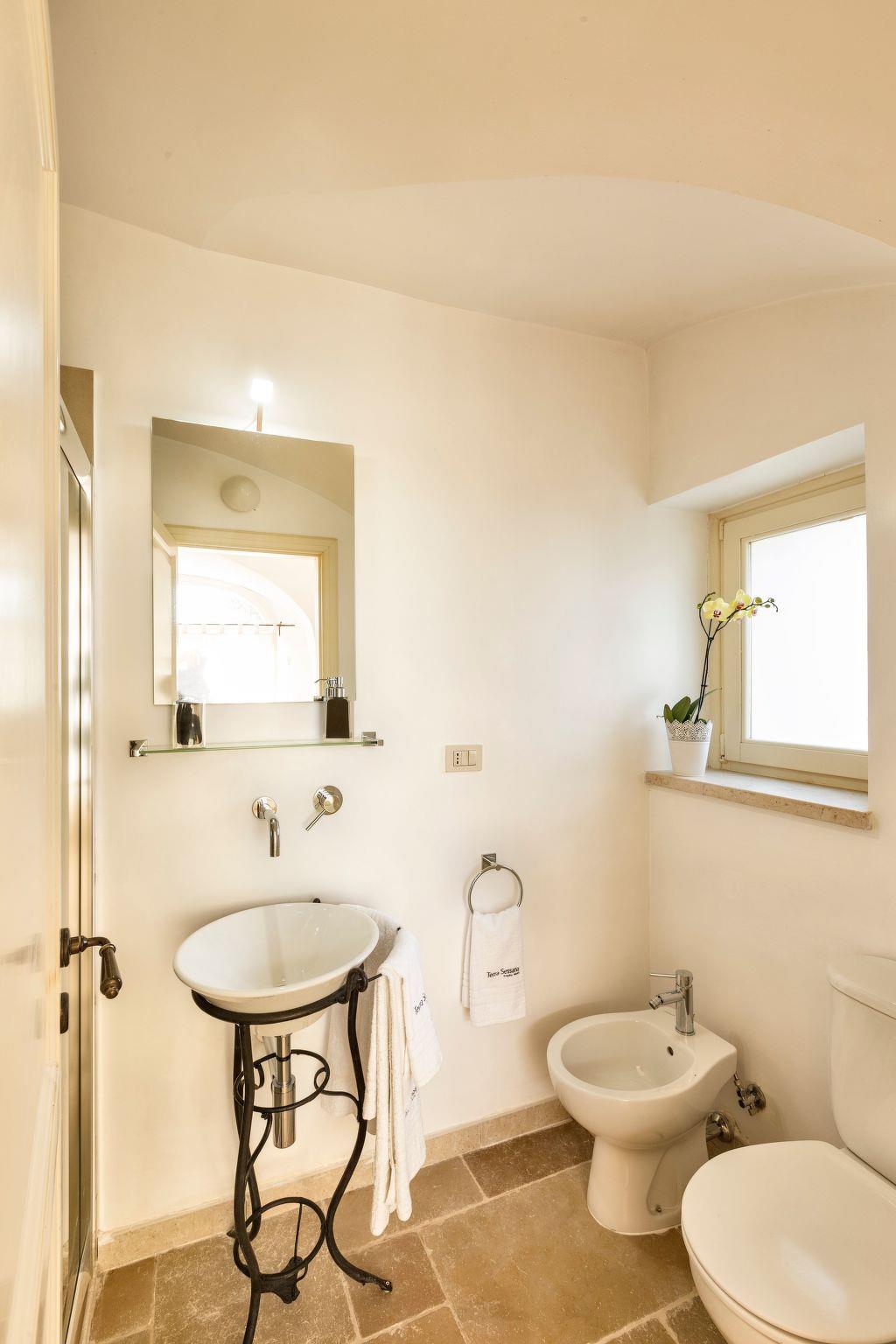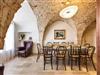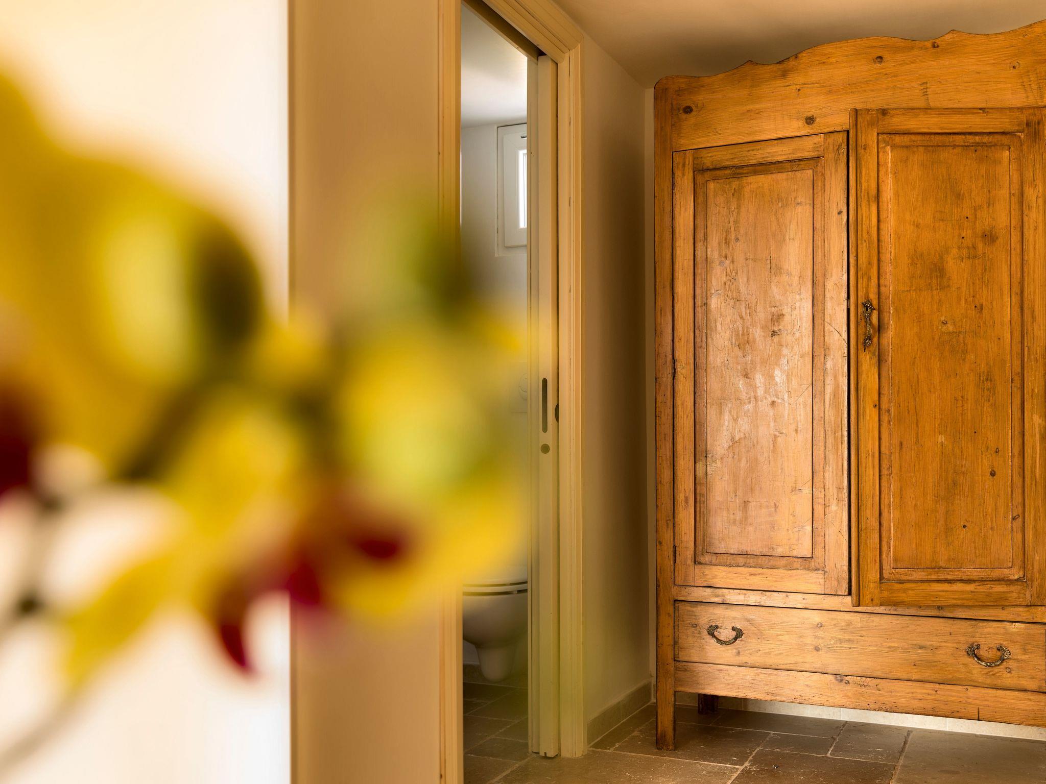 Charakteristisch sind die schöne Fassade, die so blau wie der apulische Himmel ist, und der romantische Steinbalkon. Im Außenbereich stehen den Gästen ein privater Swimmingpool und zwei Terrassen zur Verfügung, die von üppigen, weitläufigen Gärten mit Rasenflächen, Olivenbäumen, Blumen und mediterraner Macchia umgeben sind. Die stimmungsvolle Umgebung, das Schwimmbad, die Entspannungsbereiche und das Spa mit türkischem Bad machen es zu einem idealen Ort für einen erholsamen und charmanten Aufenthalt.