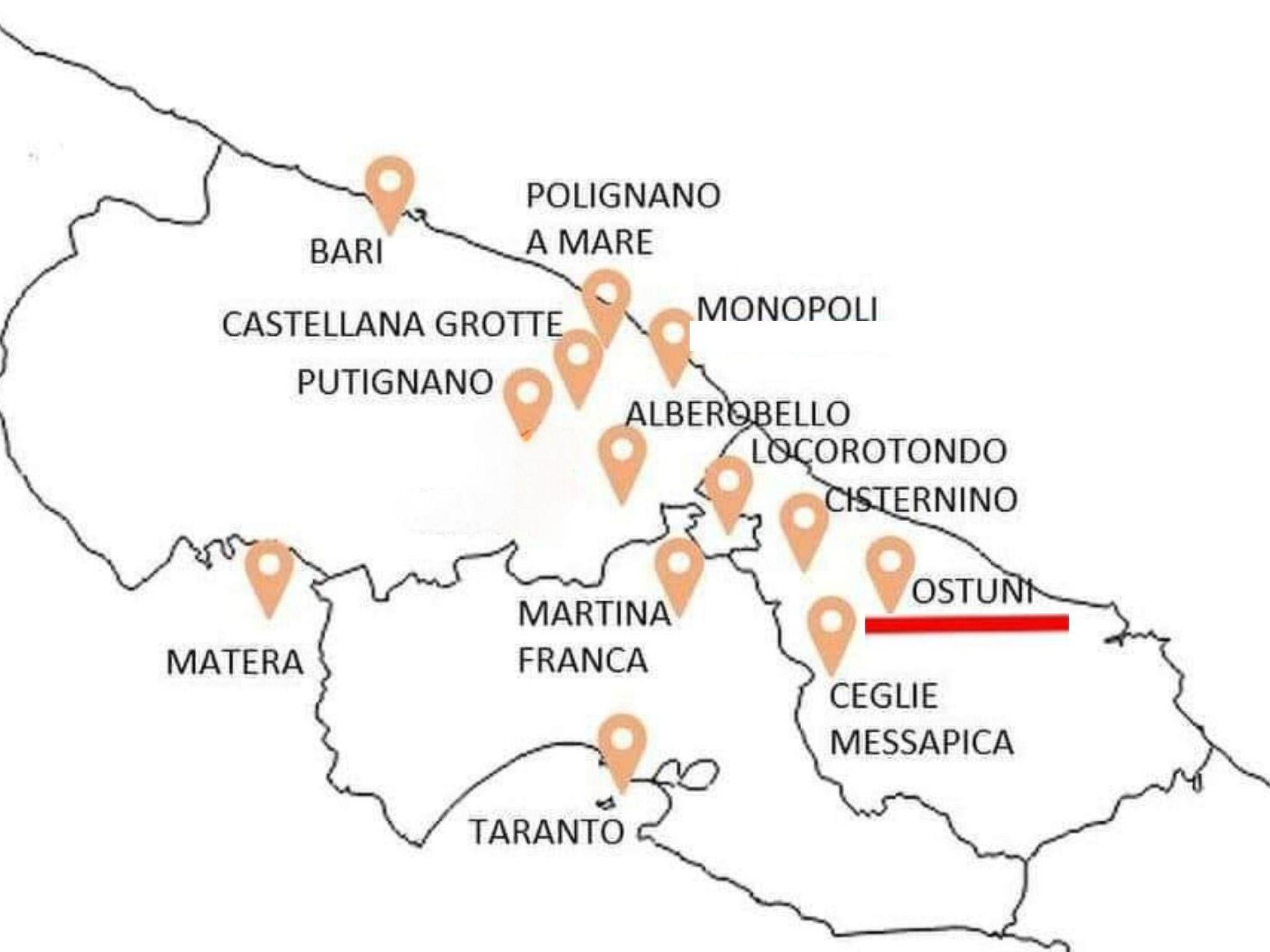 Ostuni ist 7 km vom Meer, 5 km vom Bahnhof und 20 km vom Flughafen Brindisi, 30 Minuten von Alberobello, Polignano a Mare und Monopoli entfernt.