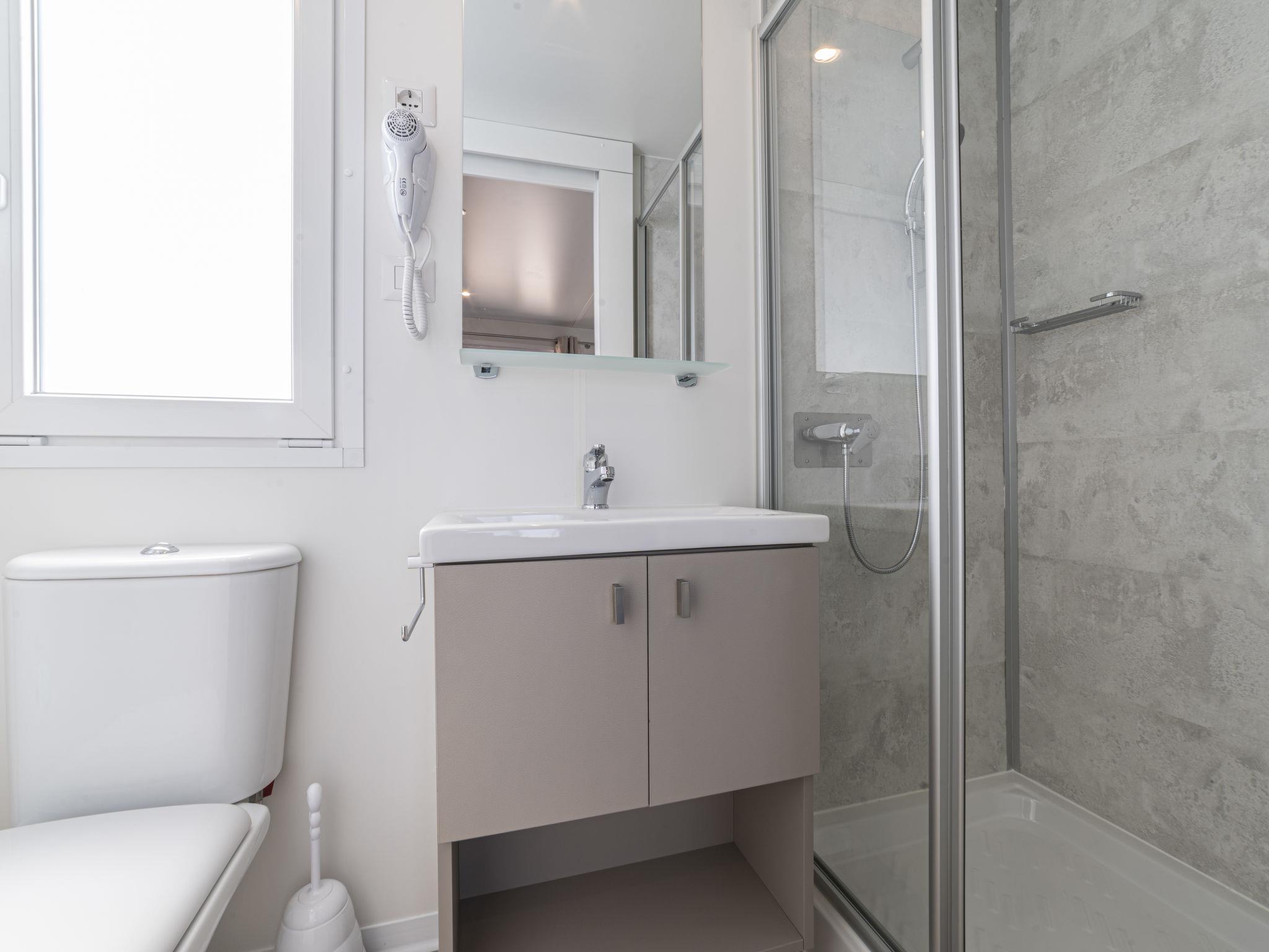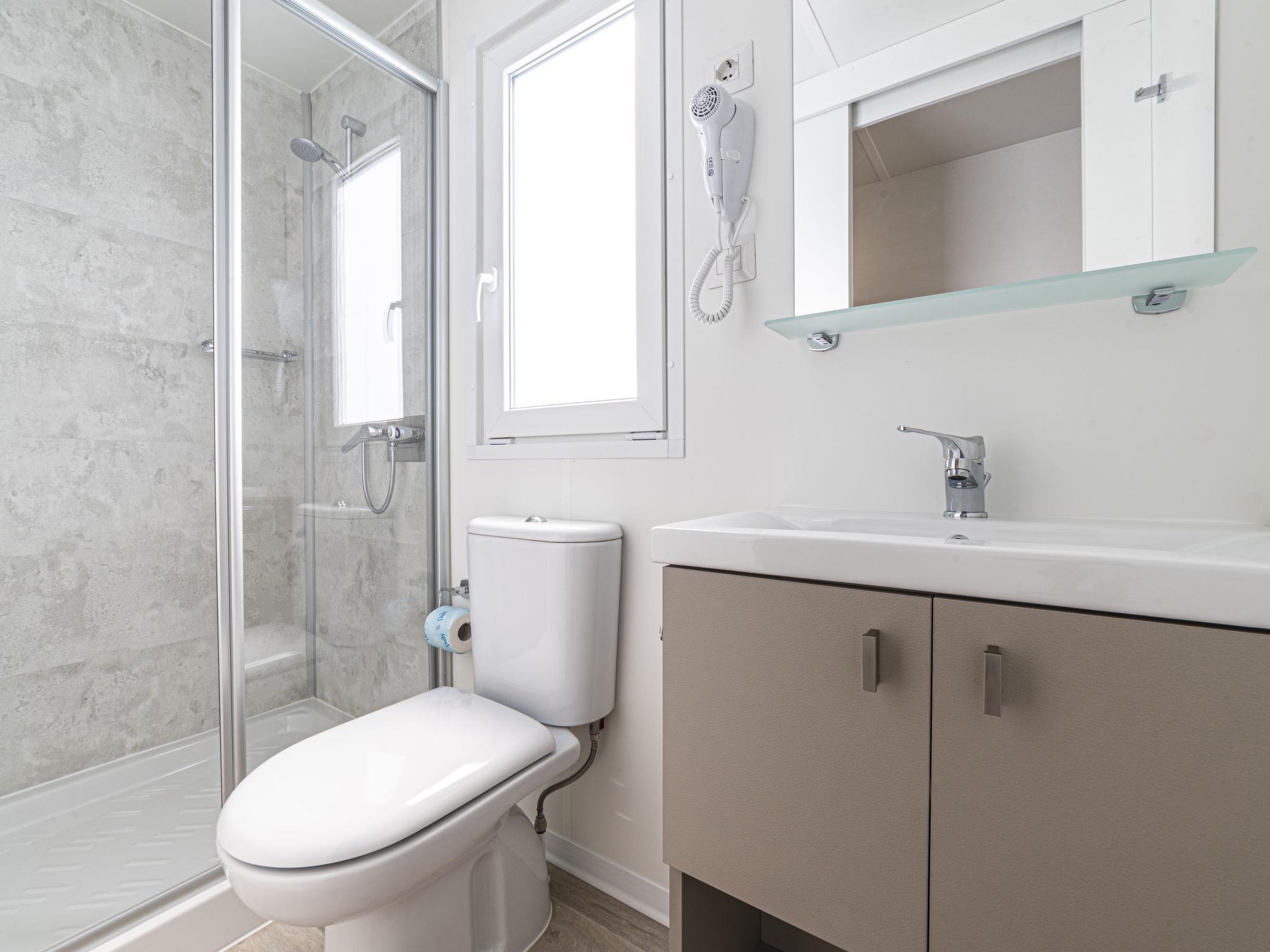 "Baia Revolution Plus", 4-Zimmer-Mobilheim 34 m2. Modern eingerichtet: Wohn-/Esszimmer mit Esstisch und TV. Ausgang zur Terrasse. 1 Zimmer mit 1 franz. Bett (140 cm), Dusche/WC. 1 Zimmer mit 2 Betten (70 cm). 1 Zimmer mit 1 x 2 Etagenbetten (70 cm). Kochnische (4 Flammen, Tiefkühler). Dusche/WC. Klimaanlage, Warmluftheizung (extra). Terrasse überdacht. Terrassenmöbel. Parkplatz (1 Auto). Bitte beachten: Nichtraucher-Unterkunft. IT023022B1P4KHX4L9