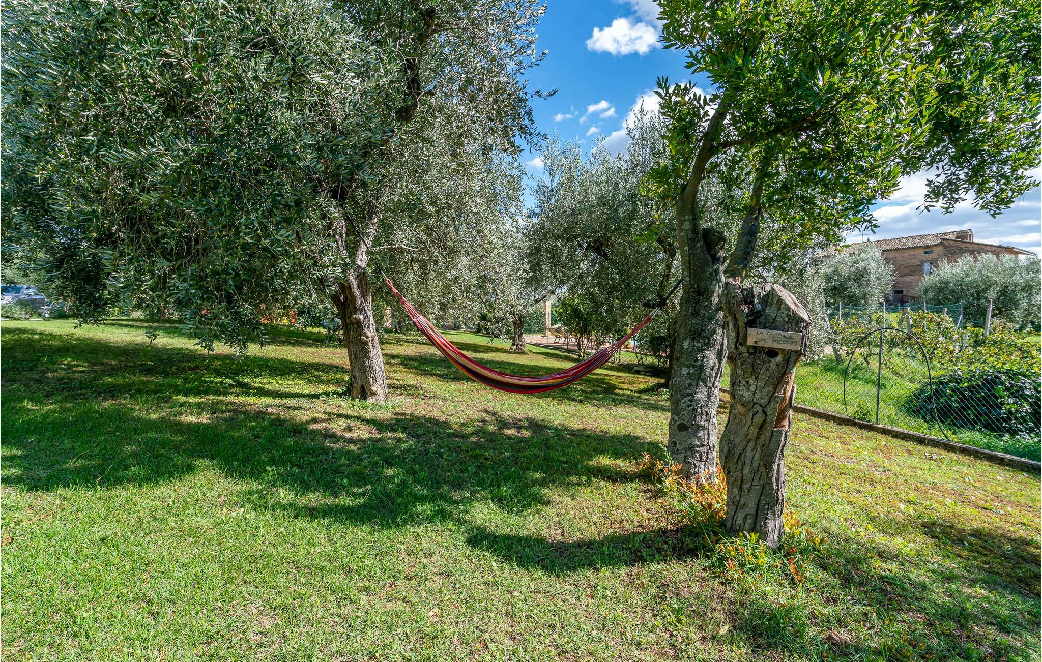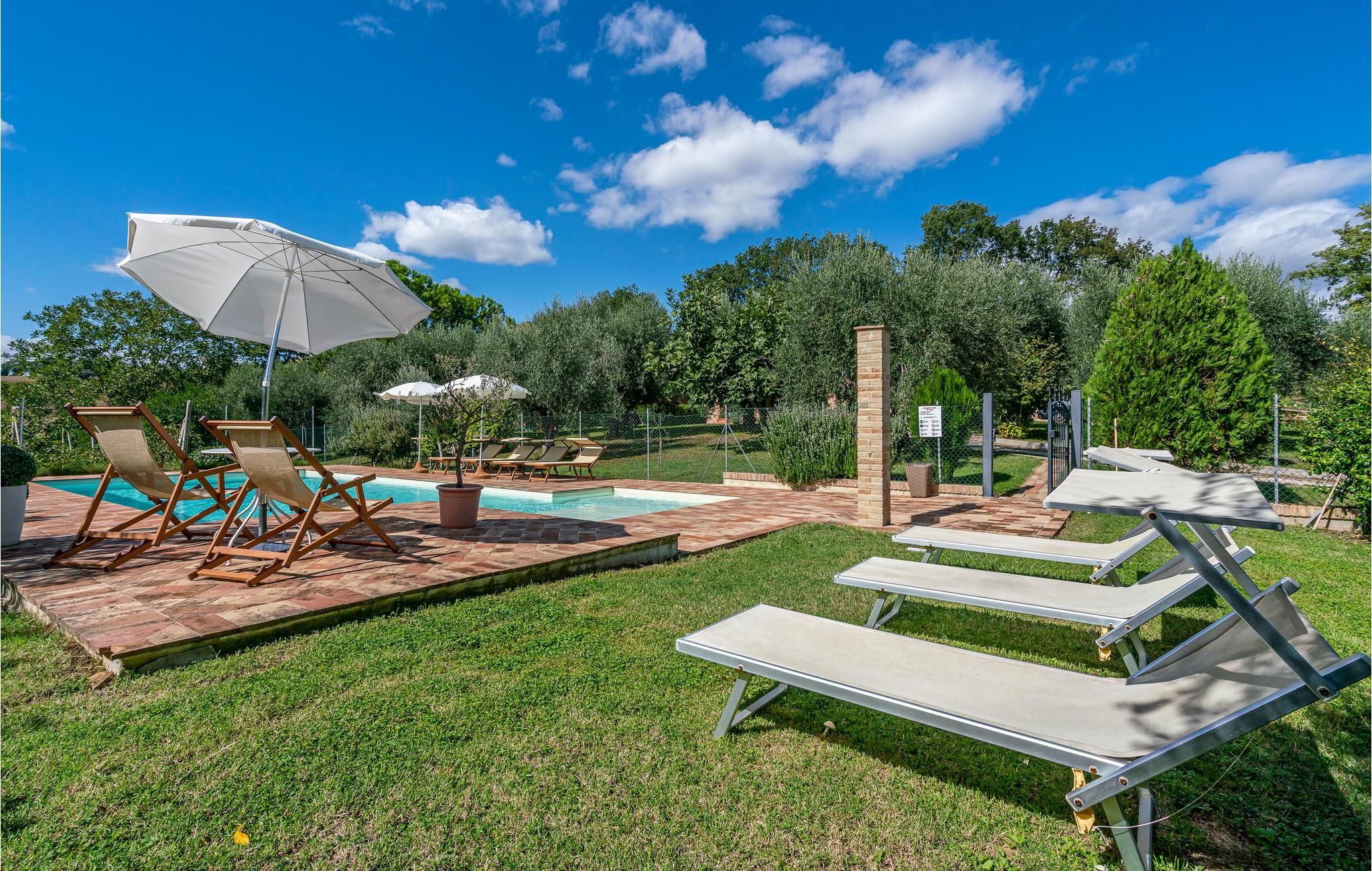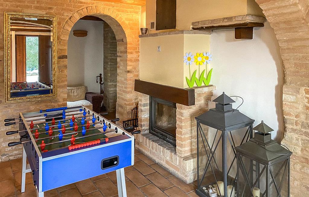 Der Außenbereich lädt mit seinem gepflegten Garten, dem privaten Pool und gemütlichen Sitzbereichen zum Verweilen ein. Genießen Sie Ihre Mahlzeiten unter freiem Himmel, entspannen Sie auf einer Sonnenliege oder entdecken Sie die Hängematten unter den jahrhundertealten Olivenbäumen. Für Unterhaltung sorgen eine Tischfußball-Ecke und viel Platz für Kinder zum Spielen.