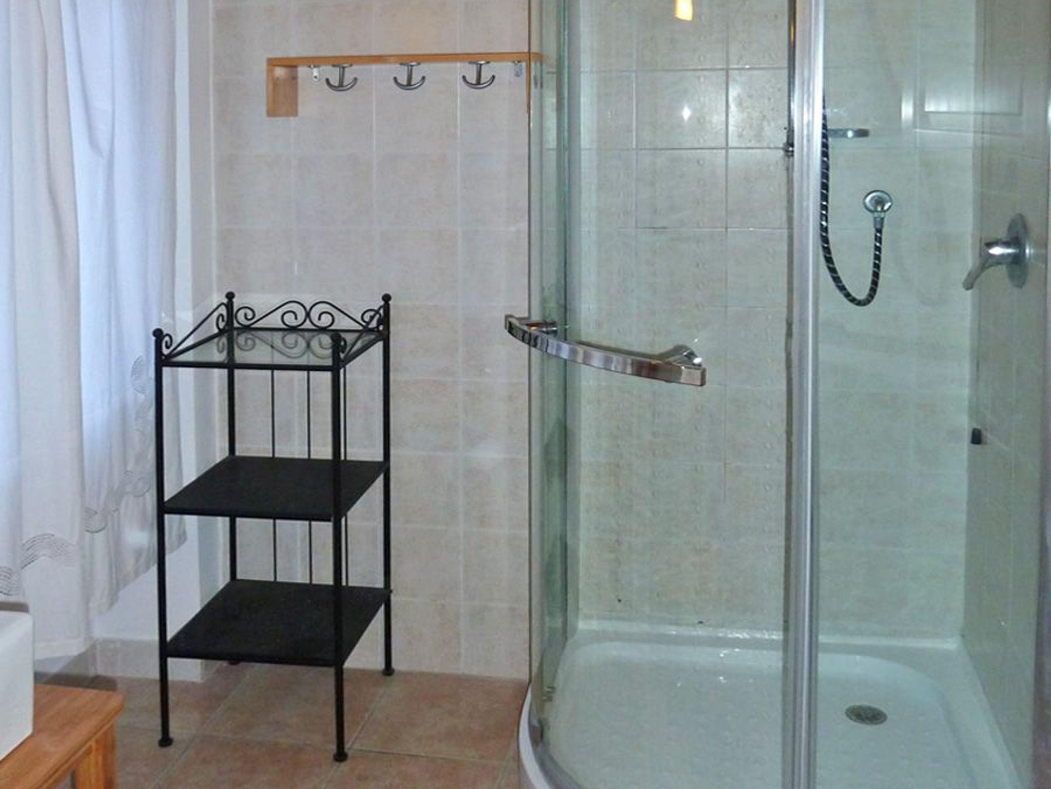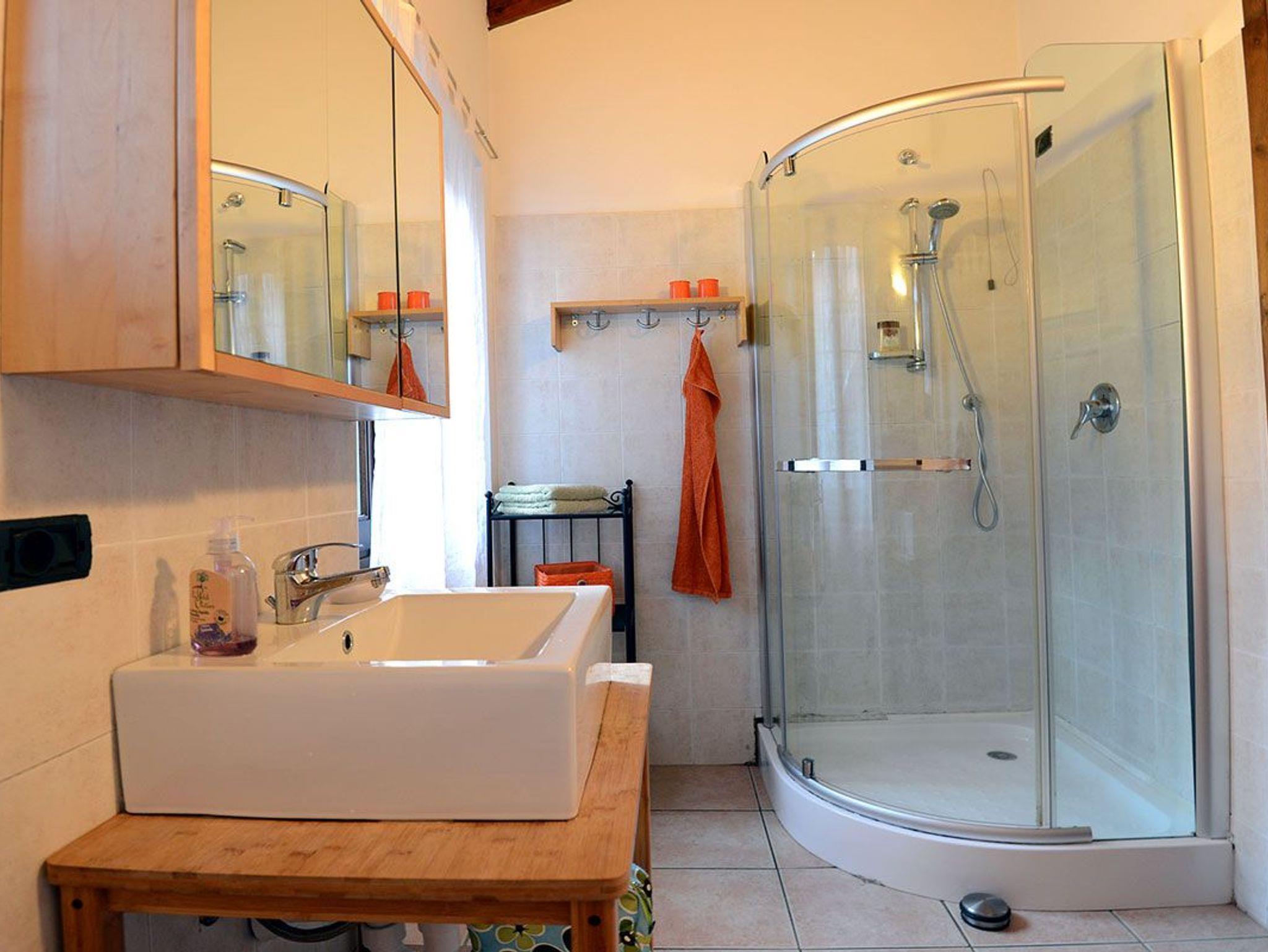 Im Obergeschoss erwarten die Gäste 2 Schlafzimmer und das helle Bad mit Dusche. Gemütlich wird es durch die Holzbalkendecken und die freundliche Möblierung.