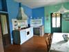 Küche mit Elektroofen, Gasherd, Kühlschrank mit Gefrierfach, Tisch, großer rustikaler Kamin aus Stein und Holz - Esszimmer mit Sofa.