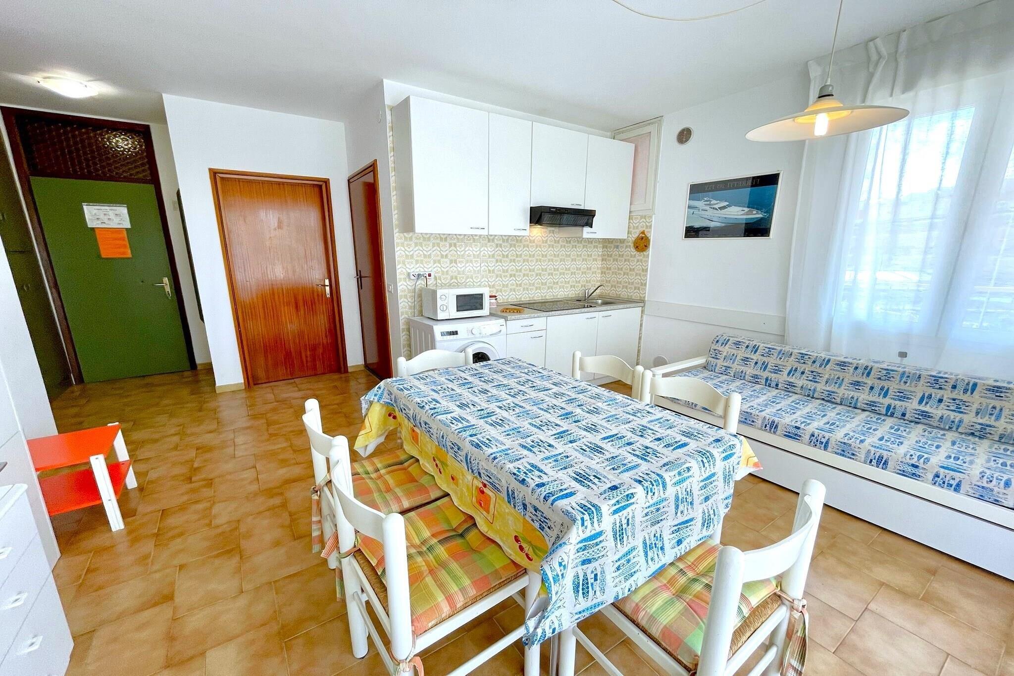 Willkommen in Ihrem gemütlichen Rückzugsort im 5. Stock, ideal gelegen im malerischen Küstenort Porto Santa Margherita. Dieses bezaubernde Apartment ist ideal für Paare, kleine Familien oder Freunde, die einen erholsamen Urlaub am Meer verbringen möchten. Das helle und luftige Wohnzimmer mit einem bequemen Doppelschlafsofa und einem Fernseher lädt zum Entspannen ein. Versammeln Sie sich am Esstisch zum Essen und für Gespräche und genießen Sie nach einem erlebnisreichen Tag die einladende Sitzecke. Die gut ausgestattete offene Küche bietet moderne Annehmlichkeiten wie Herd, Mikrowelle, Kühl-Gefrierkombination und Waschbecken – für eine bequeme Zubereitung von Mahlzeiten, egal ob Sie ein schnelles Frühstück oder ein komplettes Abendessen zubereiten möchten. Entziehen Sie sich in das gemütliche Schlafzimmer mit einem Doppelbett für erholsame Nächte und einem Einzelschlafsofa für mehr Flexibilität. Das moderne Badezimmer bietet eine erfrischende Dusche, Waschbecken, WC und Bidet für einen komfortablen Aufenthalt. Genießen Sie auf Ihrer privaten Terrasse Ihren Morgenkaffee oder genießen Sie den Sonnenuntergang am Abend mit Blick auf die wunderschöne Umgebung. Das Apartment bietet außerdem zusätzliche Annehmlichkeiten wie einen gemeinsamen Außenparkplatz und einen erfrischenden Pool, der von Juni bis September geöffnet ist und an warmen Sommertagen für Abkühlung sorgt. Dieses Apartment in Porto Santa Margherita ist nur einen kurzen Spaziergang von atemberaubenden Stränden und kristallklarem Wasser entfernt. Entdecken Sie die nahegelegenen Attraktionen, darunter charmante Cafés am Meer, lokale Geschäfte und exquisite Restaurants. Outdoor-Fans werden die Nähe zu malerischen Wanderwegen und wunderschönen Naturgebieten zu schätzen wissen. Dieses bezaubernde Apartment im 5. Stock bietet Komfort und Bequemlichkeit und ist der perfekte Ausgangspunkt für Ihr Küstenabenteuer.