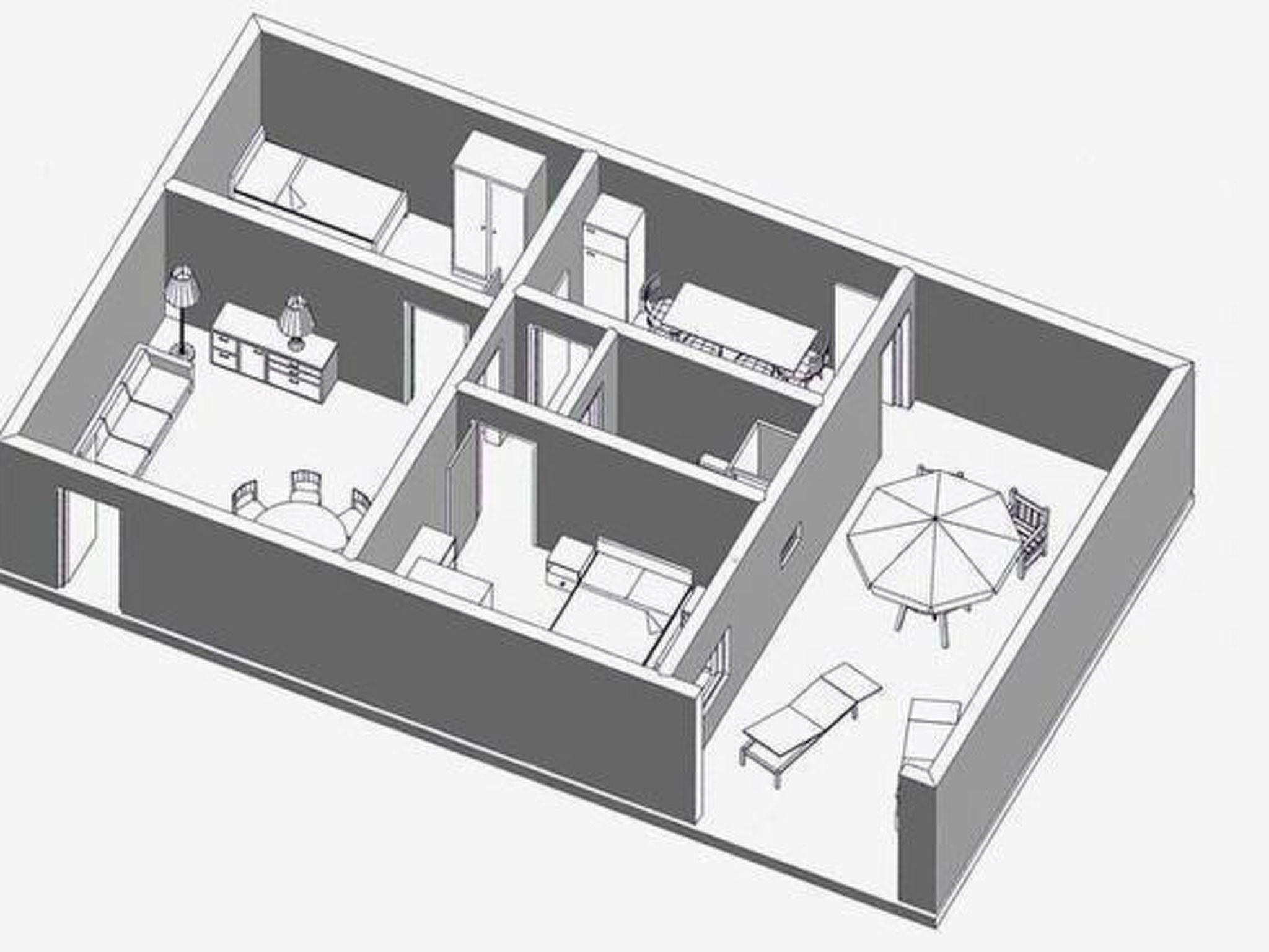 Sie verfügt über ein großes Wohnzimmer mit Sofa und Esstisch, zwei Zweibett-/Doppelzimmer, Bad, Küche und eine große möblierte Veranda zur alleinigen Nutzung.