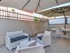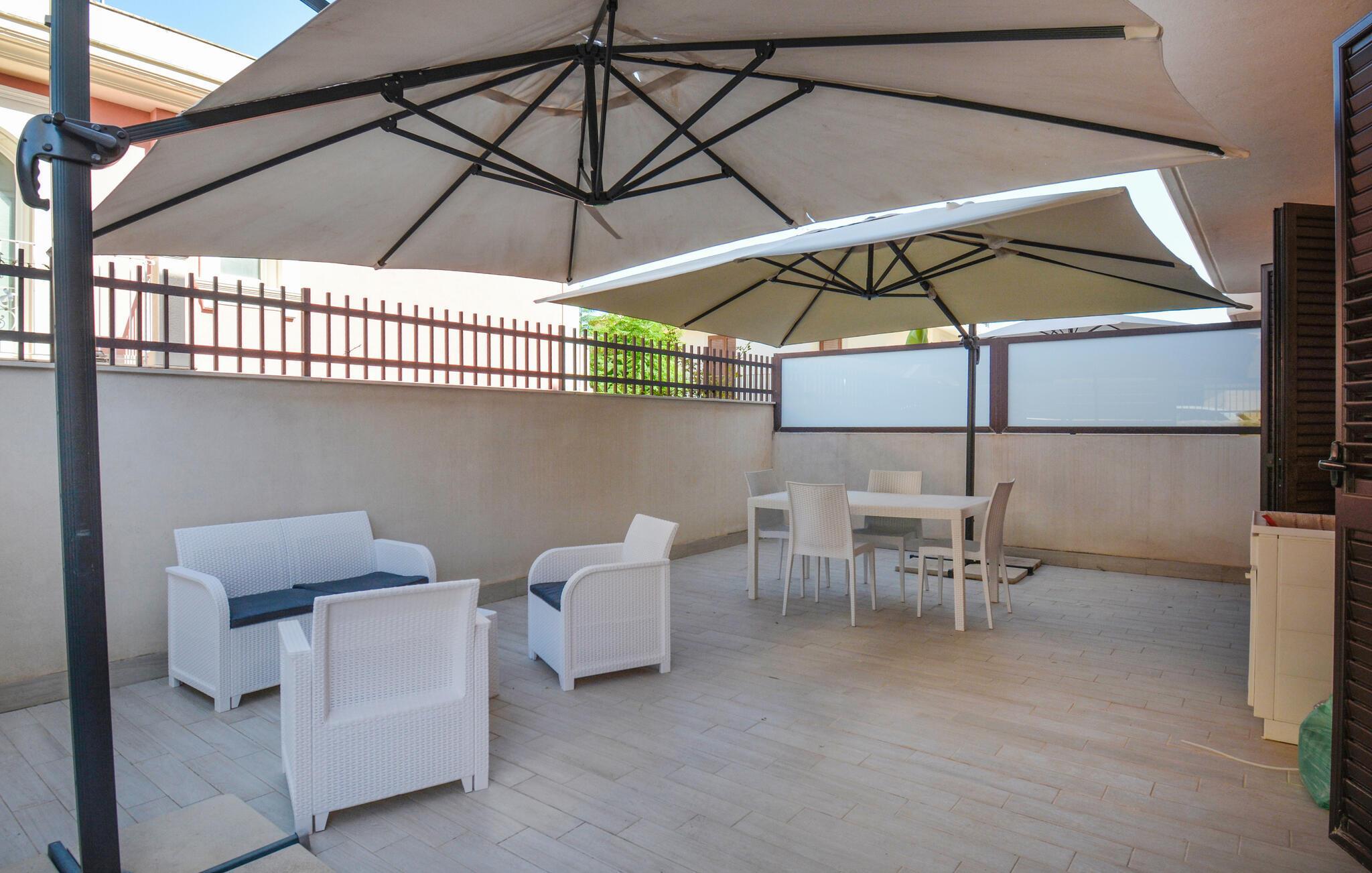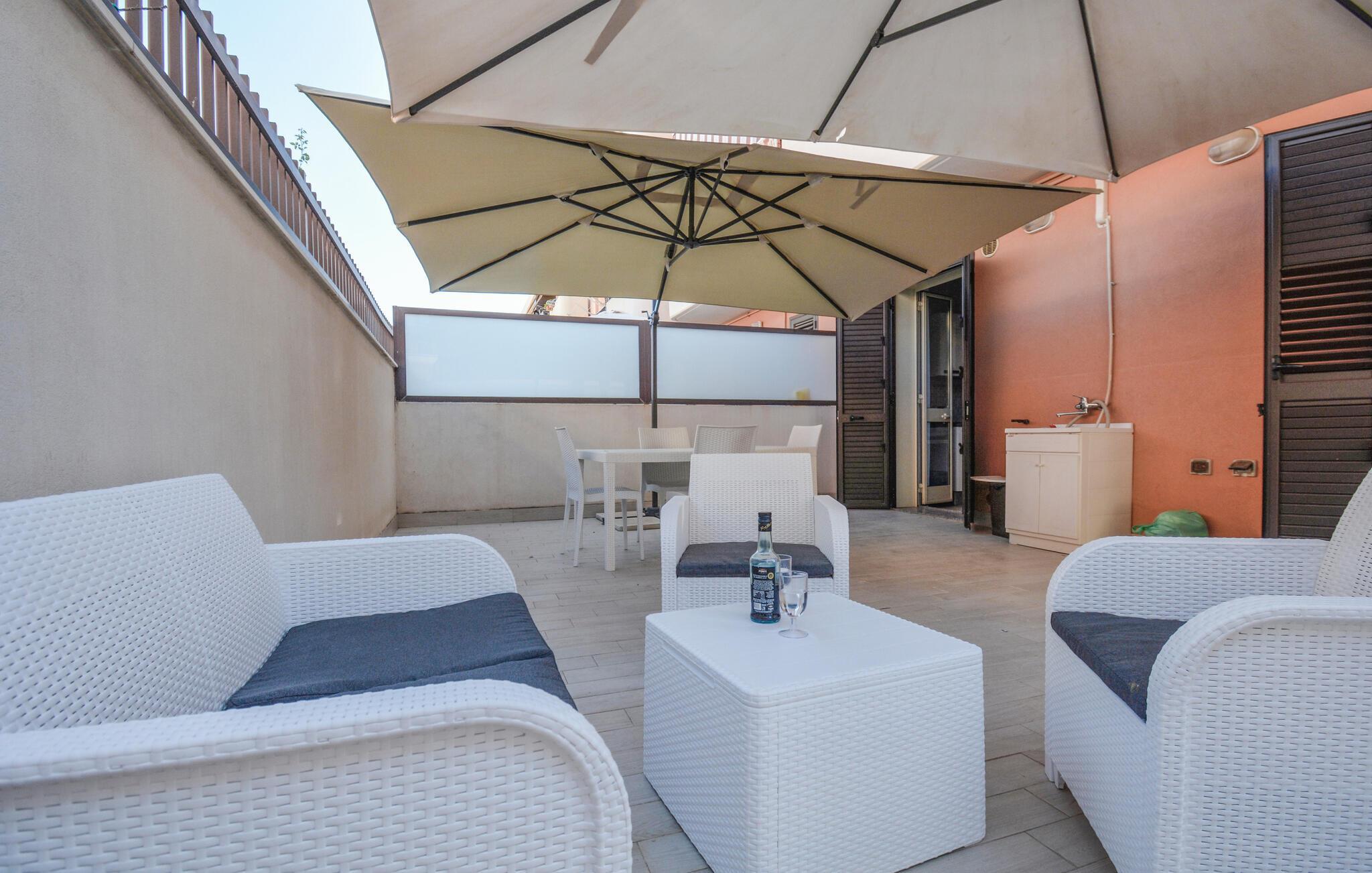 Draußen steht Ihnen eine geschützte Terrasse mit gemütlichen Sitzmöbeln und einem großen Sonnenschirm zur Verfügung. Hier können Sie entspannt frühstücken oder den Tag bei kühlen Getränken ausklingen lassen. Der Bereich ist ideal, um sich nach einem Ausflug in die trubelige Stadt zurückzuziehen.