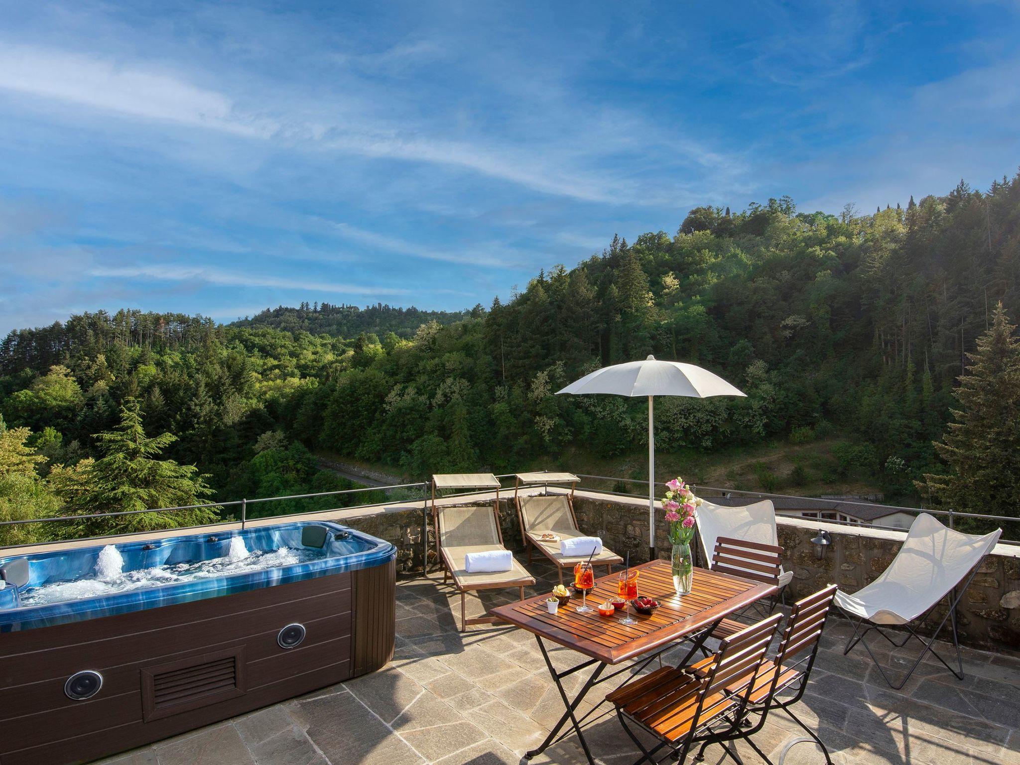 Das Schmuckstück des mittelalterlichen Turms ist zweifellos die bezaubernde Panoramaterrasse (35 qm) mit Blick auf das Casentino-Tal und die mittelalterlichen Burgen von Poppi, Romena und Porciano. Die Terrasse ist mit einem Jacuzzi, Solarium, Nachtbeleuchtung, Dachgarten, Lavastein-Grill, Trinkwasser, Esstisch und Stühlen ausgestattet. Hier kann man romantische Abendessen bei Kerzenschein unter dem Sternenhimmel veranstalten.