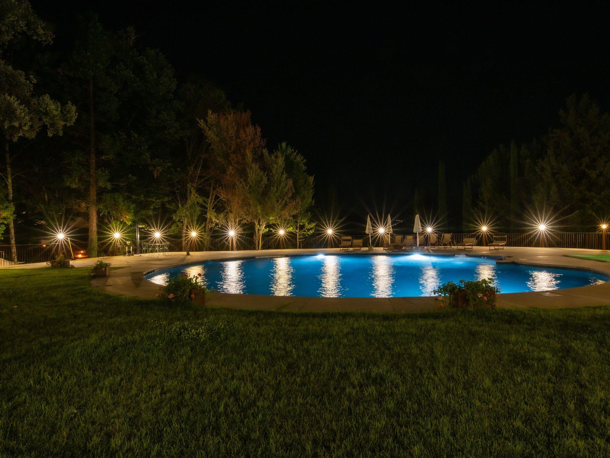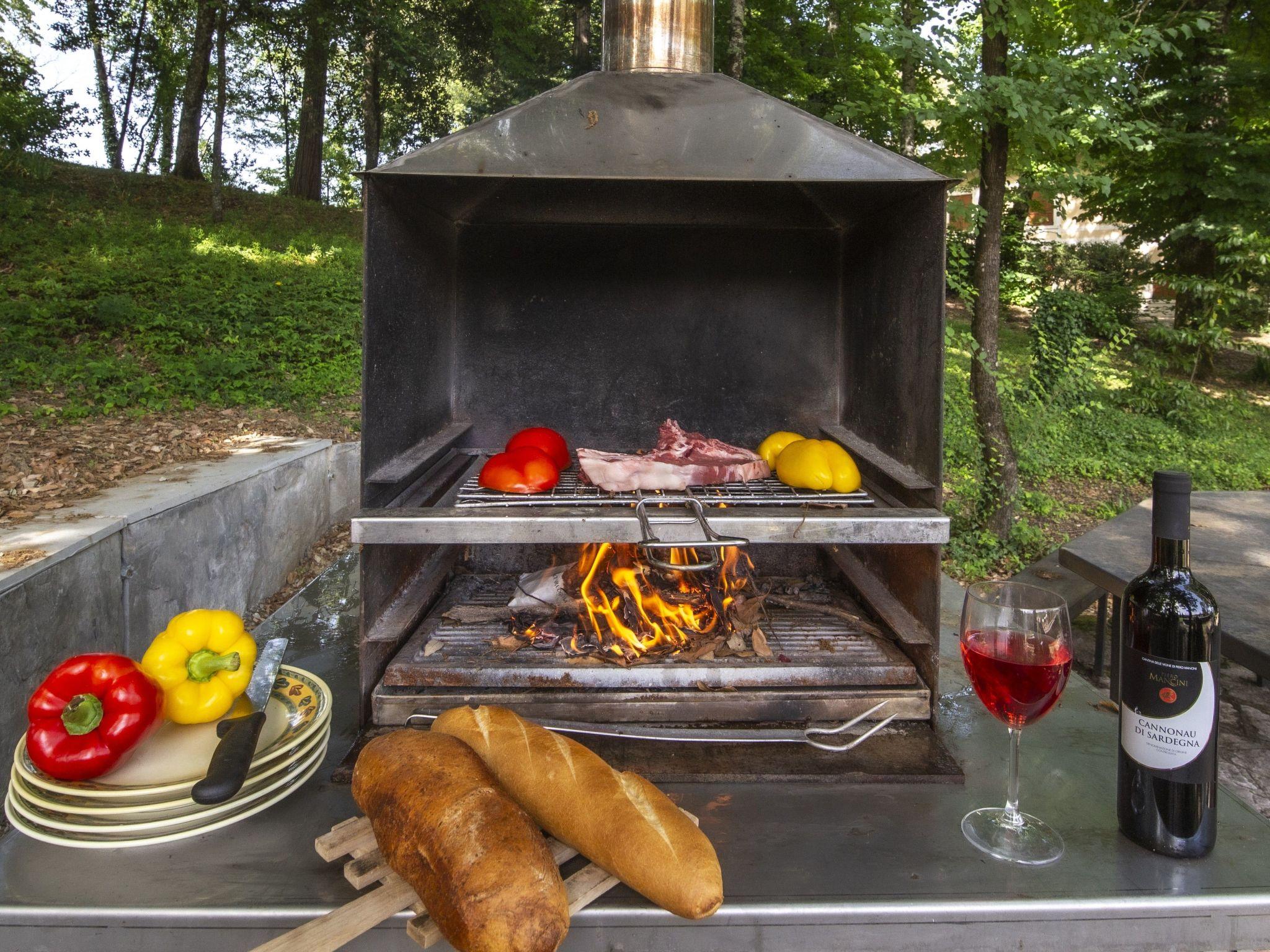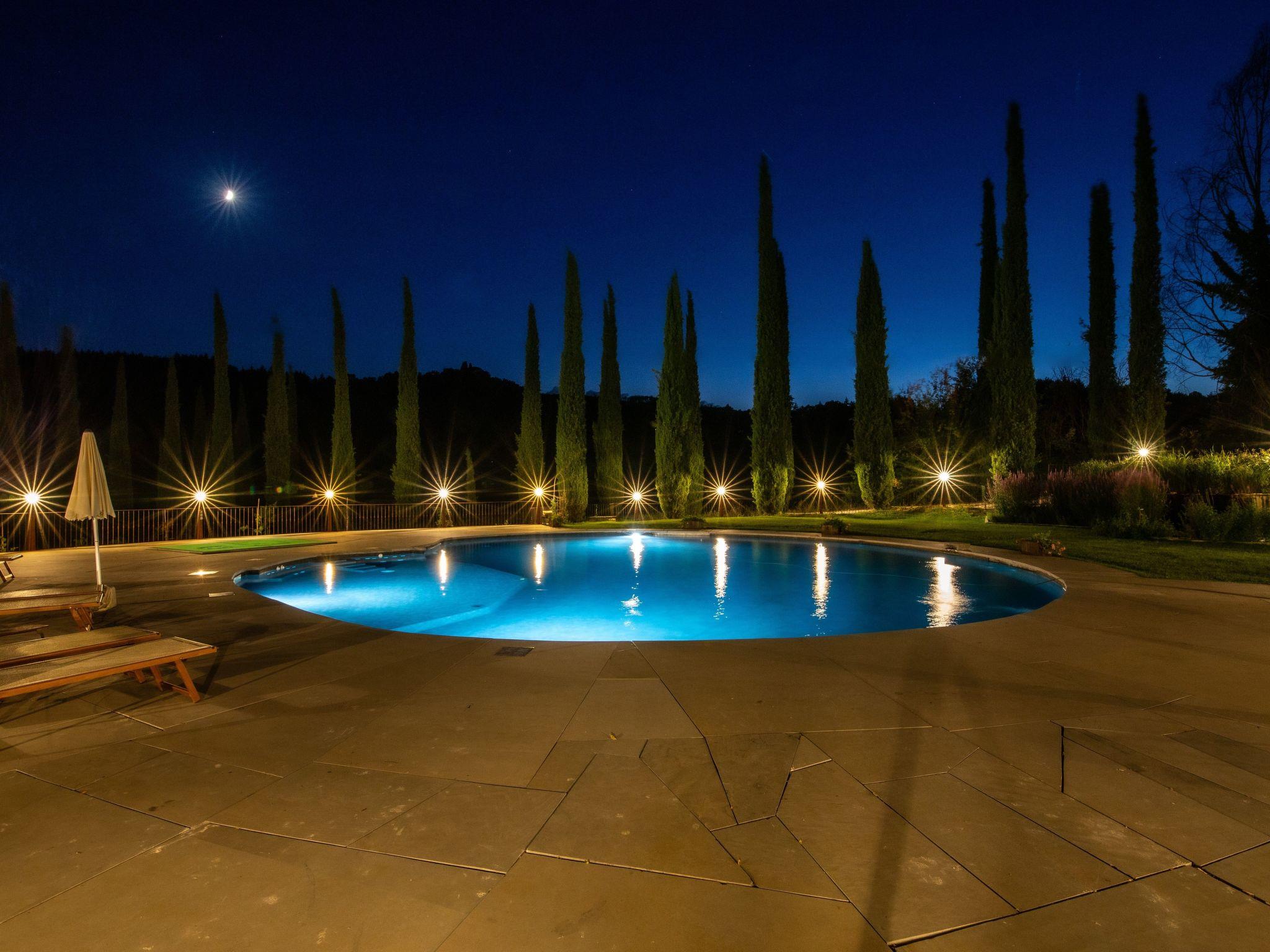 Auf der Rückseite des Hauses genießen Sie von der Terrasse mit Gartenmöbeln und Pavillon einen wunderschönen Blick auf das Tal und die mittelalterlichen Burgen Poppi, Romena und Porciano. Ca. 40 m vom Haus entfernt befindet sich ein großes, eingezäuntes, rundes Schwimmbad (Wasseroberfläche ca. 180 m², Tiefe: 1,50 m; geöffnet in der Zwischen- und Hauptsaison mit Whirlpool. Ab Saison 2024 ein Teil des großen Beckens ca. 40 m). m². Es wird beheizt, mit Nachtbeleuchtung, Spielen für Kinder und Erwachsene, mit Sonnenschirmen, Liegestühlen mit Kissen und Außendusche mit Warmwasser. Neben dem Pool befindet sich eine Sommerküche mit Tisch, gemauertem Grill, Spüle und Arbeitsplatte.