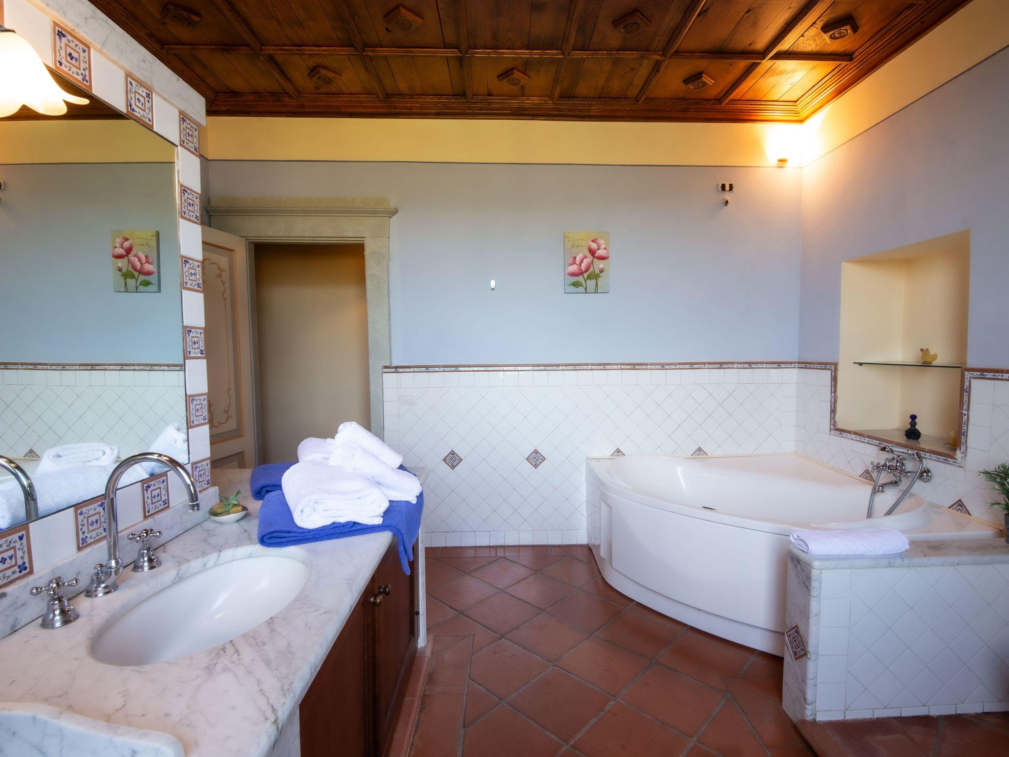 Die 250 m² große Wohnfläche verläuft über zwei Ebenen. Im Erdgeschoss befinden sich ein Kaminzimmer mit Sitzgruppe; ein großes, zum Kaminzimmer hin offenes Esszimmer mit Sitzgruppe und Ausgang ins Freie. Weiterhin steht Ihnen eine Küche mit Ausgang ins Freie zur Verfügung, die mit Backofen, Gasherd, Kühlschrank mit Gefrierfach, Spülmaschine und Kaffeemaschine ausgestattet ist. Im Erdgeschoss befindet sich auch ein Schlafzimmer mit Doppelbett und Badezimmer mit Dusche und WC. Weiterhin im Erdgeschoss gibt es ein zweites Schlafzimmer mit Doppelbett und privatem Bad mit mit Dusche und WC sowie ein Gäste-WC. Über eine Treppe gelangen Sie vom Erdgeschoss auf die erste Etage, auf der Ihnen ein zur Treppe hin offener Wohnraum mit Balkon zur Verfügung steht. In der ersten Etage stehen Ihnen zwei Schlafzimmer mit Doppelbett mit privatem Badezimmer zur Verfügung, wobei eins mit Badewanne, Dusche, zwei Waschbecken und Toilette und das andere mit Dusche, Toilette, Bidet und Waschbecken ausgestattet sind. Bei der Renovierung wurden die architektonischen Details des alten Baustils hervorgehoben. Es entstand ein gepflegtes Wohnambiente mit einer teilweise antiken Einrichtung, Tonfliesen und Decken mit Holzbalken oder Holzvertäfelung. In einem kleinen Häuschen in der Nähe des Ferienhauses befindet sich eine Waschmaschine. Des Weiteren stehen Ihnen ein Fernseher und ein DVD-Player zur Verfügung.