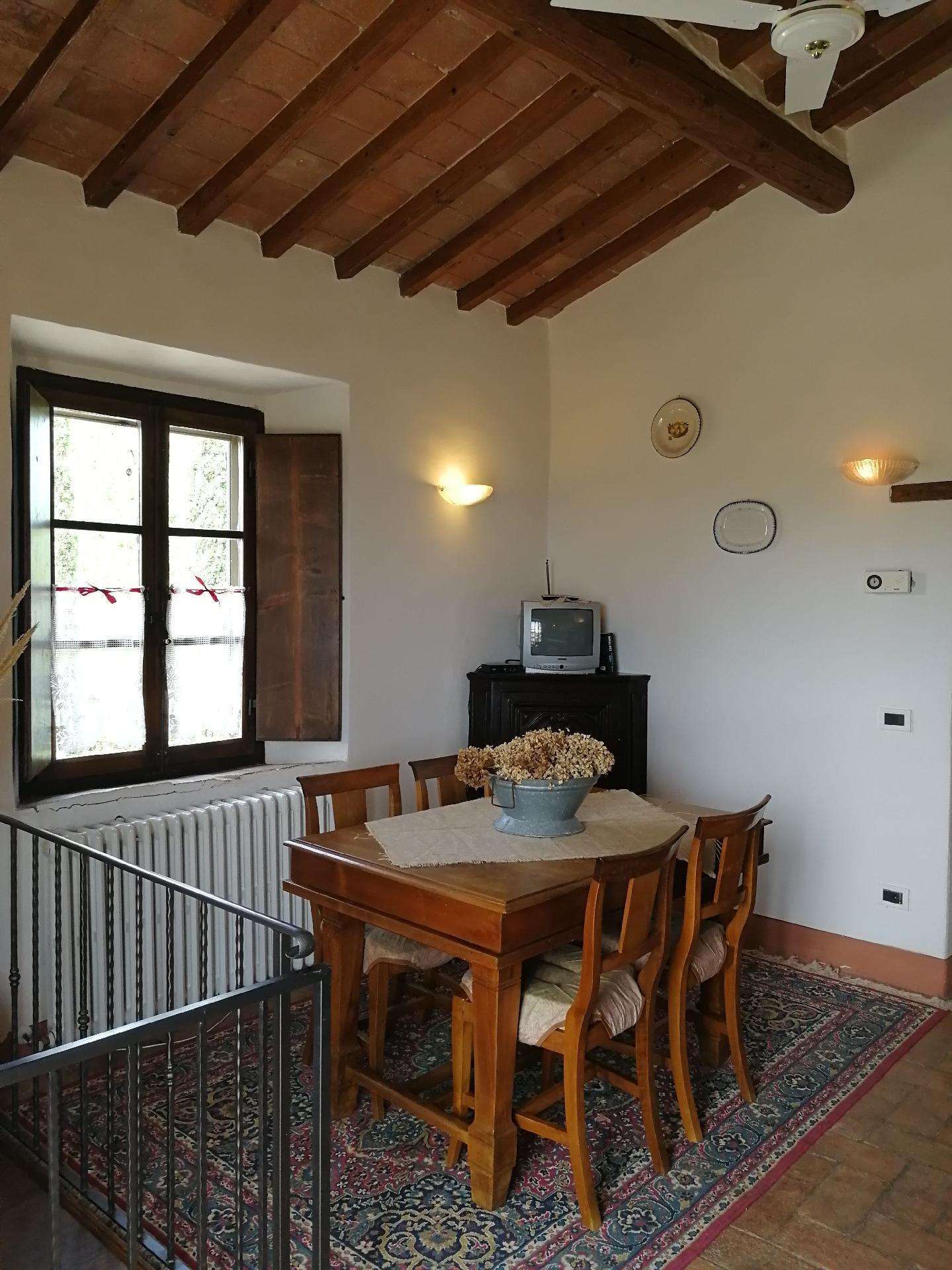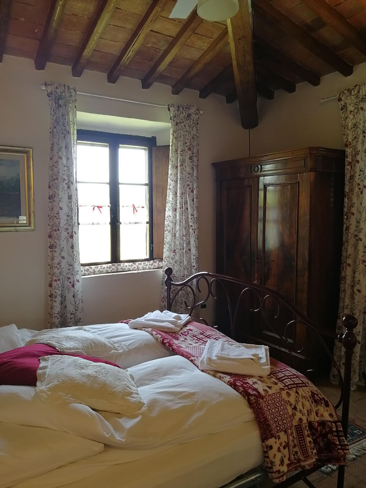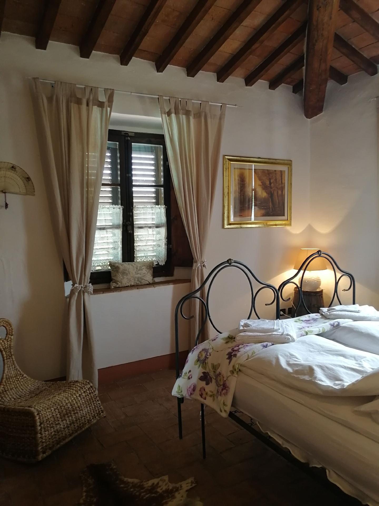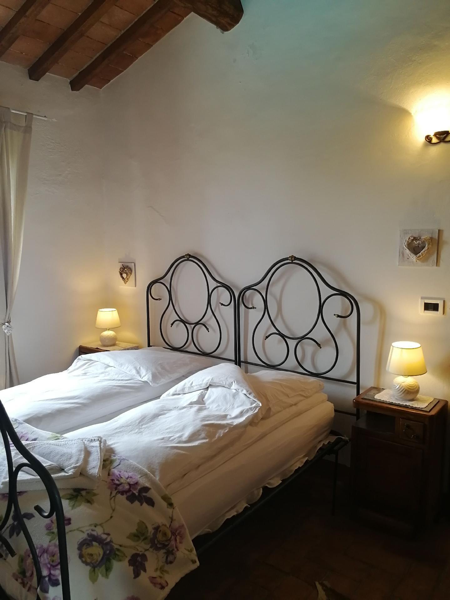 Das Ferienhaus bietet ein einzigartiges Ambiente mit geschmackvoller Einrichtung und drei Schlafzimmern auf zwei Etagen. Im Erdgeschoss gibt es einen großen Wohnbereich mit einem Schlafsofa für zwei Personen (1,60 x 1,90 m), ein geräumiges Schlafzimmer mit einem Doppelbett, eine kleine, aber voll ausgestattete Küche und ein Badezimmer mit Dusche. Von diesem Bad aus kann man durch eine Glastür direkt in den Garten gehen. Eine Holztreppe führt in das Obergeschoss, das auch über eine Außentreppe zu erreichen ist. Im Wohnbereich im Obergeschoss ist der große originale Kamin der Mittelpunkt an kalten Tagen und sorgt für Wärme und Behaglichkeit. In der geräumigen, voll gemauerten Küche finden Sie alles, was Sie zum Kochen brauchen, sowie eine Sammlung antiker Töpfe und Pfannen, die liebevoll aus verschiedenen Bauernhöfen und Second-Hand-Läden zusammengestellt wurden. Außerdem gibt es zwei gemütliche und helle Schlafzimmer mit je einem Doppelbett und ein Badezimmer mit Badewanne, von dessen Fenster aus Sie den Monte Cetona bewundern können. Ein weiteres kleines Bad mit Dusche befindet sich auf der Loggia; da es über eine Außentreppe direkt zu erreichen ist, wird es gerne zum Duschen nach dem Baden genutzt. Es stehen insgesamt acht Betten zur Verfügung; die Doppelbetten sind jeweils 1,60 x 1,90 m groß. Auf Wunsch kann der Eigentümer im Schlafzimmer im Erdgeschoss ein Babybett aufstellen. Das Haus bietet einen kostenlosen Internetzugang.