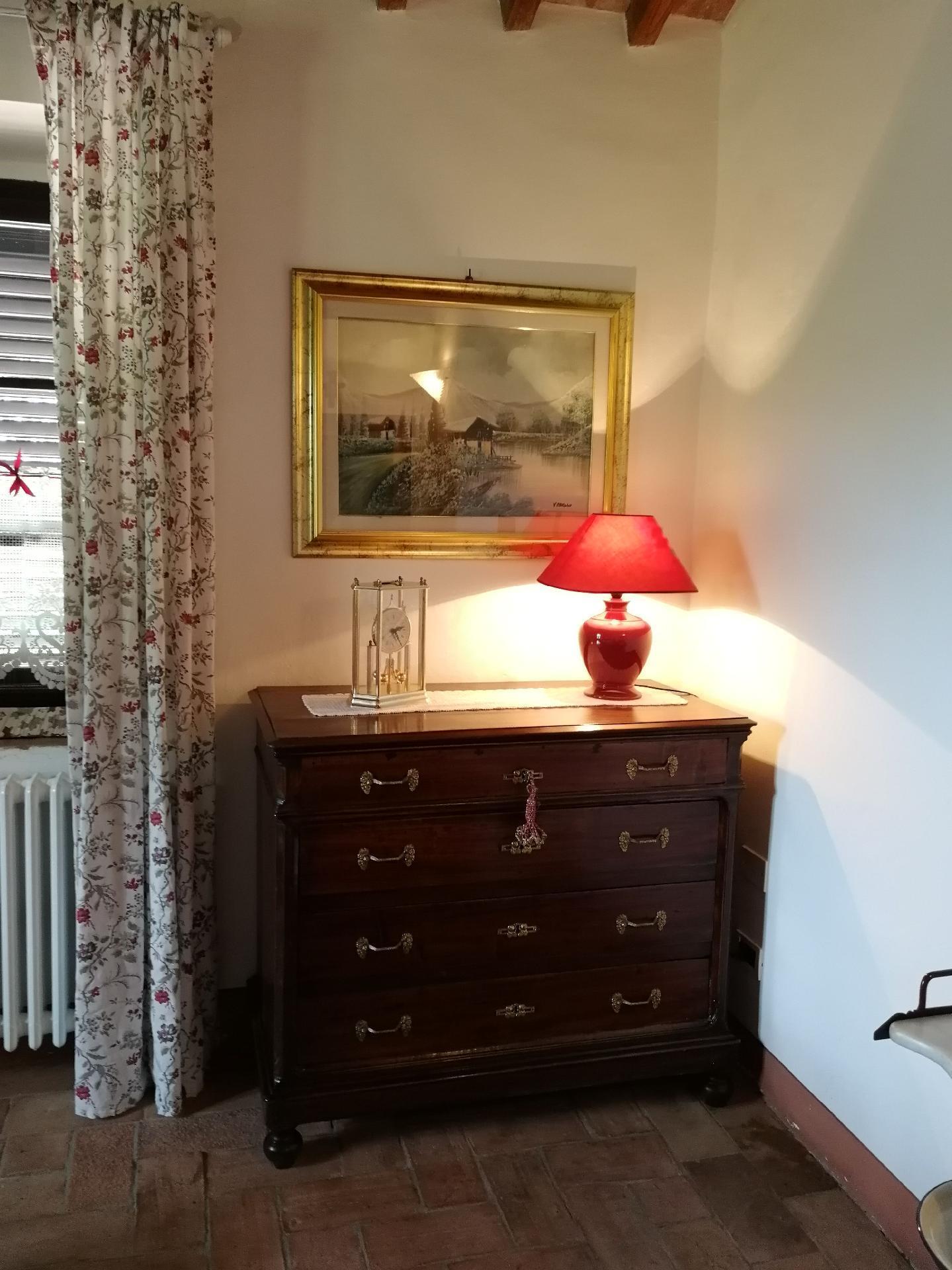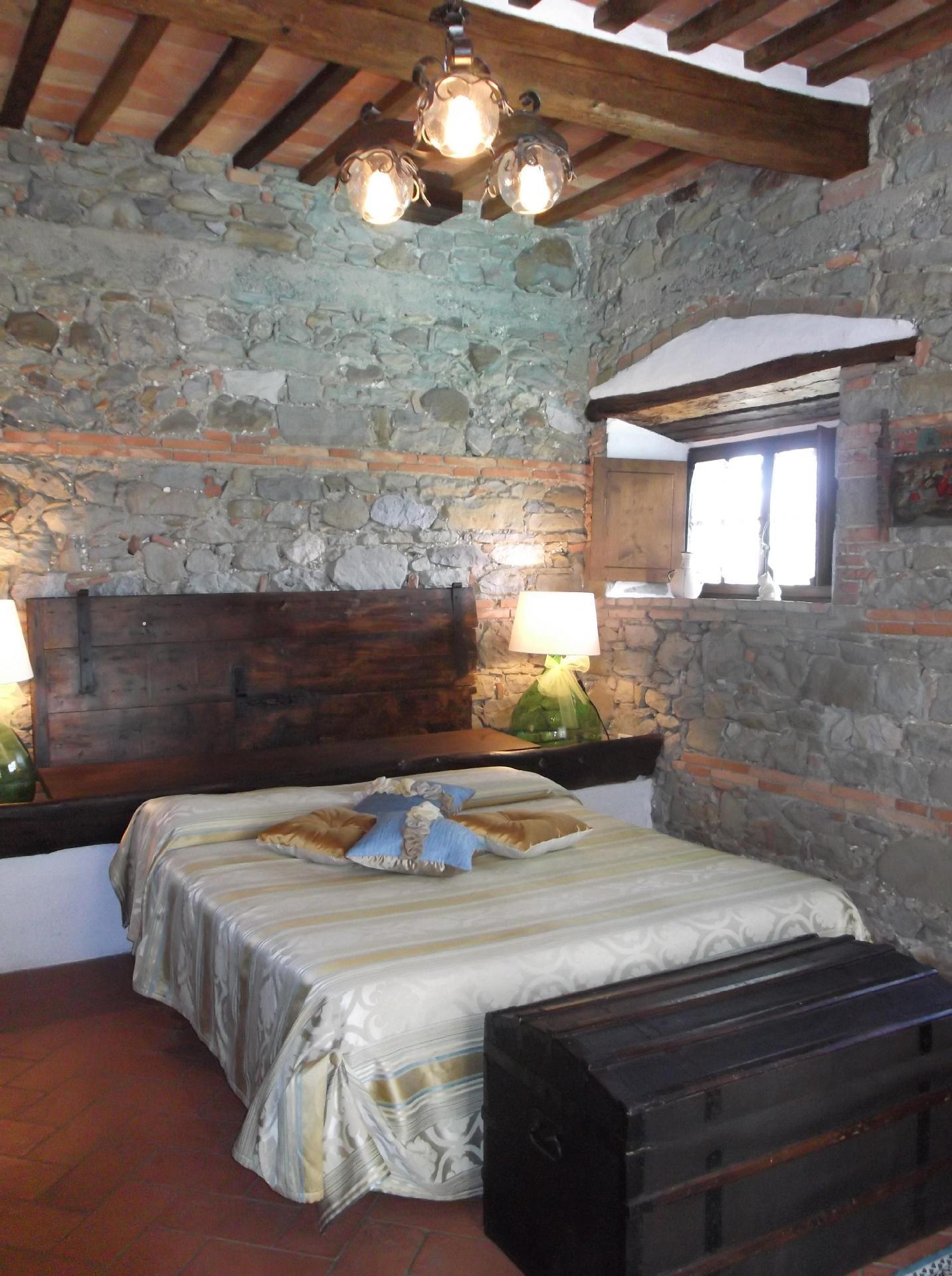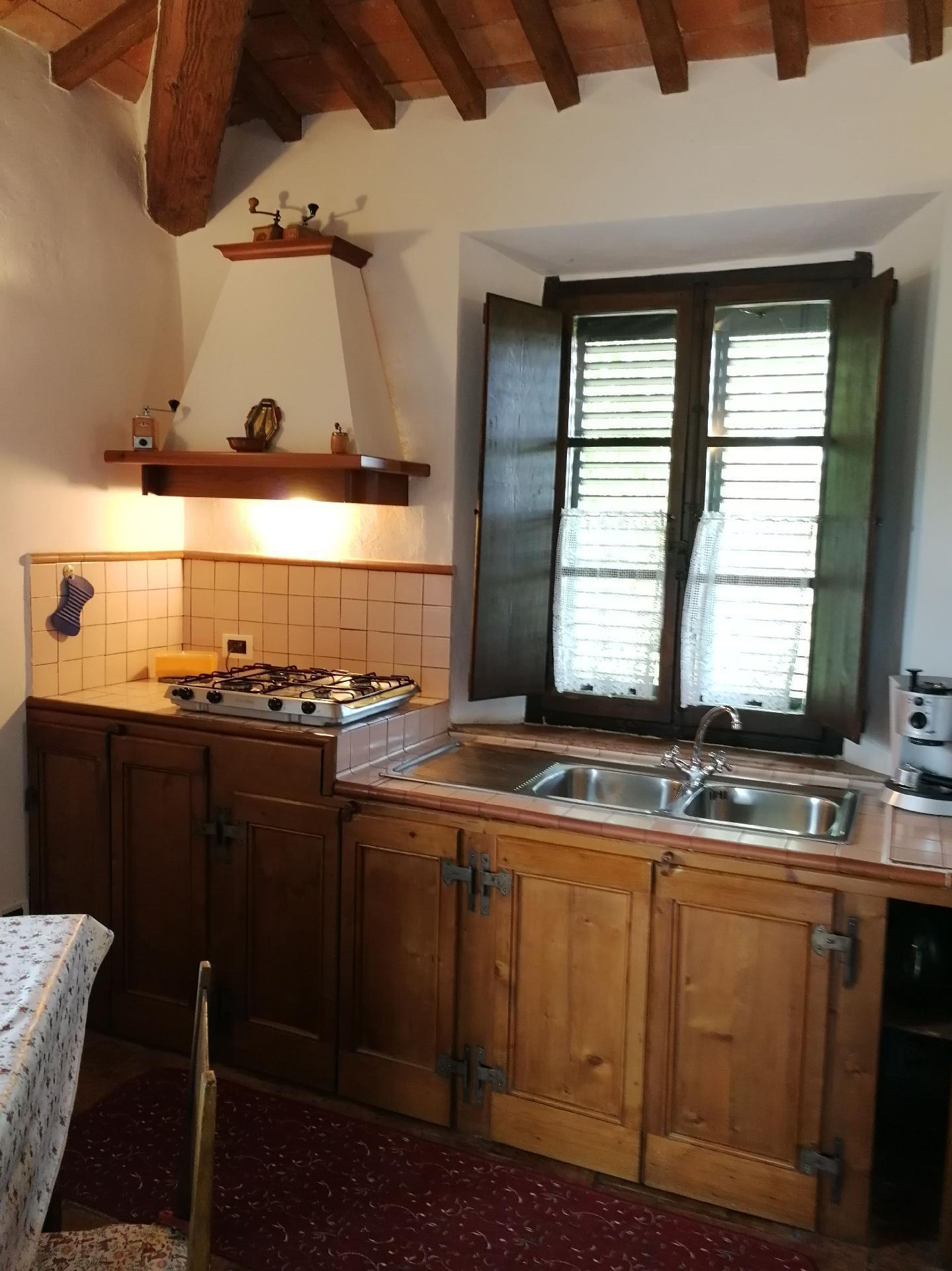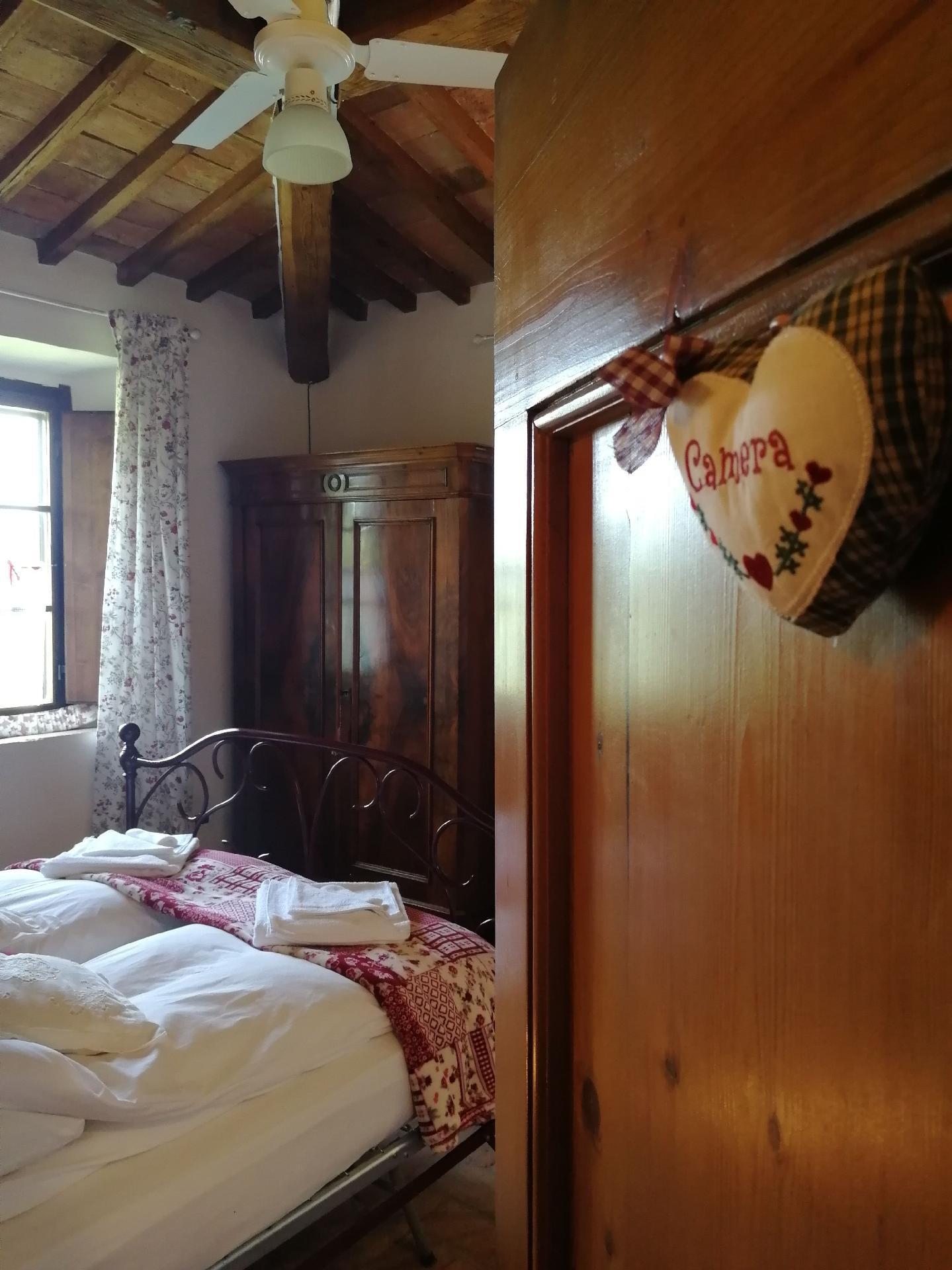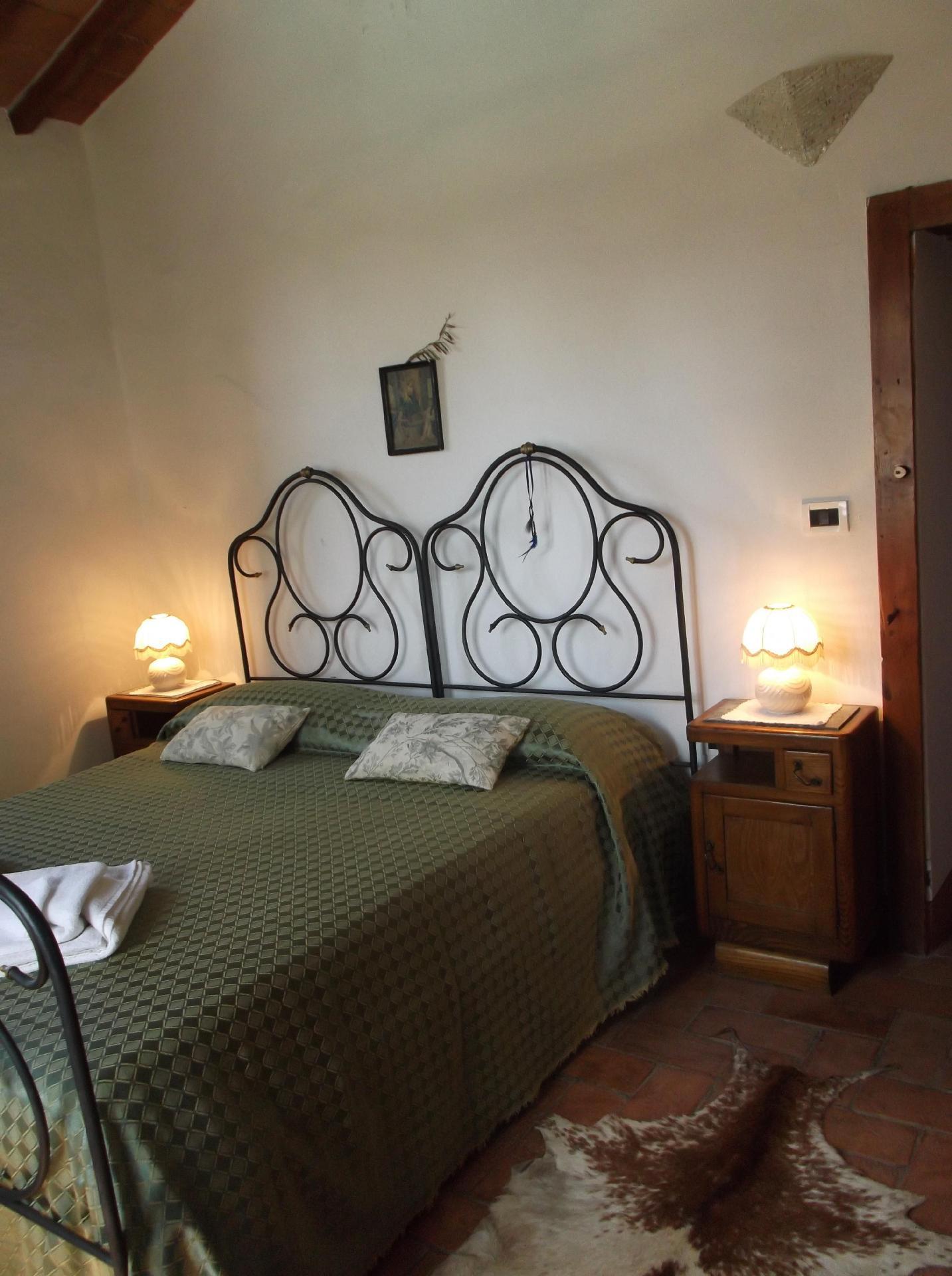 Das Ferienhaus bietet ein einzigartiges Ambiente mit geschmackvoller Einrichtung und drei Schlafzimmern auf zwei Etagen. Im Erdgeschoss gibt es einen großen Wohnbereich mit einem Schlafsofa für zwei Personen (1,60 x 1,90 m), ein geräumiges Schlafzimmer mit einem Doppelbett, eine kleine, aber voll ausgestattete Küche und ein Badezimmer mit Dusche. Von diesem Bad aus kann man durch eine Glastür direkt in den Garten gehen. Eine Holztreppe führt in das Obergeschoss, das auch über eine Außentreppe zu erreichen ist. Im Wohnbereich im Obergeschoss ist der große originale Kamin der Mittelpunkt an kalten Tagen und sorgt für Wärme und Behaglichkeit. In der geräumigen, voll gemauerten Küche finden Sie alles, was Sie zum Kochen brauchen, sowie eine Sammlung antiker Töpfe und Pfannen, die liebevoll aus verschiedenen Bauernhöfen und Second-Hand-Läden zusammengestellt wurden. Außerdem gibt es zwei gemütliche und helle Schlafzimmer mit je einem Doppelbett und ein Badezimmer mit Badewanne, von dessen Fenster aus Sie den Monte Cetona bewundern können. Ein weiteres kleines Bad mit Dusche befindet sich auf der Loggia; da es über eine Außentreppe direkt zu erreichen ist, wird es gerne zum Duschen nach dem Baden genutzt. Es stehen insgesamt acht Betten zur Verfügung; die Doppelbetten sind jeweils 1,60 x 1,90 m groß. Auf Wunsch kann der Eigentümer im Schlafzimmer im Erdgeschoss ein Babybett aufstellen. Das Haus bietet einen kostenlosen Internetzugang.
