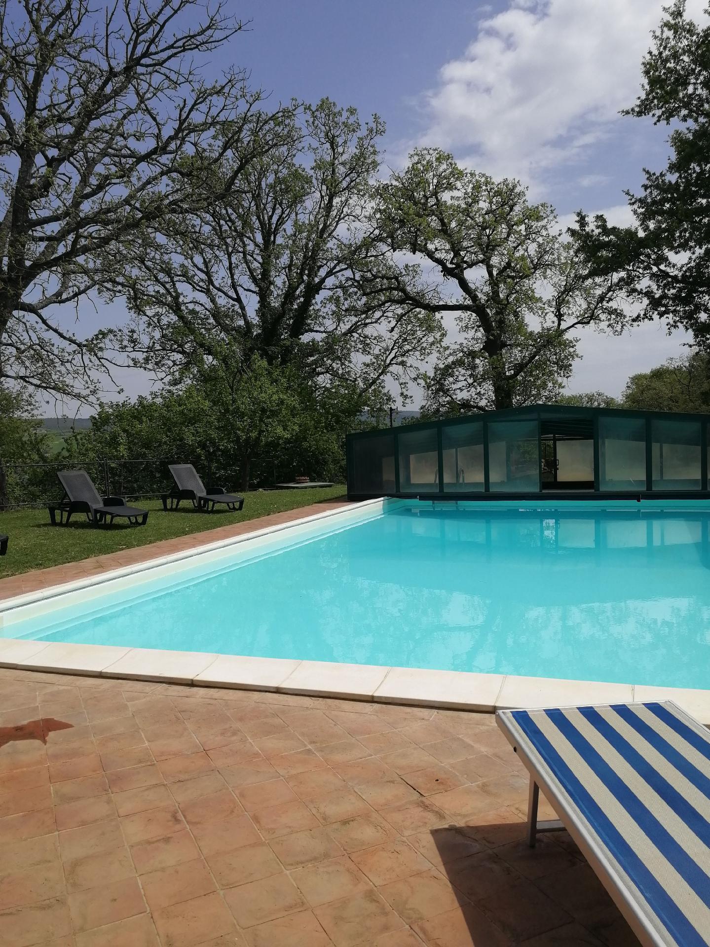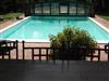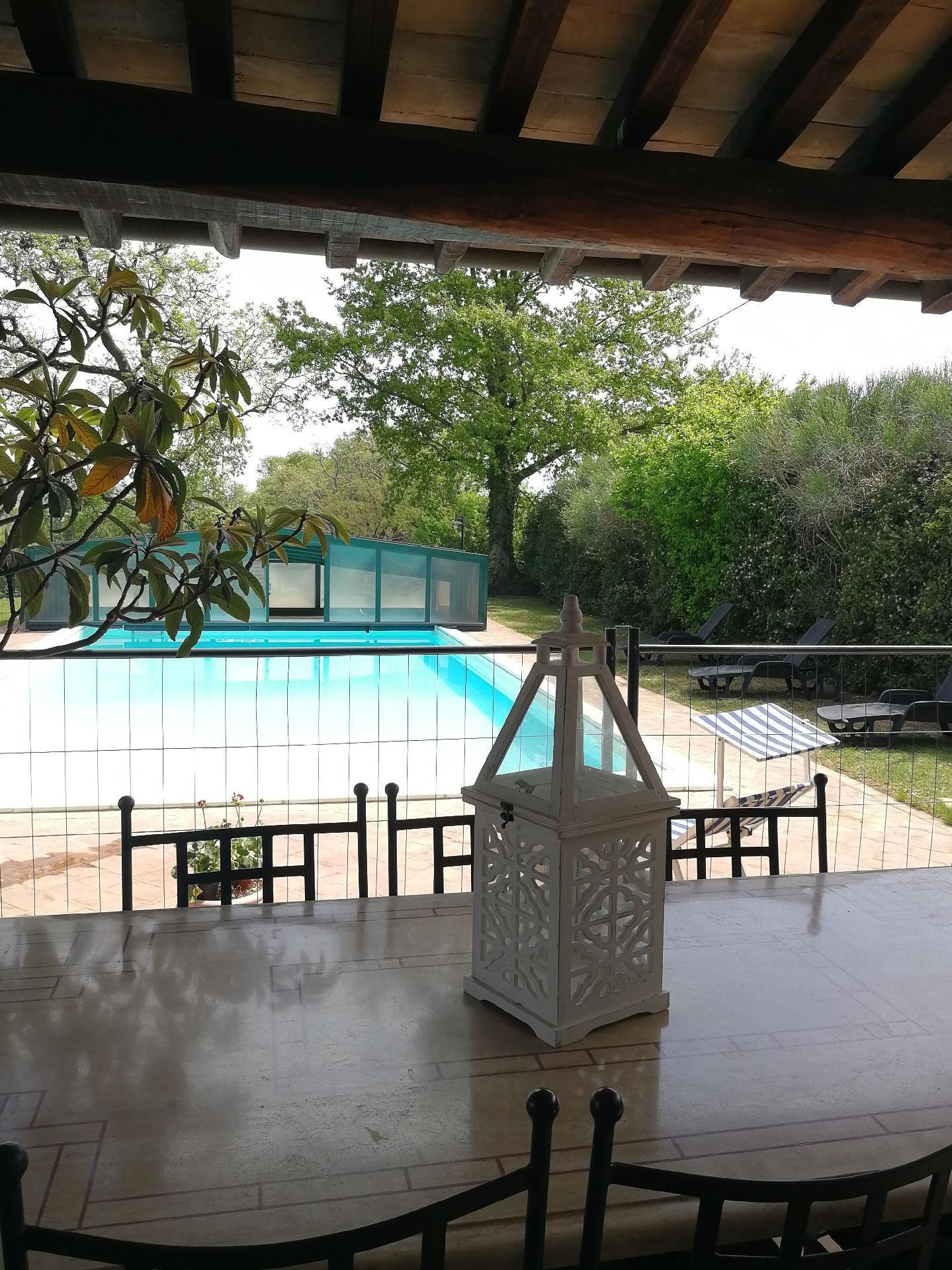Im großen Garten lädt ein wunderschöner Swimmingpool mit Panoramablick zum Schwimmen und Entspannen ein. Er wird ausschließlich von den Gästen dieses Hauses genutzt und jeden Morgen gereinigt. Der Pool ist 6 x 12 m groß und die Wassertiefe variiert von 1,50 bis 2,20 m. Sie können auch Grillabende im Freien genießen; es gibt sogar einen Holzbackofen. Auf der großen Veranda mit Steintisch, die von einer Pergola überdacht ist, kann man jederzeit im Freien essen. Zum Anwesen gehört ein fünf Hektar großer Olivenhain, von dem ein Hektar um das Haus herum eingezäunt ist, so dass auch Ihre vierbeinigen Freunde genügend Freiraum haben. Das Anwesen verfügt über vier überdachte Parkplätze. Das familiengeführte Anwesen wurde mit traditionellen Materialien renoviert und vermittelt daher eine besondere Gastfreundschaft. Es bietet den idealen Rahmen für einen erholsamen Urlaub an der frischen Luft und bei gutem Essen.