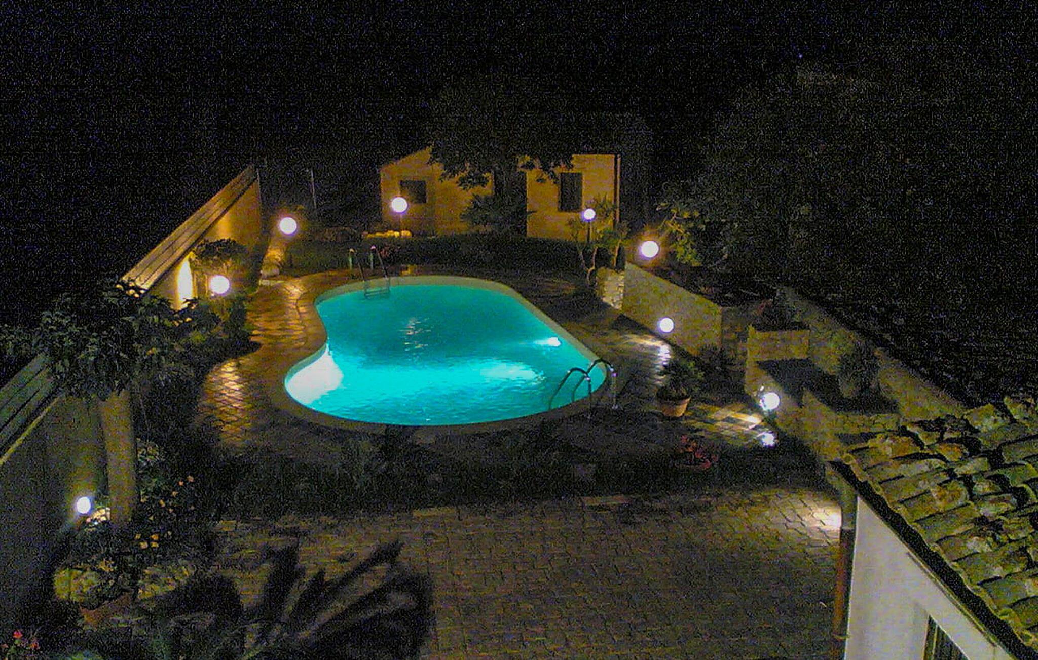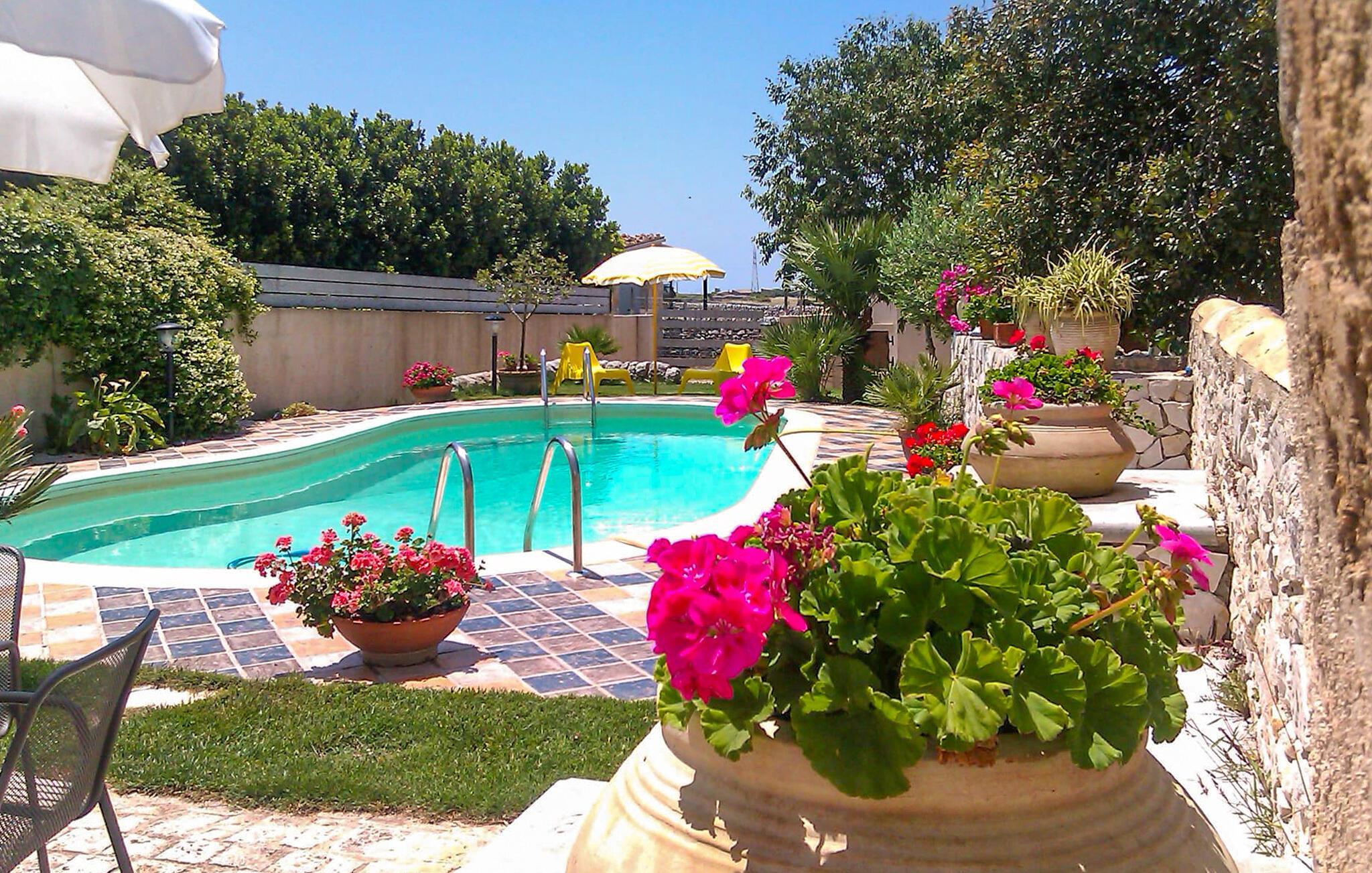 Im romantischen Außenbereich erwartet Sie ein herrlicher Pool, der an heißen Tagen Erfrischung bietet und dank seiner stimmungsvollen Beleuchtung auch nachts zum Baden einlädt. Tanken Sie Sonne auf der Liege, widmen Sie sich auf den bequemen Hängematten einer amüsanten Lektüre von Andrea Camilleri, entfachen Sie den Grill und plaudern Sie bei Wein und Kerzenschein in die Nacht hinein.