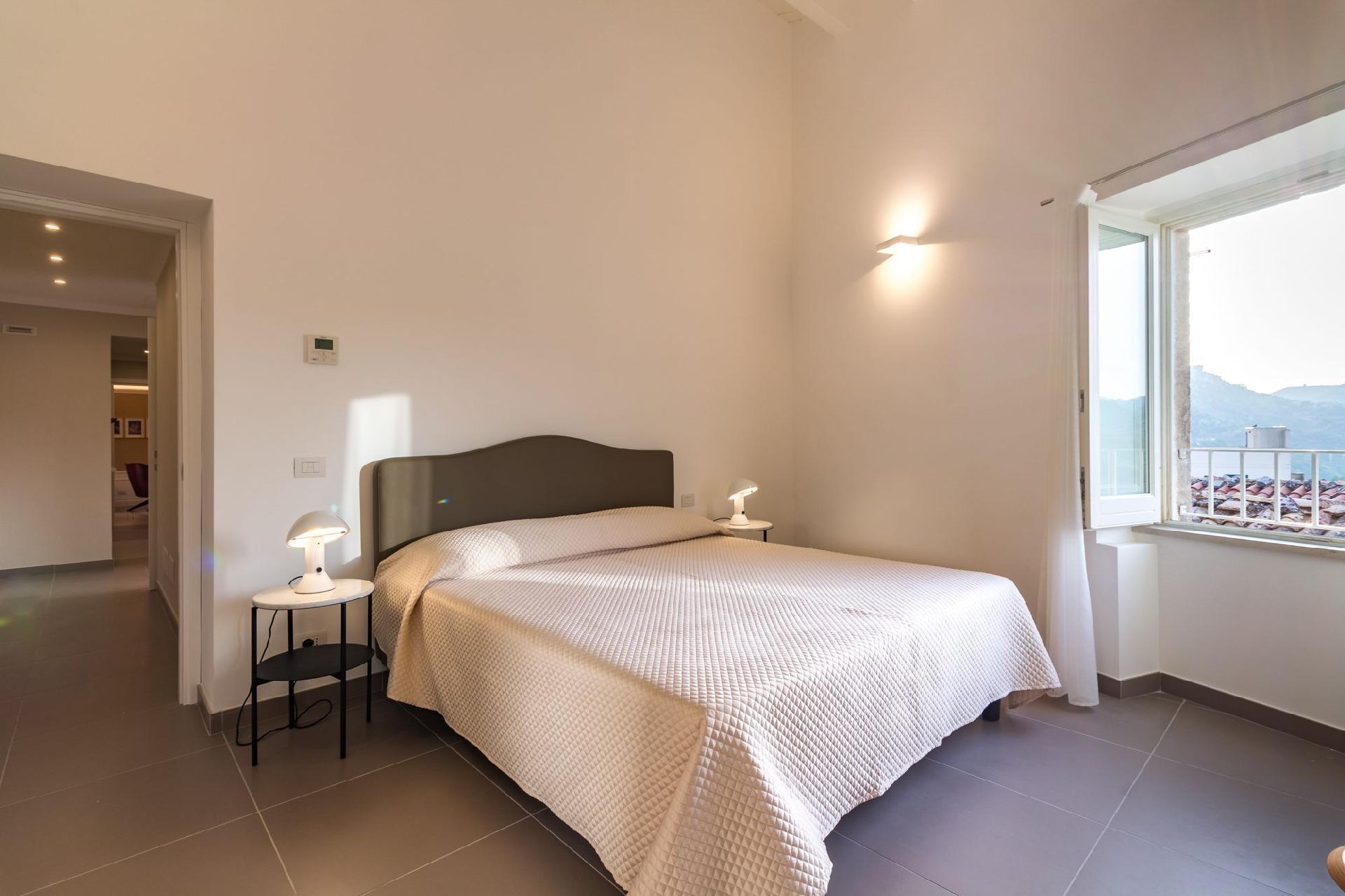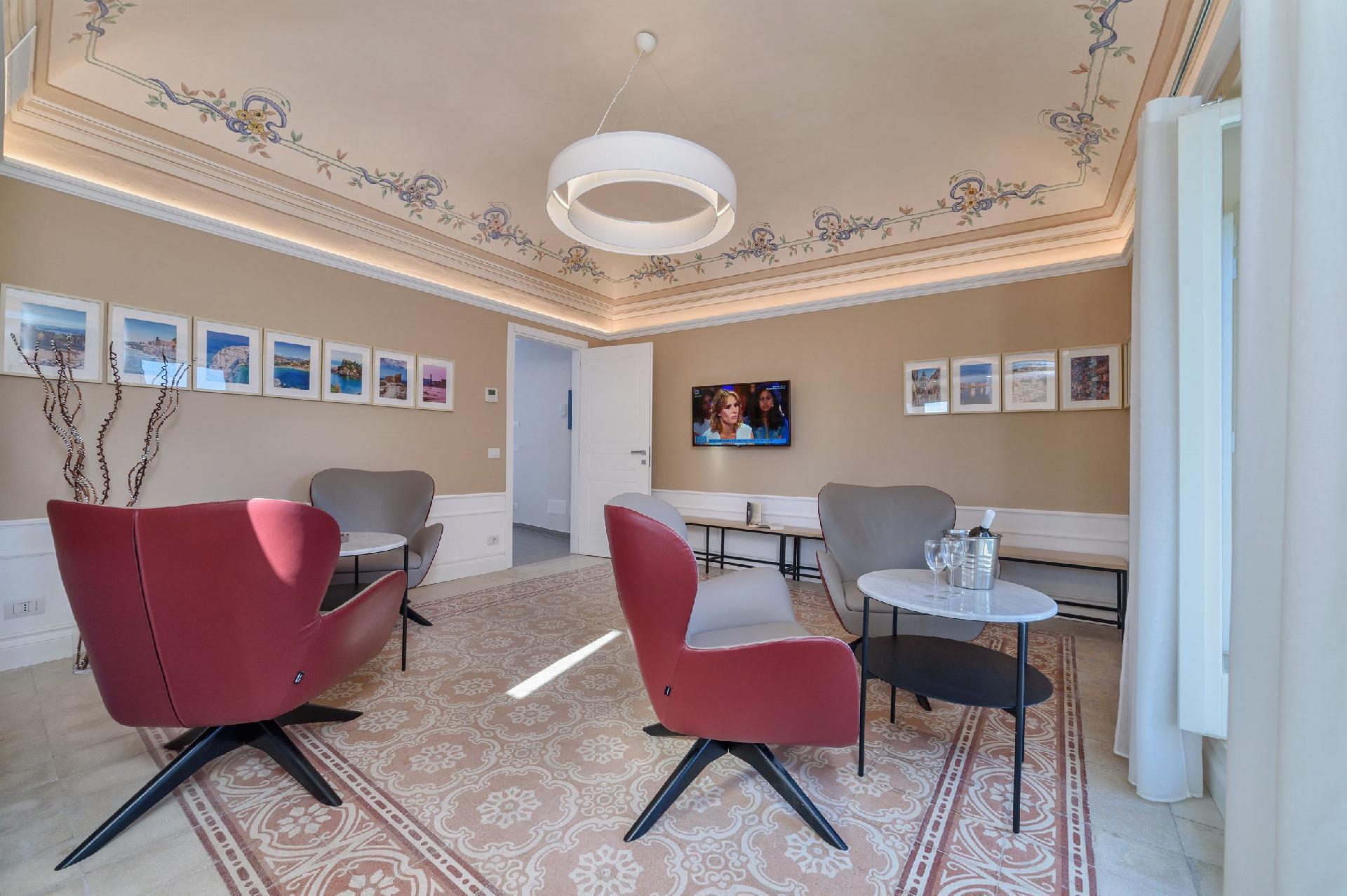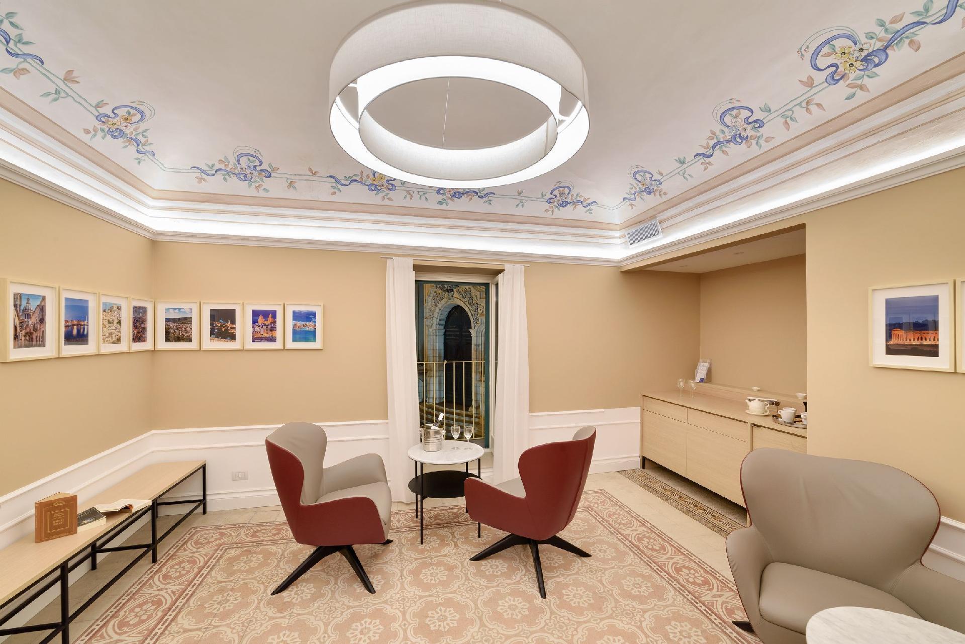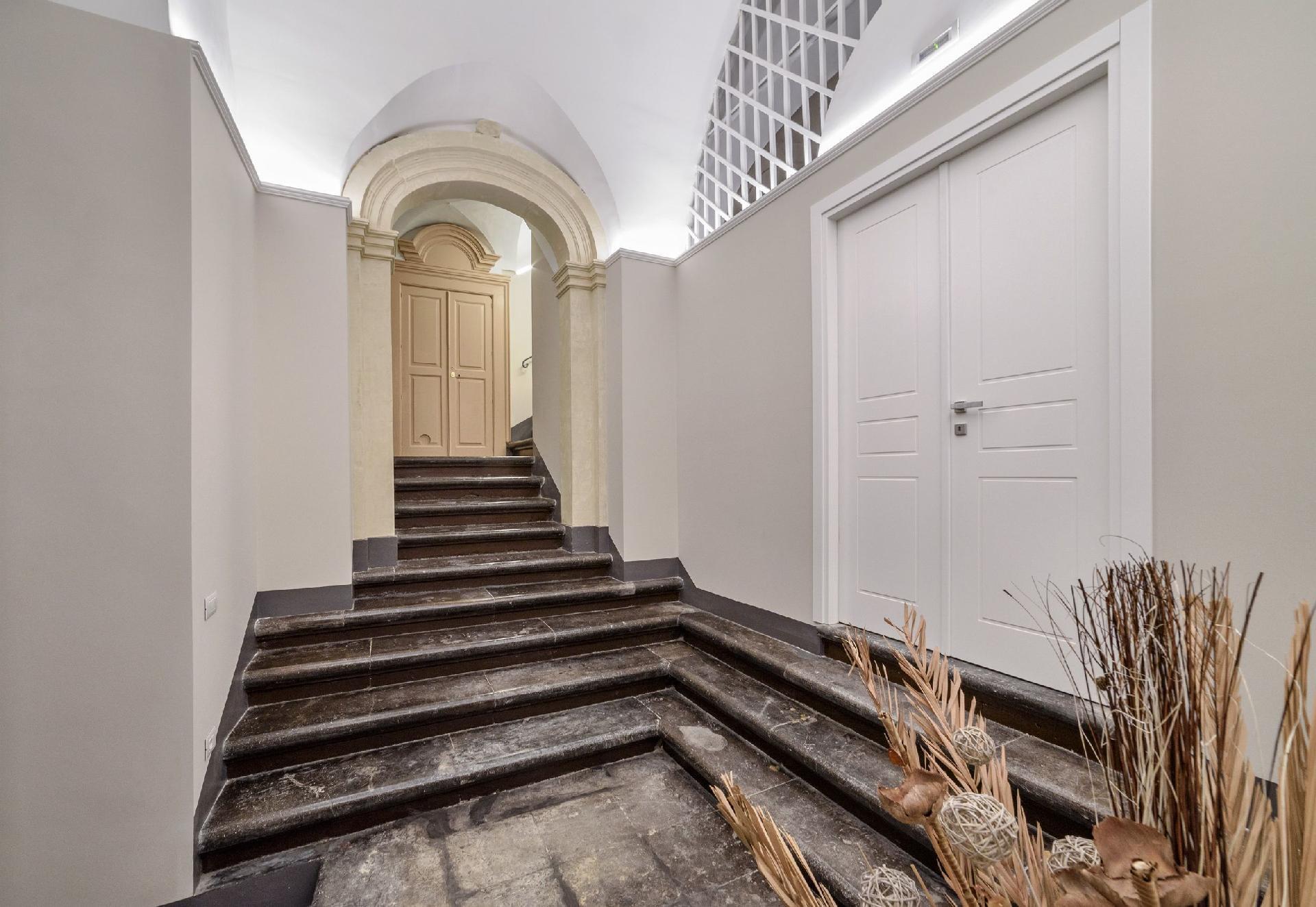 Großes und komfortabel ausgestattetes Appartement mit Balkon mit wunderschönem Blick auf den Dom San Giorgio und die daneben liegende Piazza. Das Appartement befindet sich im zweiten Stock eines Adelspalastes von 1890 und wurde erst kürzlich mit großer Sorgfalt restauriert (2018). Eine breite Treppe in Pechstein führt zum Appartement, das durch seine erlesenen und eleganten Innenbereiche glänzt. Indirekte Beleuchtung bringt die Designermöbel in zarten und warmen Farben besonders gut zur Geltung. Die Unterkunft ist gut ausgestattet und bietet jeglichen Komfort auch dank der Harmonie zwischen historischer Substanz und Moderne, die sich in den verzierten Stuckdecken, den Zierfliesen sowie dem gelungenen Zusammenspiel moderner Möbel mit klarer Linienführung und Vintage-Stil zeigt. Sie besteht aus einem Wohnbereich und einem Schlafbereich mit 2 Schlafzimmern sowie 3 Bädern. Der Wohnbereich besteht aus einem eleganten Wohnzimmer mit Zugang zum Balkon und phantastischem Blick. Das Wohnzimmer mit dekorativem Fliesenboden und mit Fresken bemalten Decken ist mit bequemen Sitzmöbeln für viele schöne Momente der Entspannung ausgestattet. Zudem gibt es einen Großbildfernseher und eine kleine Bar. Eine moderne Küche mit Esszimmermöbeln, TV sowie einer gemütlichen Schlafcouch für zwei Personen bietet eine Kühl,- Gefrierkombination, Geschirrspülmaschine, Mikrowelle und Induktionsherd. Ein Bad mit Massagedusche. Zwei Schlafzimmer: ein großes Schlafzimmer mit Doppelbett mit Blick und eigenes Bad mit Massagedusche; ein Doppelzimmer mit eigenem Bad und Massagedusche geht auf einen kleinen Balkon mit Blick hinaus. Jedes Zimmer ist mit TV und Safe ausgestattet. Klimaanlage in jedem Zimmer, Fön in jedem Bad und Internet-Zugang WLAN. Ein Waschraum zur gemeinsamen Nutzung mit den anderen zwei Appartements mit Waschmaschine und Trockner.
