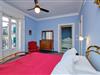 Ein Schlafzimmer mit einem Doppelbett und Zugang zur Terrasse, hat einen begehbaren Kleiderschrank.
