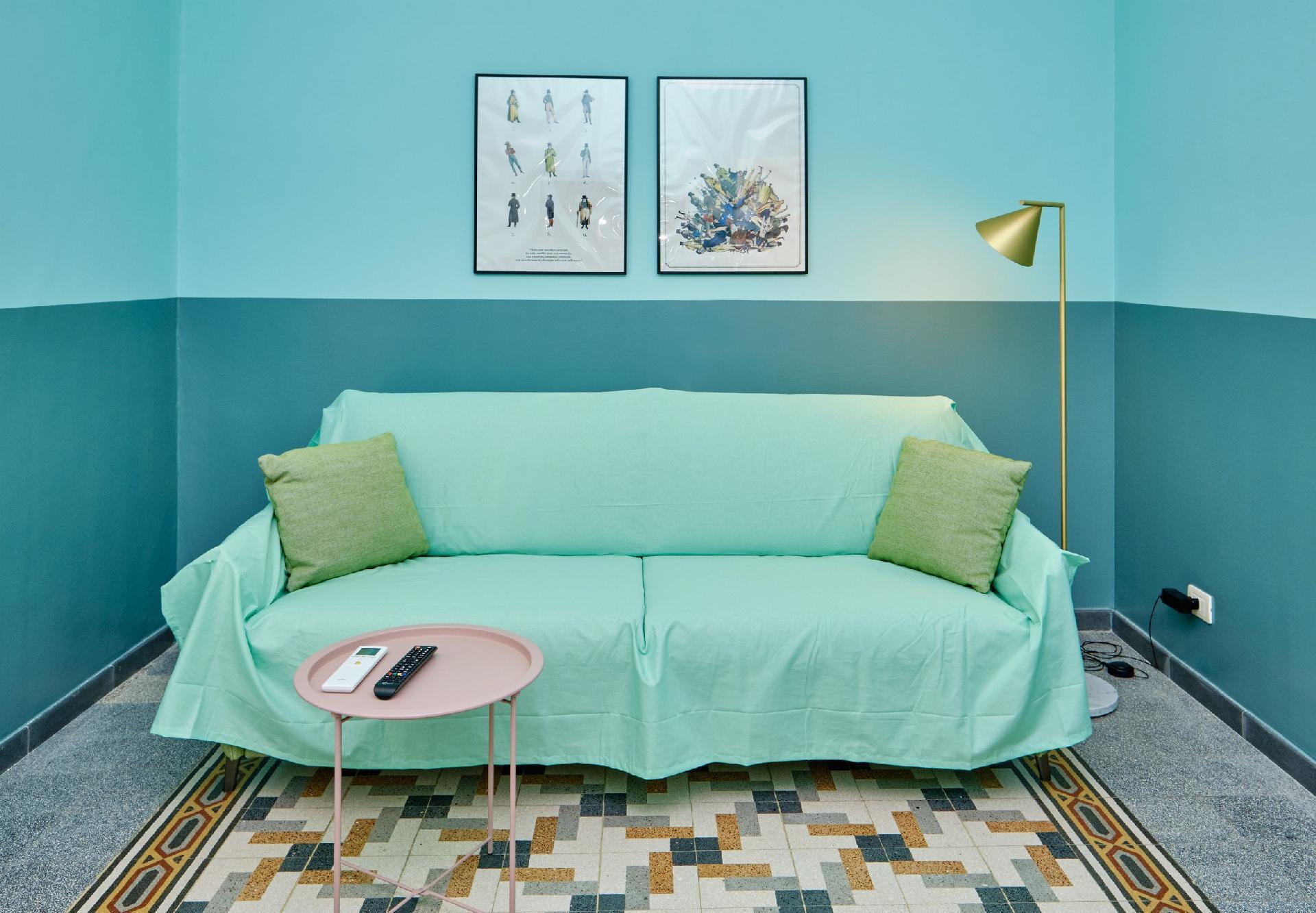 Ein Wohnzimmer mit einem Schlafsofa (für zwei Personen), Fernseher und Minikühlschrank.