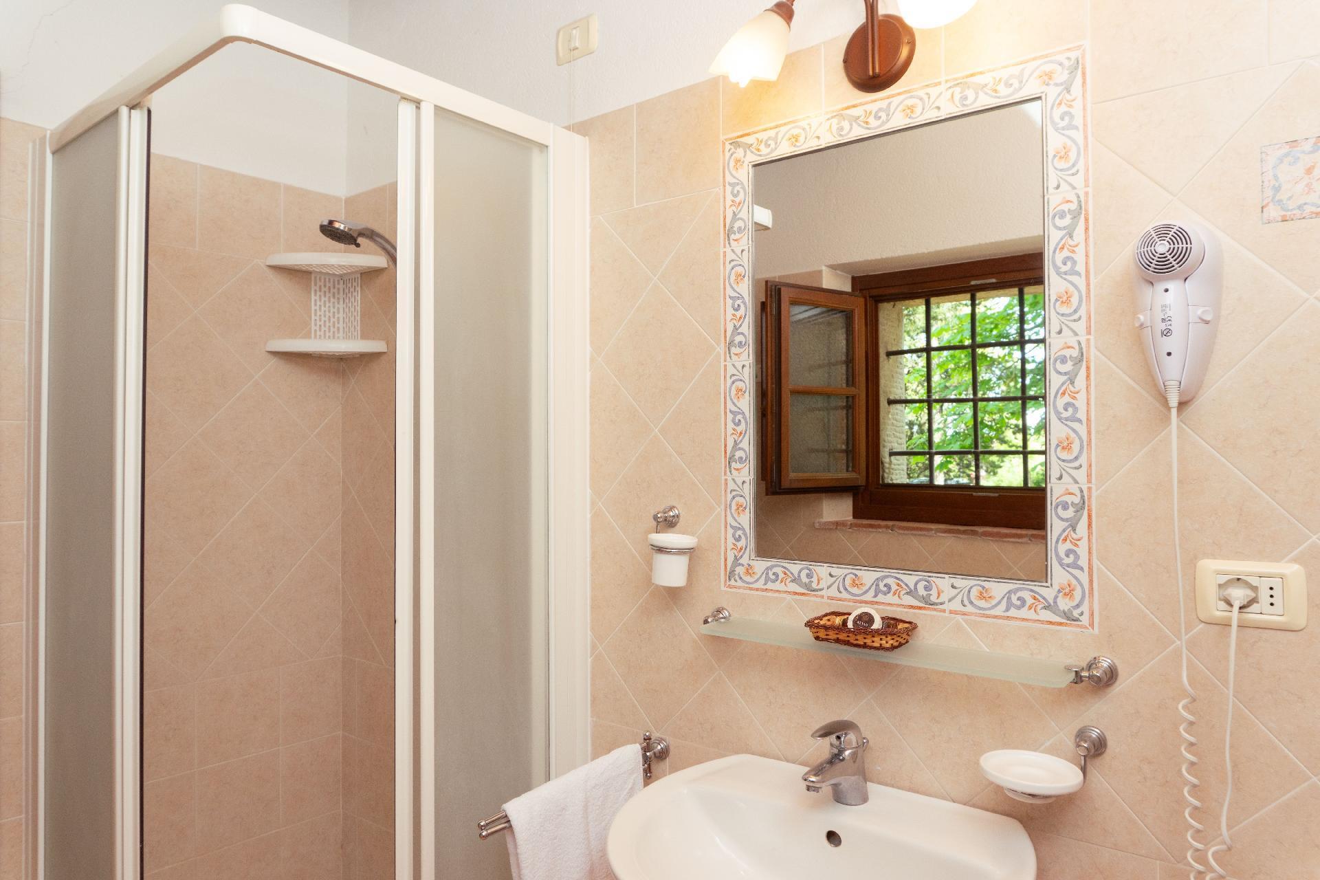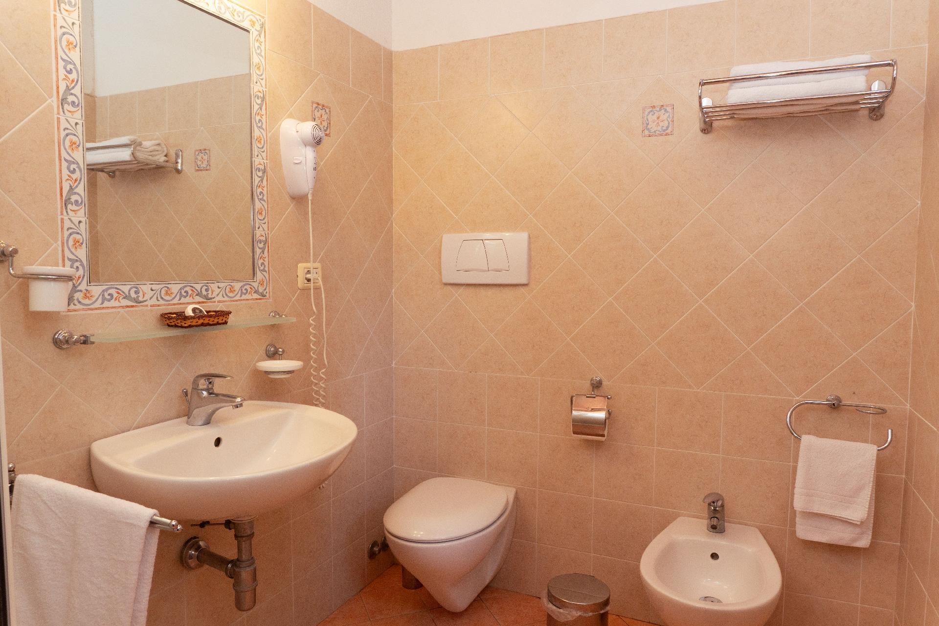 * 1 Badezimmer mit Dusche und Bidet, Handtüchern und Toilettenartikeln