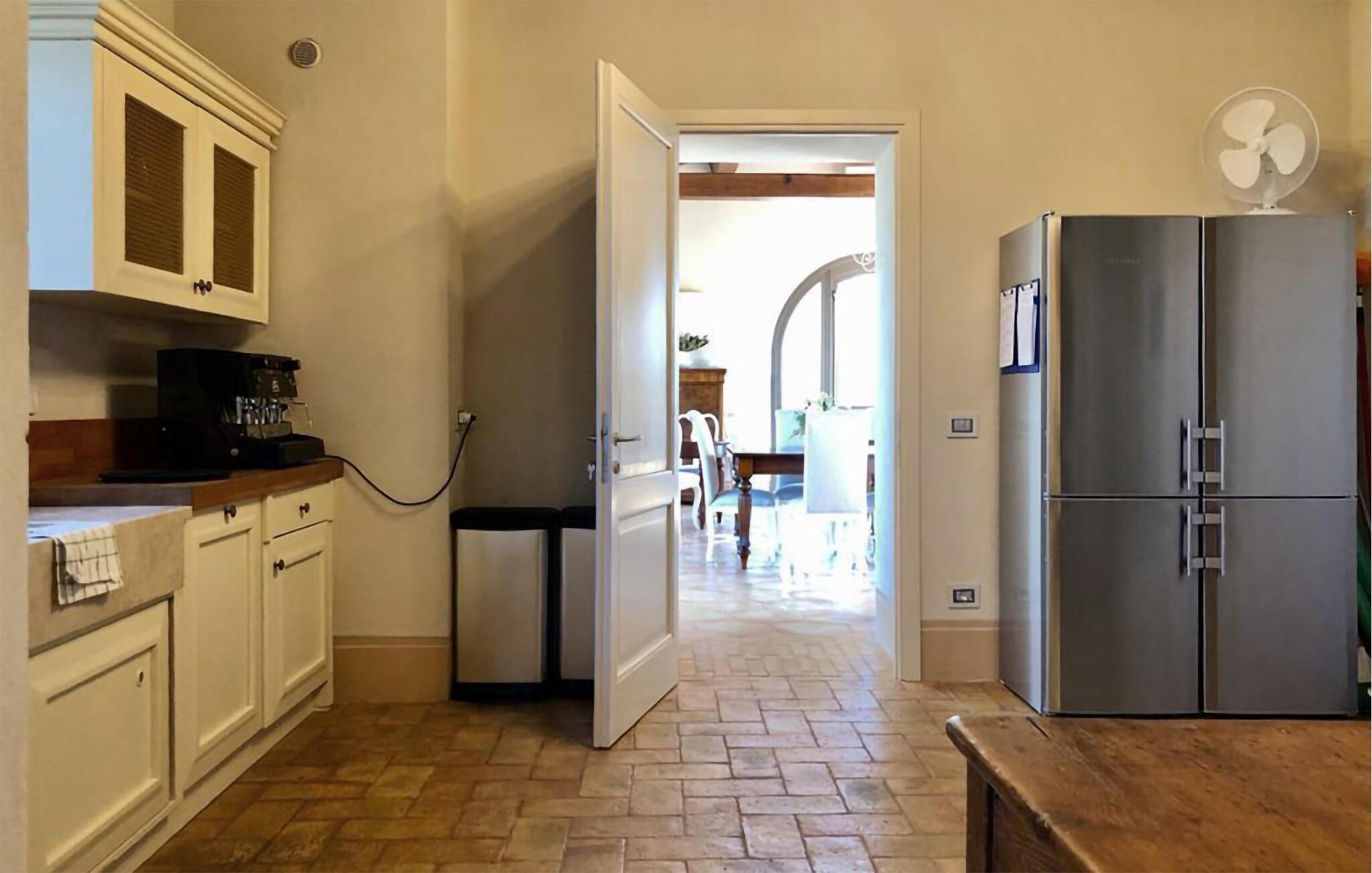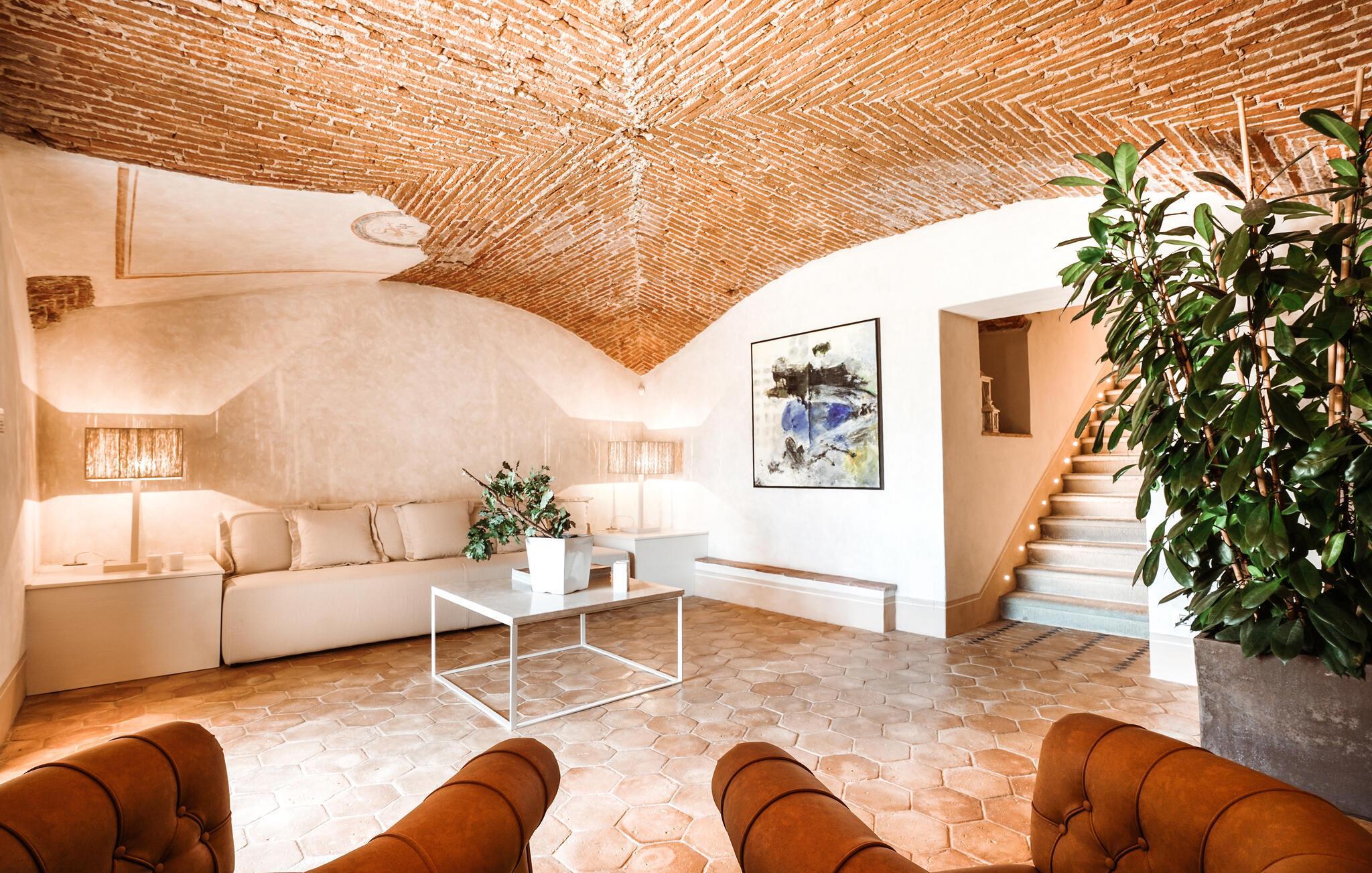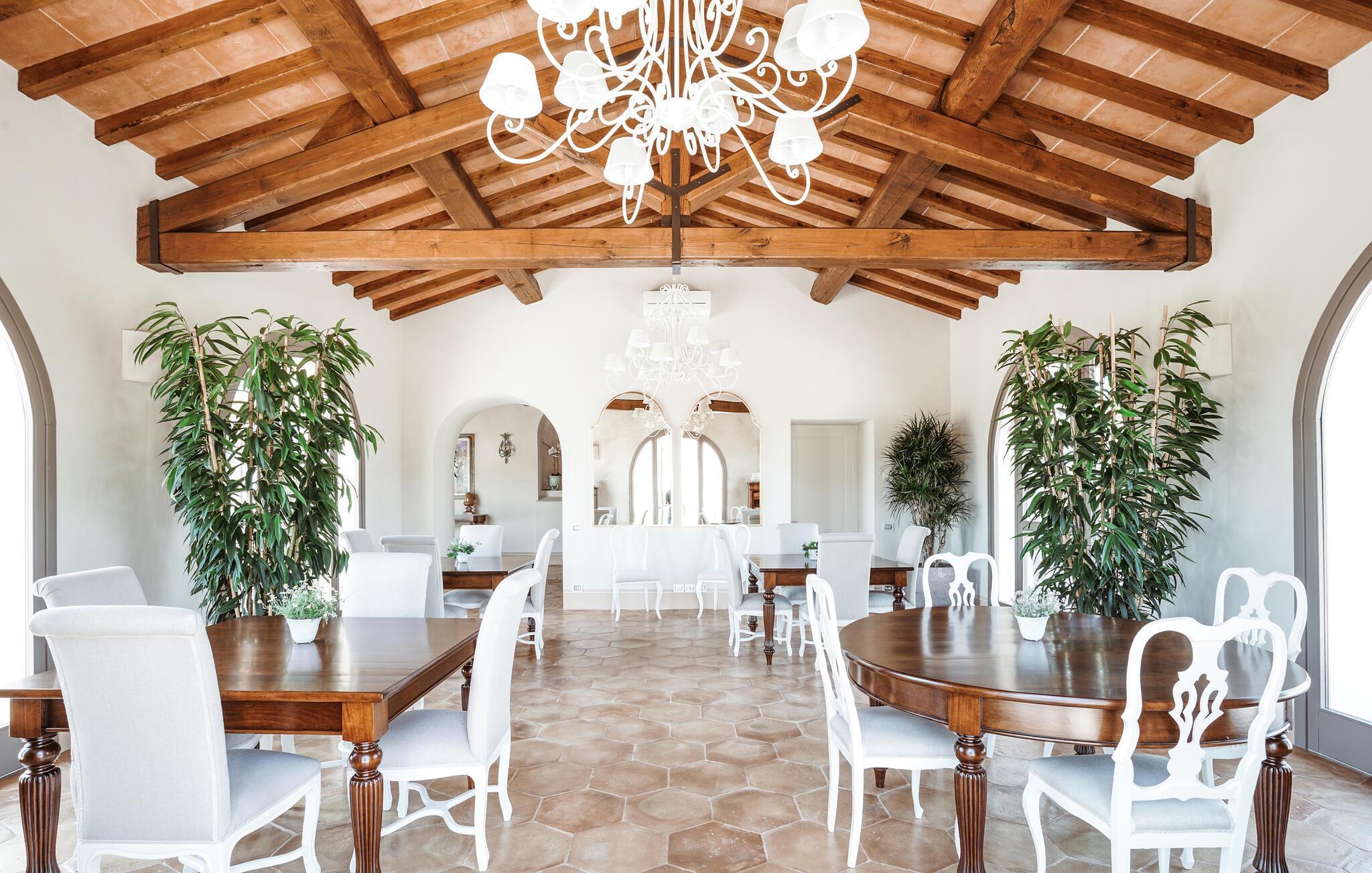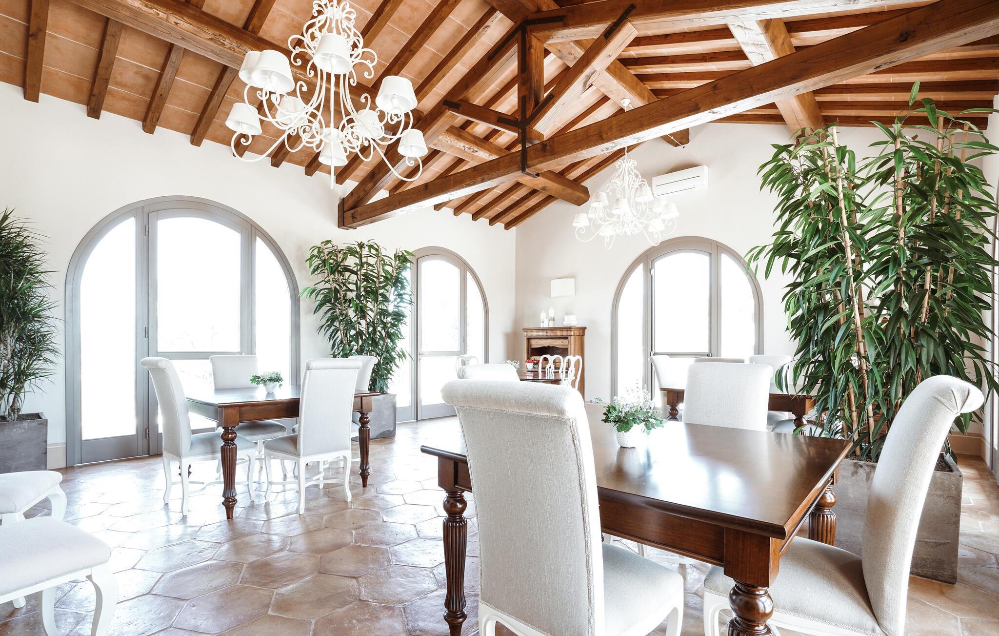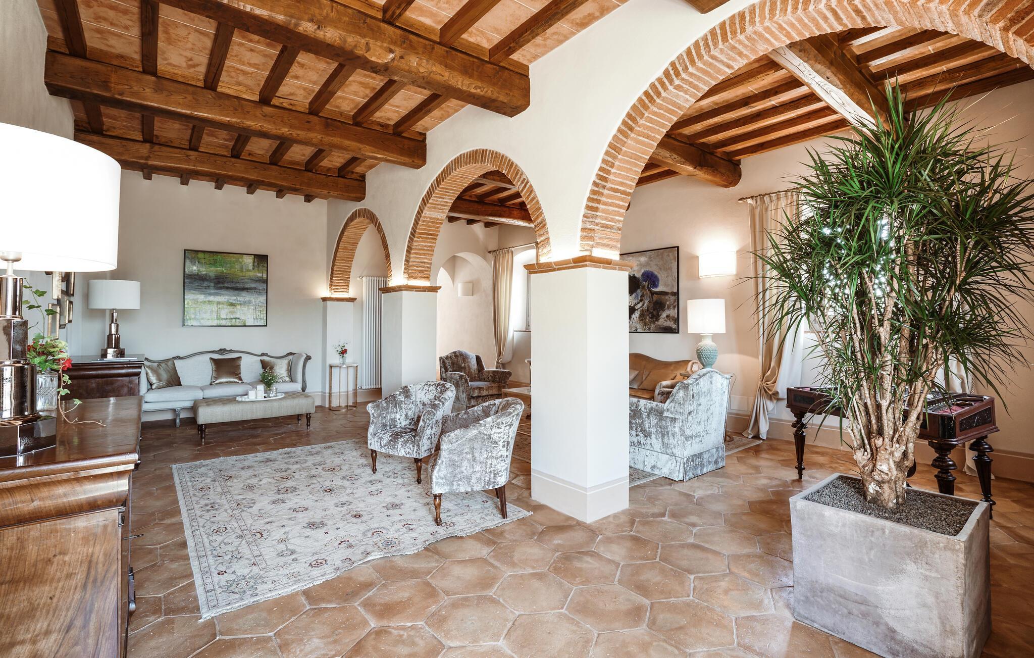 Verbringen Sie unvergessliche Urlaubstage in dieser eleganten Villa auf dem Land, umgeben von sanften Hügeln und viel Ruhe. Das geräumige Ferienhaus bietet ideale Bedingungen für eine größere Reisegruppe, die das Besondere sucht. Lassen Sie sich vom stilvollen Ambiente und der hochwertigen Ausstattung begeistern. Die großzügigen Wohnräume bestechen durch antikes Flair, edle Möbel sowie rustikale Details wie Holzbalkendecken und Natursteinböden. Entspannen Sie in einem der stilvoll eingerichteten Salons, versammeln Sie sich zu gemeinsamen Mahlzeiten im hellen Speisezimmer oder genießen Sie einen Weinabend in der gemütlichen Lounge unter dem Gewölbe. Dank der großen Küche stehen kulinarischen Abenden in geselliger Runde nichts im Wege. Ergänzt wird das Angebot durch eine Sauna und einen Fitnessraum.