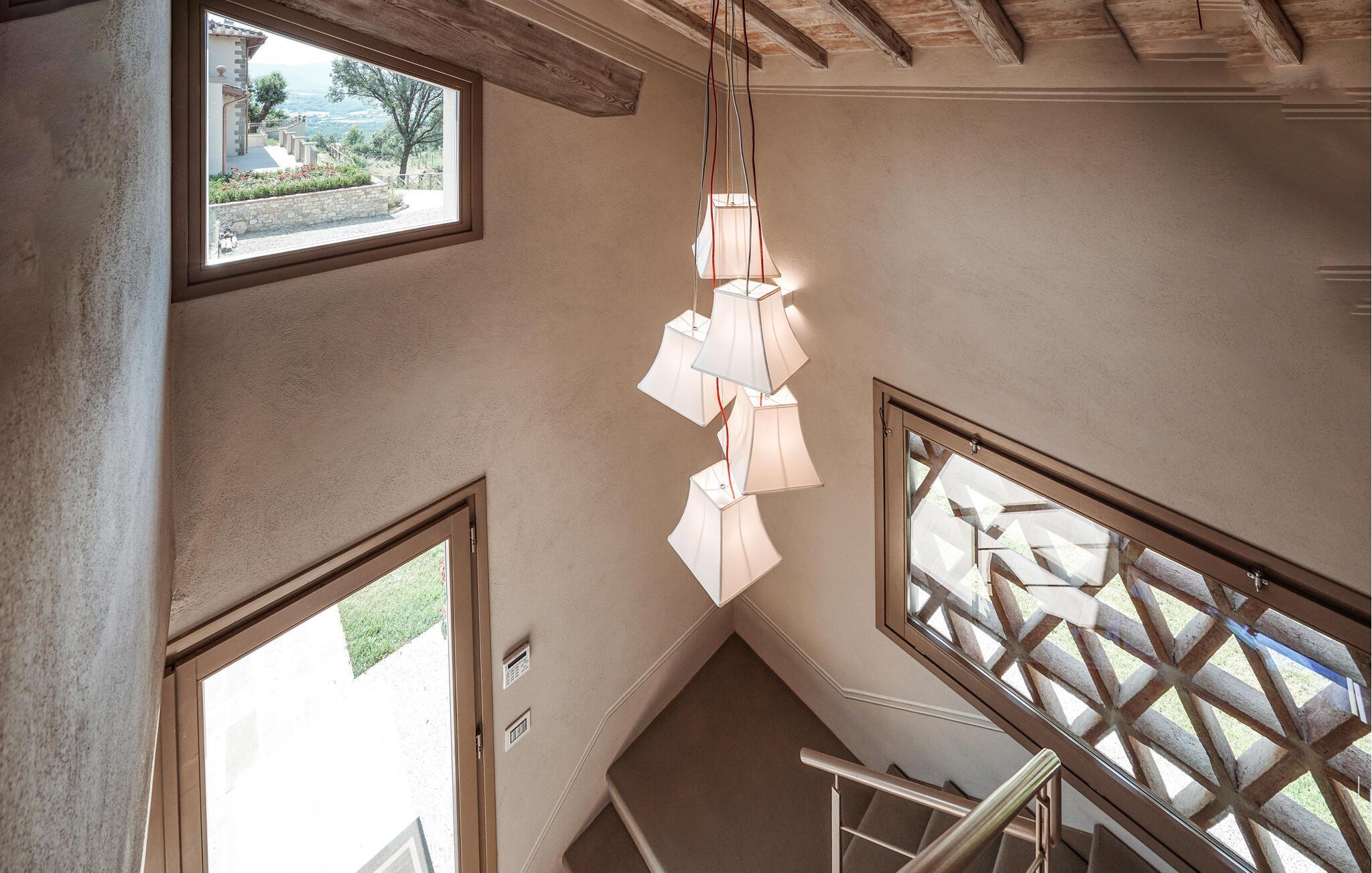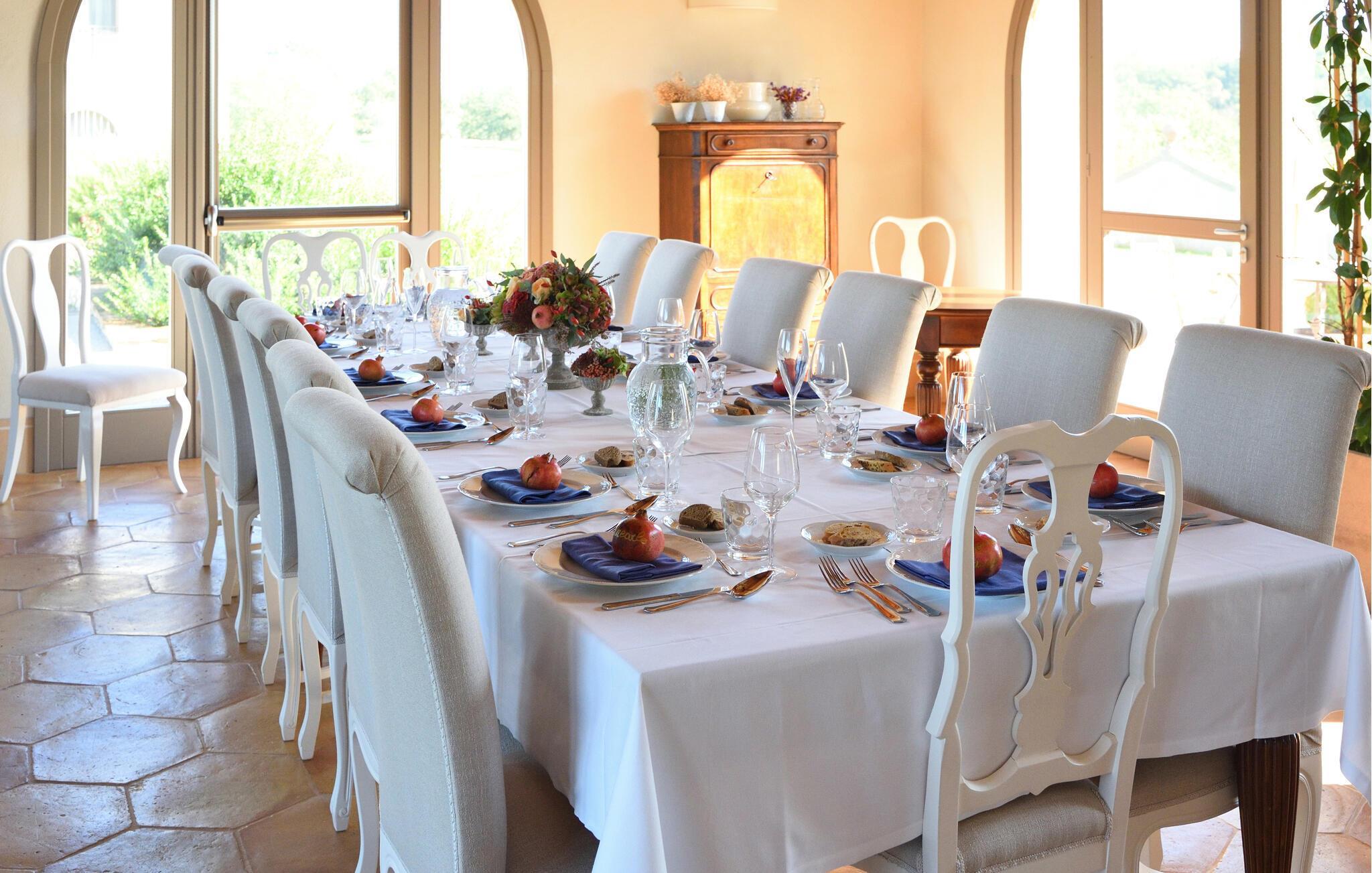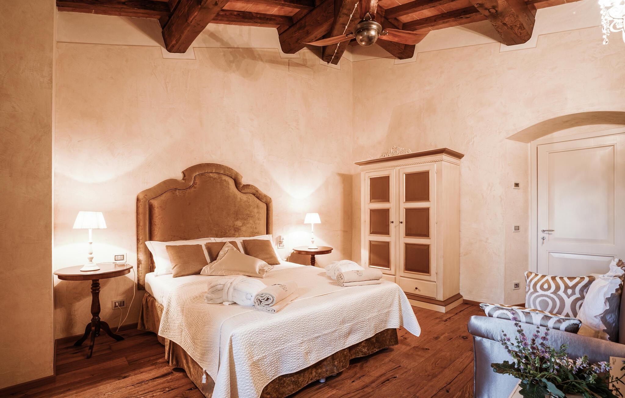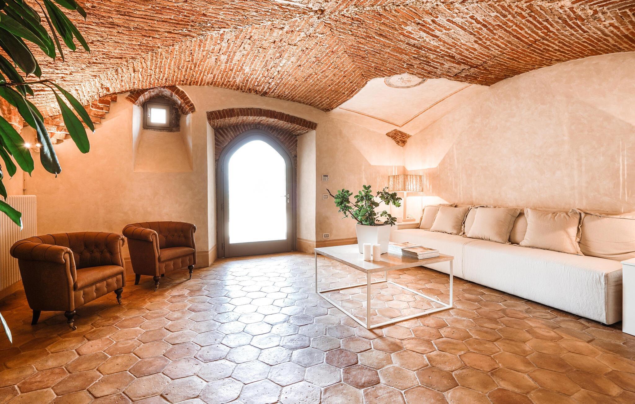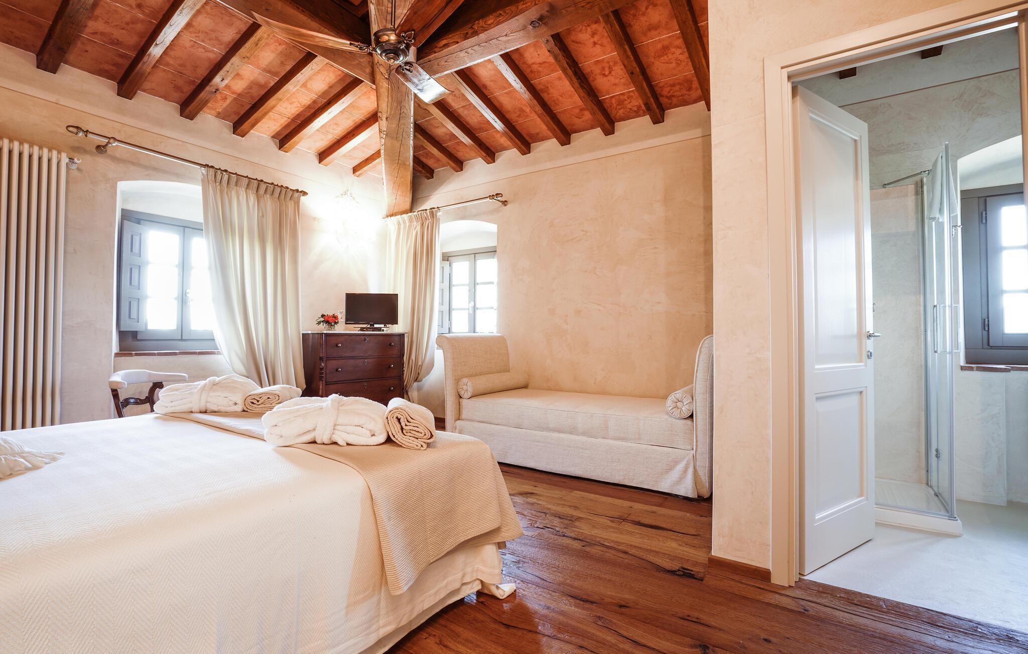 Verbringen Sie unvergessliche Urlaubstage in dieser eleganten Villa auf dem Land, umgeben von sanften Hügeln und viel Ruhe. Das geräumige Ferienhaus bietet ideale Bedingungen für eine größere Reisegruppe, die das Besondere sucht. Lassen Sie sich vom stilvollen Ambiente und der hochwertigen Ausstattung begeistern. Die großzügigen Wohnräume bestechen durch antikes Flair, edle Möbel sowie rustikale Details wie Holzbalkendecken und Natursteinböden. Entspannen Sie in einem der stilvoll eingerichteten Salons, versammeln Sie sich zu gemeinsamen Mahlzeiten im hellen Speisezimmer oder genießen Sie einen Weinabend in der gemütlichen Lounge unter dem Gewölbe. Dank der großen Küche stehen kulinarischen Abenden in geselliger Runde nichts im Wege. Ergänzt wird das Angebot durch eine Sauna und einen Fitnessraum.