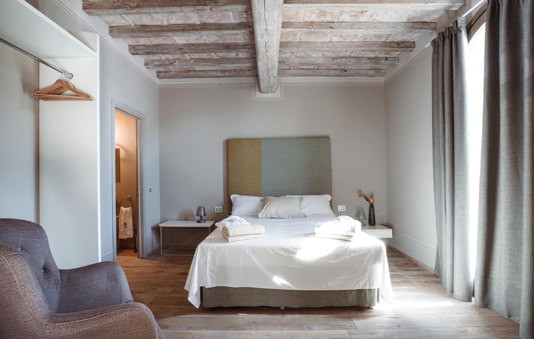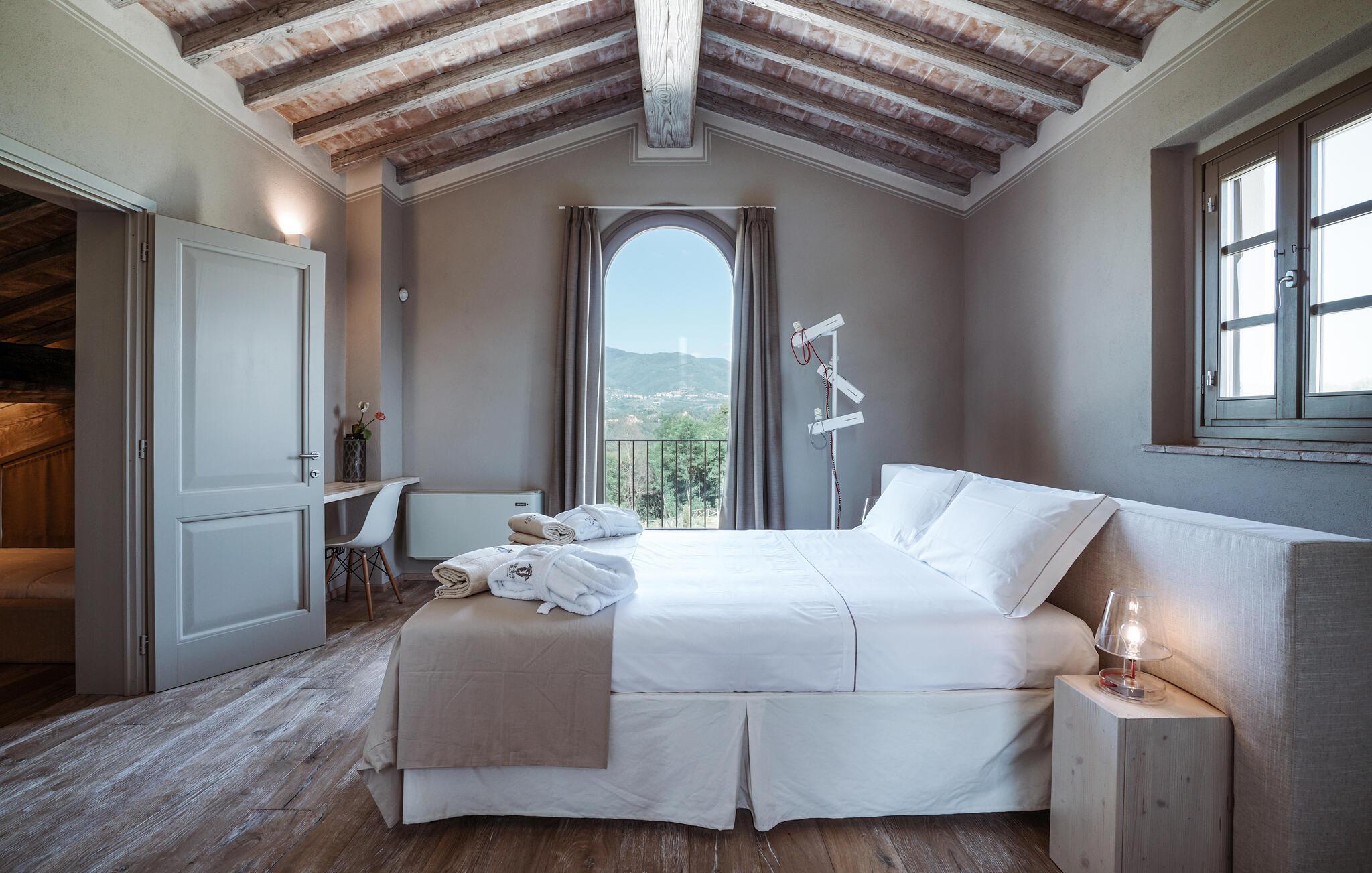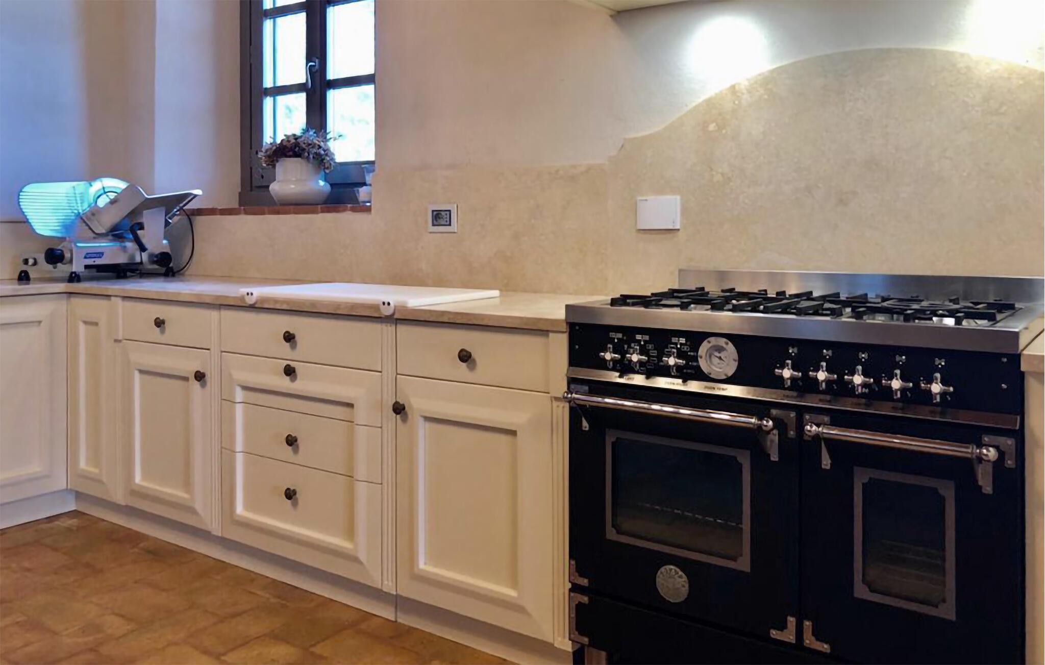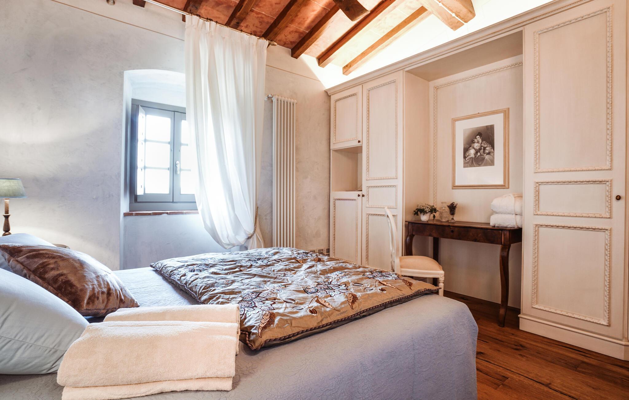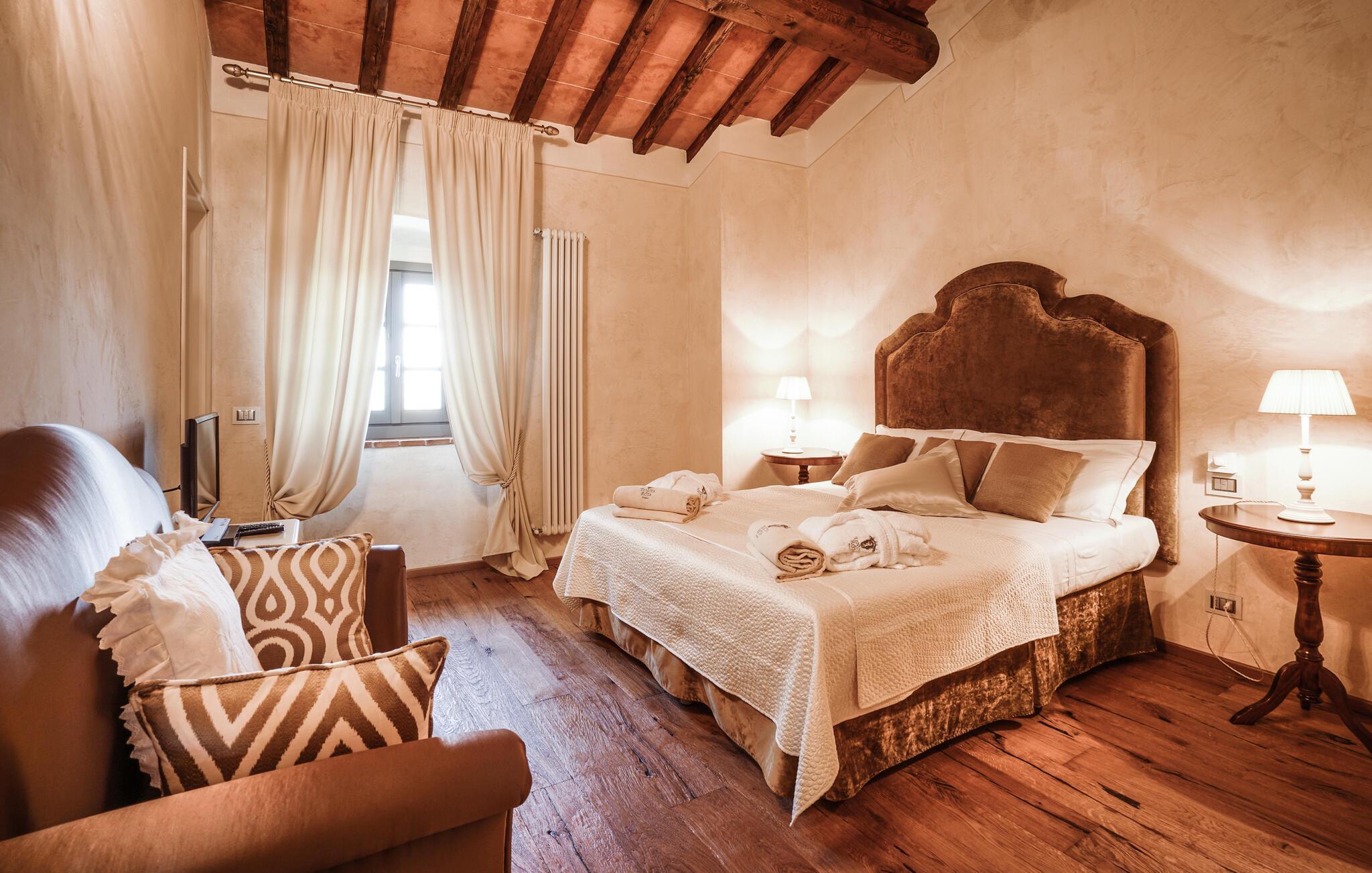 Verbringen Sie unvergessliche Urlaubstage in dieser eleganten Villa auf dem Land, umgeben von sanften Hügeln und viel Ruhe. Das geräumige Ferienhaus bietet ideale Bedingungen für eine größere Reisegruppe, die das Besondere sucht. Lassen Sie sich vom stilvollen Ambiente und der hochwertigen Ausstattung begeistern. Die großzügigen Wohnräume bestechen durch antikes Flair, edle Möbel sowie rustikale Details wie Holzbalkendecken und Natursteinböden. Entspannen Sie in einem der stilvoll eingerichteten Salons, versammeln Sie sich zu gemeinsamen Mahlzeiten im hellen Speisezimmer oder genießen Sie einen Weinabend in der gemütlichen Lounge unter dem Gewölbe. Dank der großen Küche stehen kulinarischen Abenden in geselliger Runde nichts im Wege. Ergänzt wird das Angebot durch eine Sauna und einen Fitnessraum.