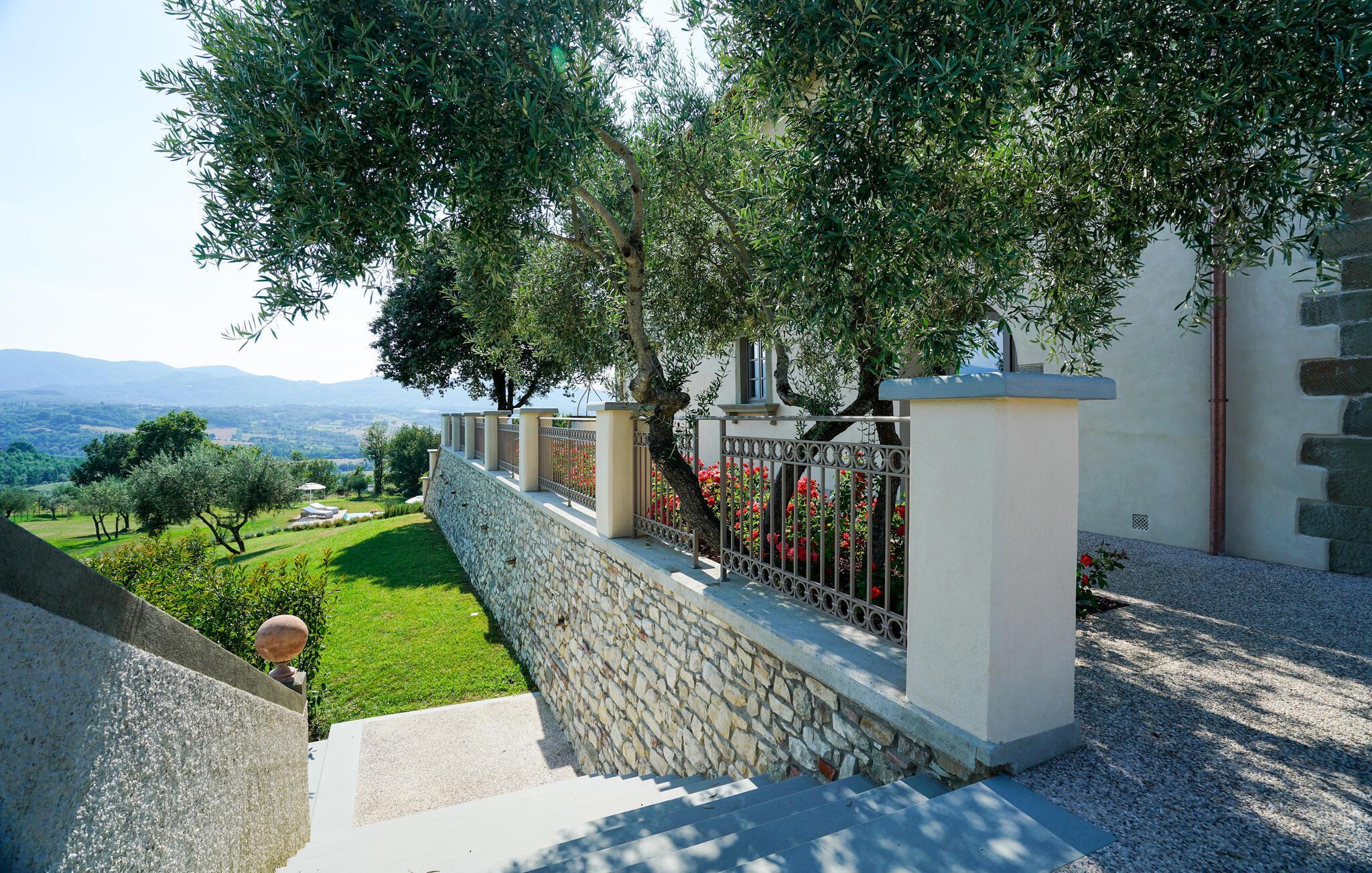 Treten Sie hinaus auf die gepflegten Terrassen mit Panoramablick über die grüne Umgebung. Nutzen Sie den großen Poolbereich mit Sonnenliegen für erholsame Stunden oder genießen Sie Ihren Espresso unter der Pergola. Die weitläufige Gartenanlage lädt zum Spazieren, Lesen oder Meditieren ein.