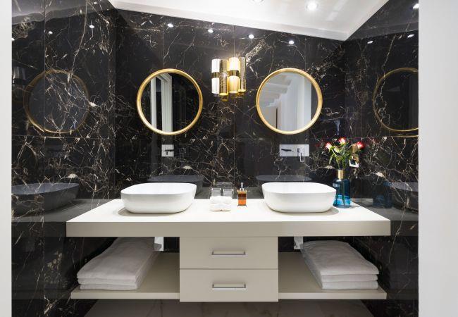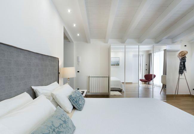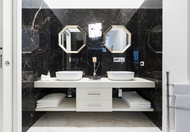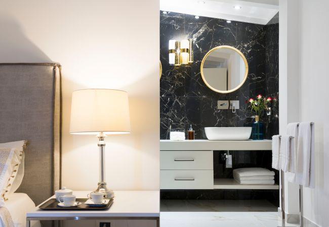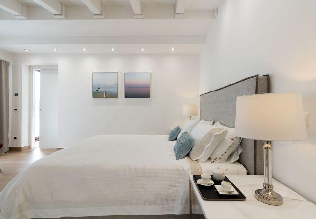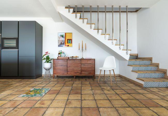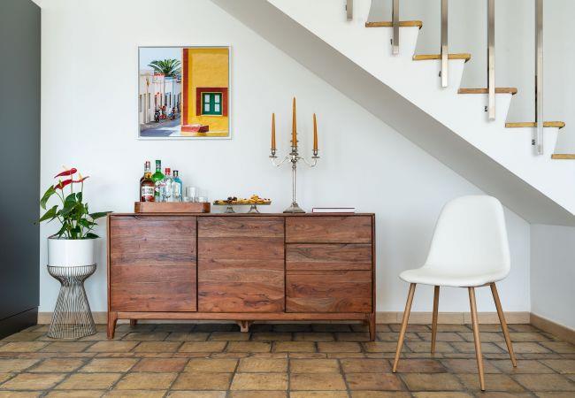 Diese komfortablen Innenräume sind auf zwei Ebenen verteilt und umfassen im Erdgeschoss einen großen und hellen Wohnraum, eine voll ausgestattete Küche und zwei luxuriöse Schlafzimmer -eines davon mit Zugang von außen- mit eigenem Bad. Im ersten Obergeschoss, das ebenfalls von außen zugänglich ist, wird der Schlafbereich durch das dritte Schlafzimmer mit Panoramaveranda und einem Bad mit Dusche ergänzt.