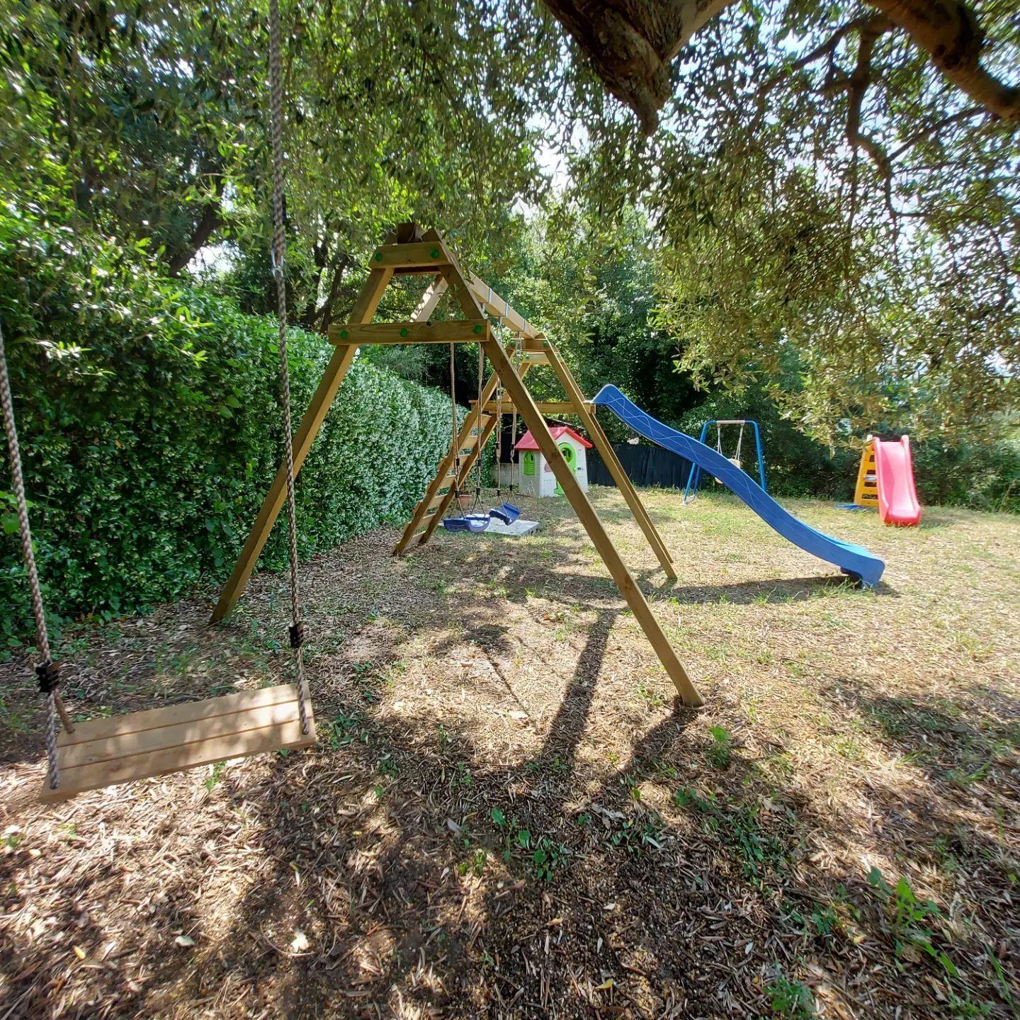 Im Außenbereich erwartet die Gäste eine private Veranda mit Tisch und Stühlen, ideal für Mahlzeiten im Freien, umgeben von einem großen Garten mit Liegestühlen. Für die Kleinsten gibt es einen gut ausgestatteten Spielplatz und einen entzückenden Mini-Bauernhof mit Tieren, die den Aufenthalt noch angenehmer machen.