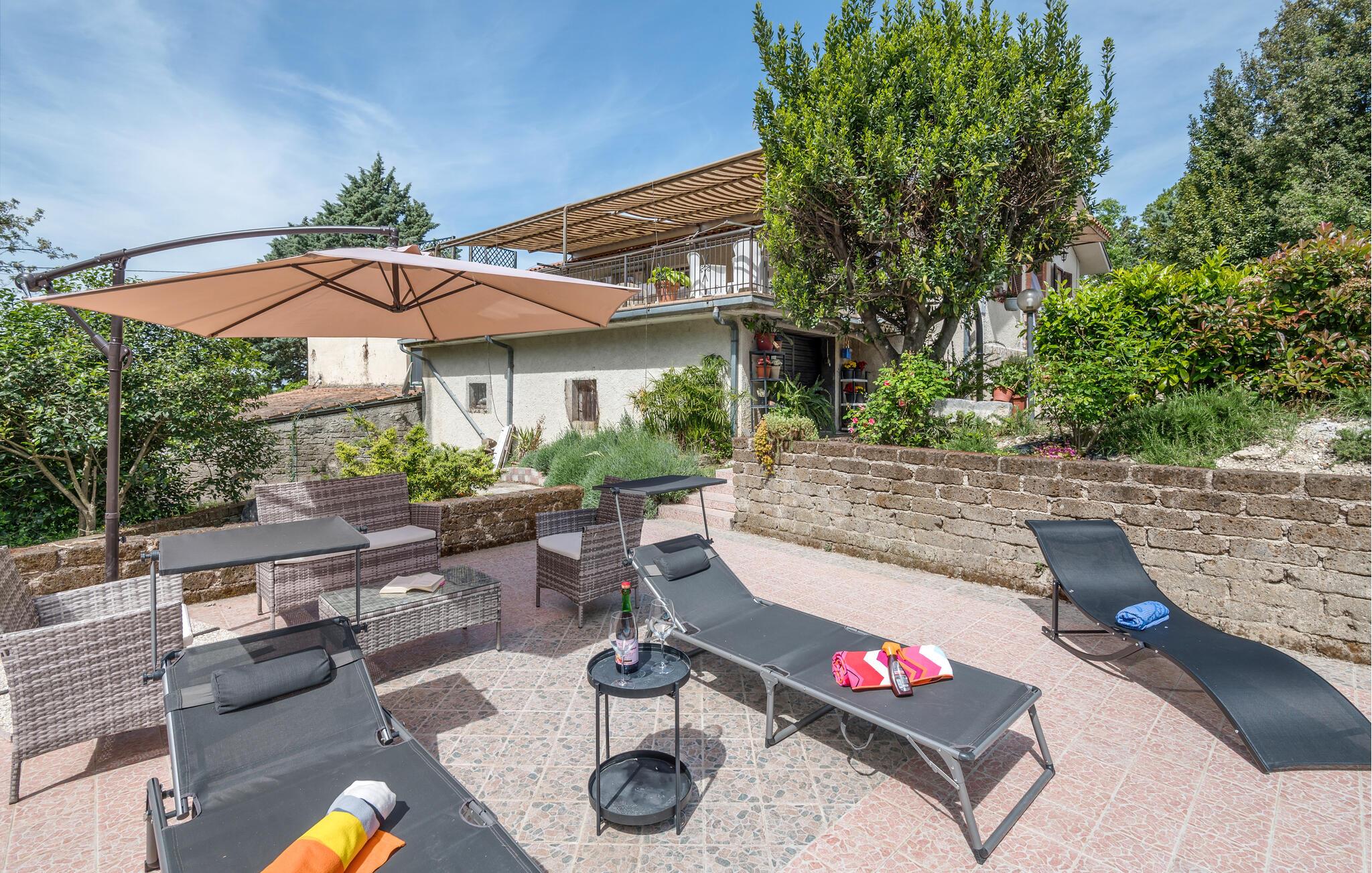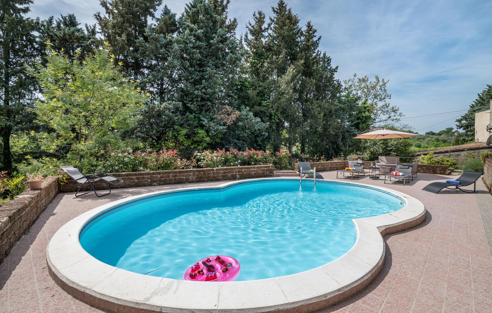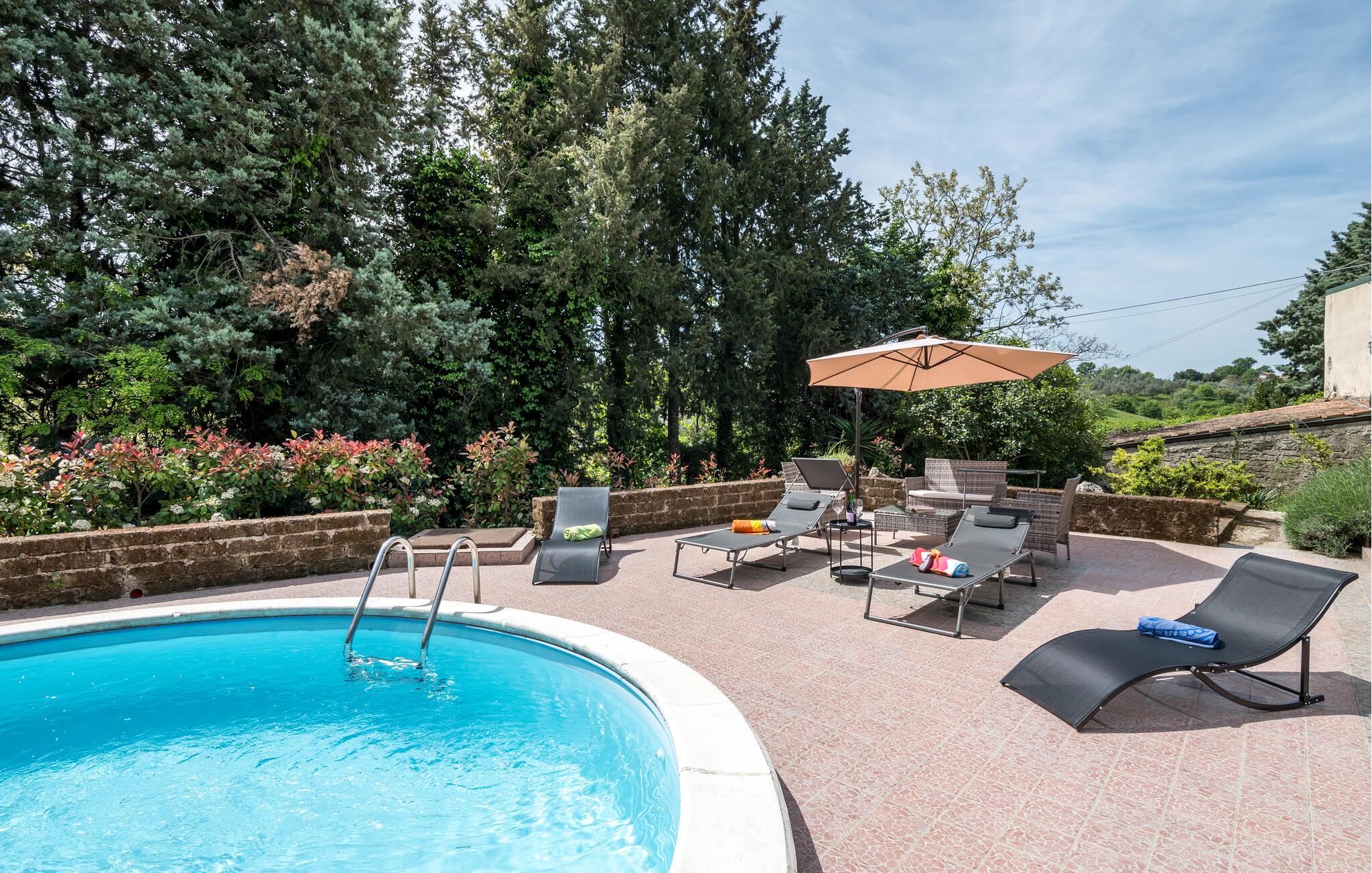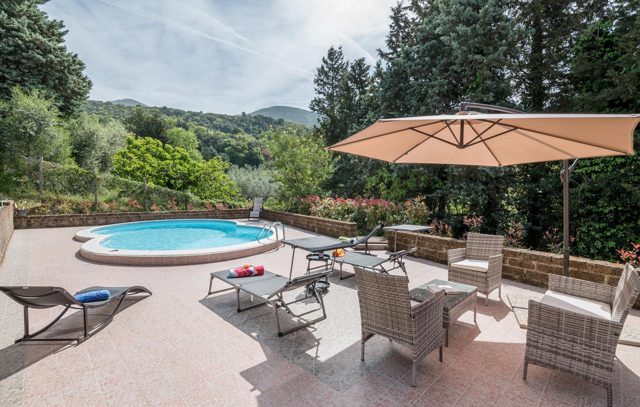 Genießen Sie auf der Terrasse in vollen Zügen die Sonne und erfrischende Bäder im Pool, vielleicht lassen Sie auch bei einem Glas Wein einen herrlichen Urlaubstag im Freien ausklingen, während der Blick weit über die pittoreske Landschaft schweift.