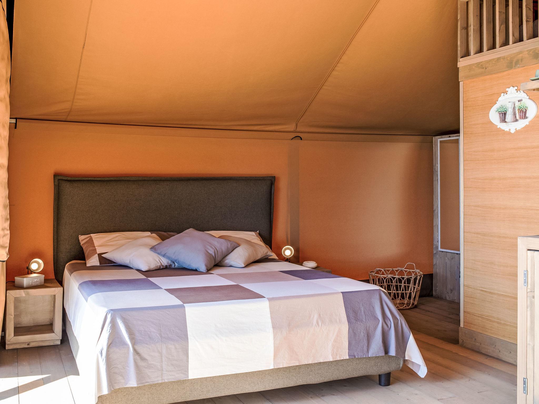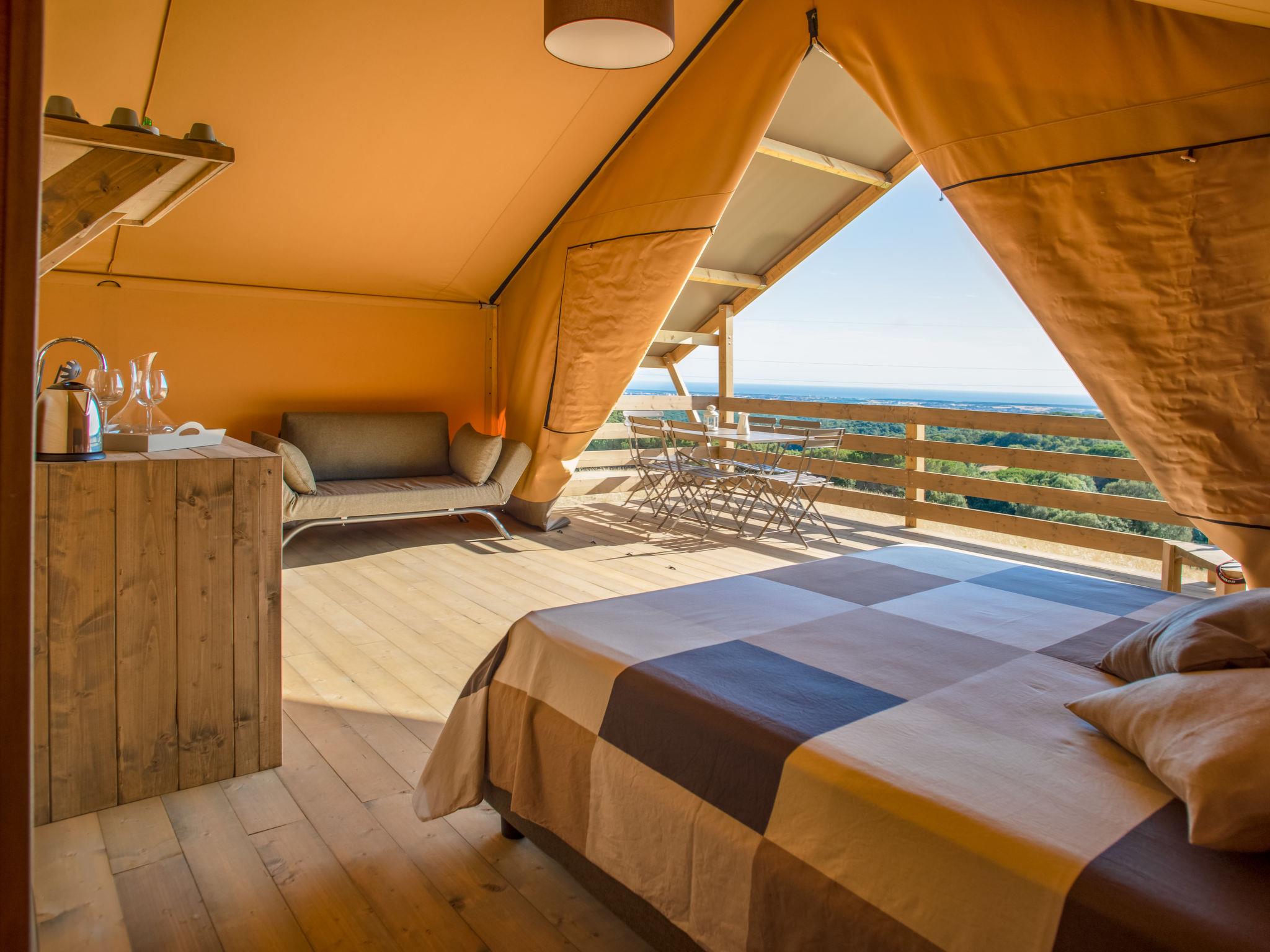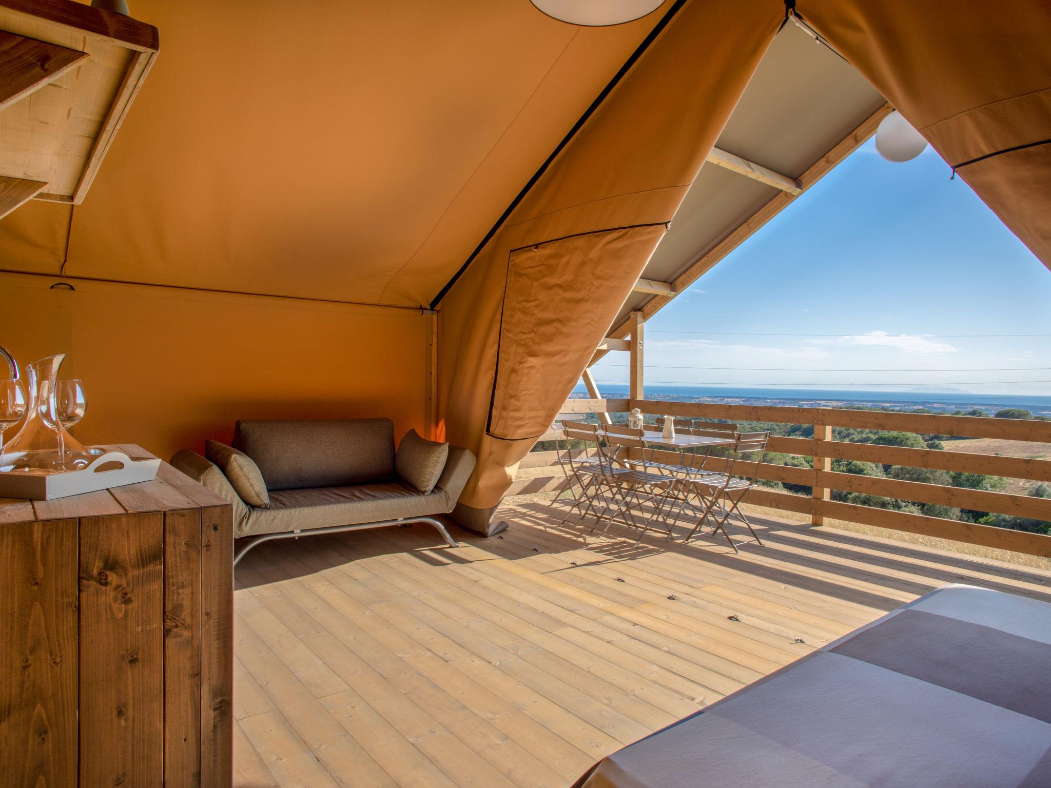 "Glampingtent Venere", 1-Zimmer-Mobilheim 32 m2, im erhöhten Erdgeschoss. Modern und gemütlich eingerichtet: offenes Wohn-/Schlafzimmer mit 1 Doppeldiwanbett und 1 Doppelbett. Ausgang zur Veranda. Offene Galerie mit 1 franz. Bett. Offene Küche (4 Glaskeramikplatten, Wasserkocher, elektrische Kaffeemaschine). Dusche/Bidet/WC. E-Heizung, Klimaanlage. Terrasse 16 m2, überdacht. Terrassenmöbel. Sehr schöne Panoramasicht auf das Meer und die Landschaft. Zur Verfügung: Haartrockner. Bitte beachten: Maximal 1 Haustier/Hund erlaubt. Eigener Eingang. IT050030B5LGYNK79U