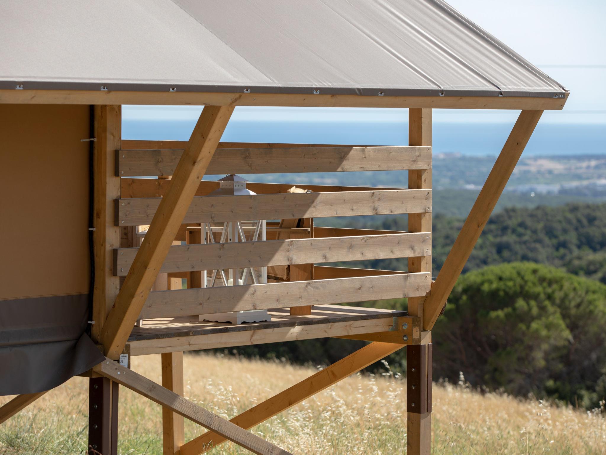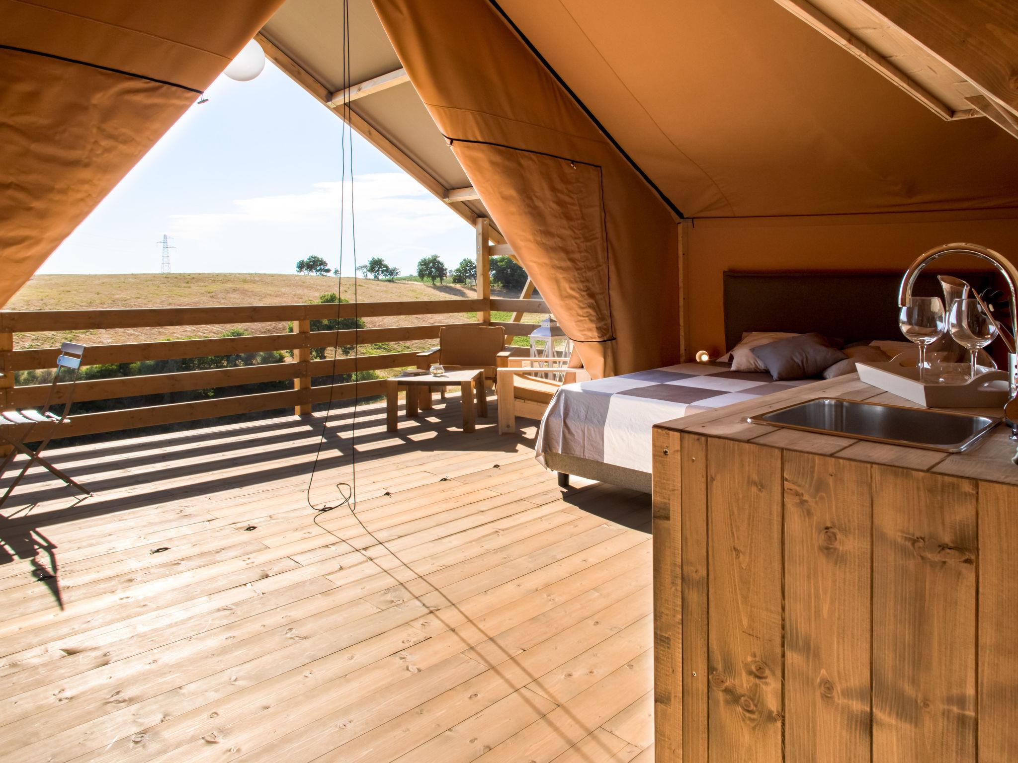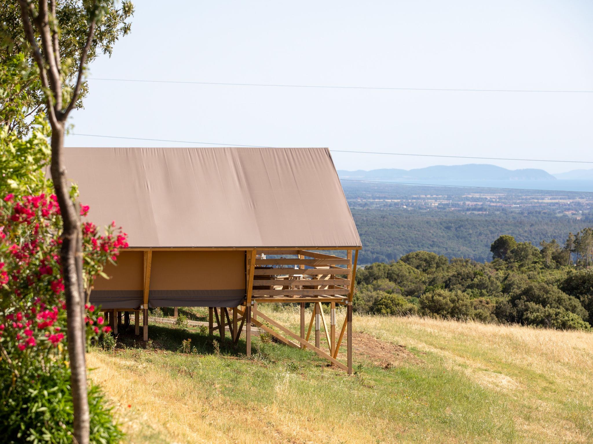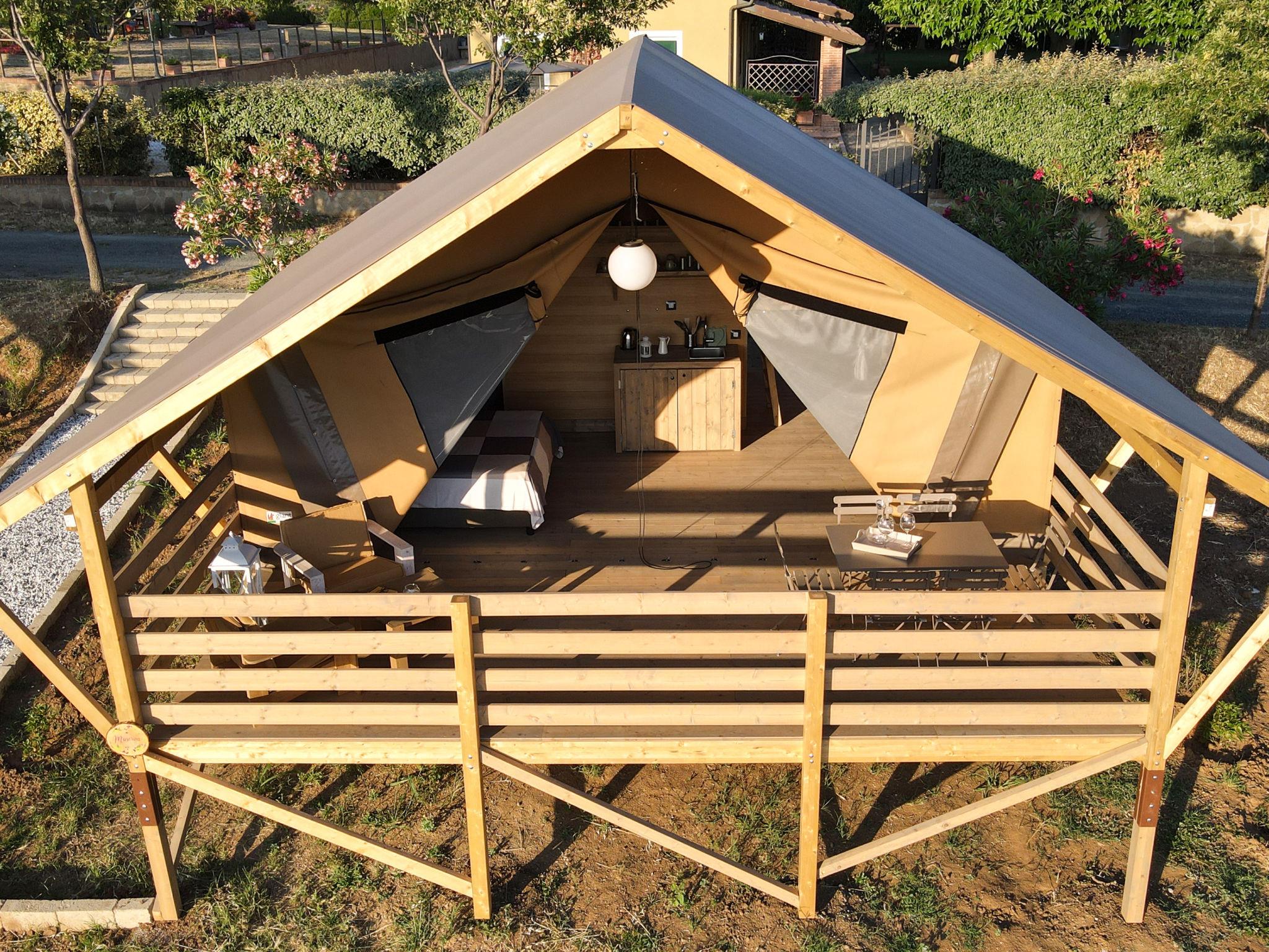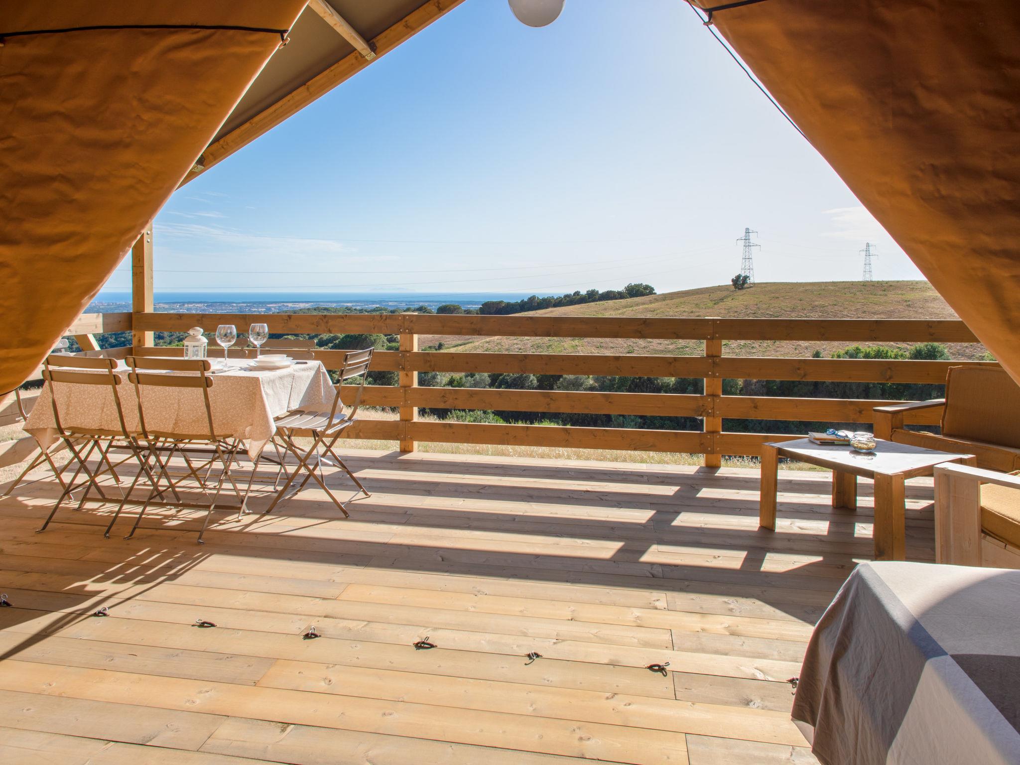 "Glampingtent Minerva", 1-Zimmer-Mobilheim 32 m2, im erhöhten Erdgeschoss. Modern und gemütlich eingerichtet: offenes Wohn-/Schlafzimmer mit 1 Doppeldiwanbett und 1 Doppelbett. Ausgang zur Veranda. Offene Galerie mit 1 franz. Bett. Offene Küche (4 Glaskeramikplatten, Wasserkocher, elektrische Kaffeemaschine). Dusche/Bidet/WC. E-Heizung, Klimaanlage. Terrasse 16 m2, überdacht. Terrassenmöbel. Sehr schöne Panoramasicht auf das Meer und die Landschaft. Zur Verfügung: Haartrockner. Bitte beachten: Maximal 1 Haustier/Hund erlaubt. Eigener Eingang. IT050030B5LGYNK79U