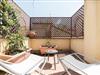 Die erste Terrasse ist mit einem Esstisch und Stühlen ausgestattet, die zweite mit zwei Liegestühlen und einem kleinen Tisch.