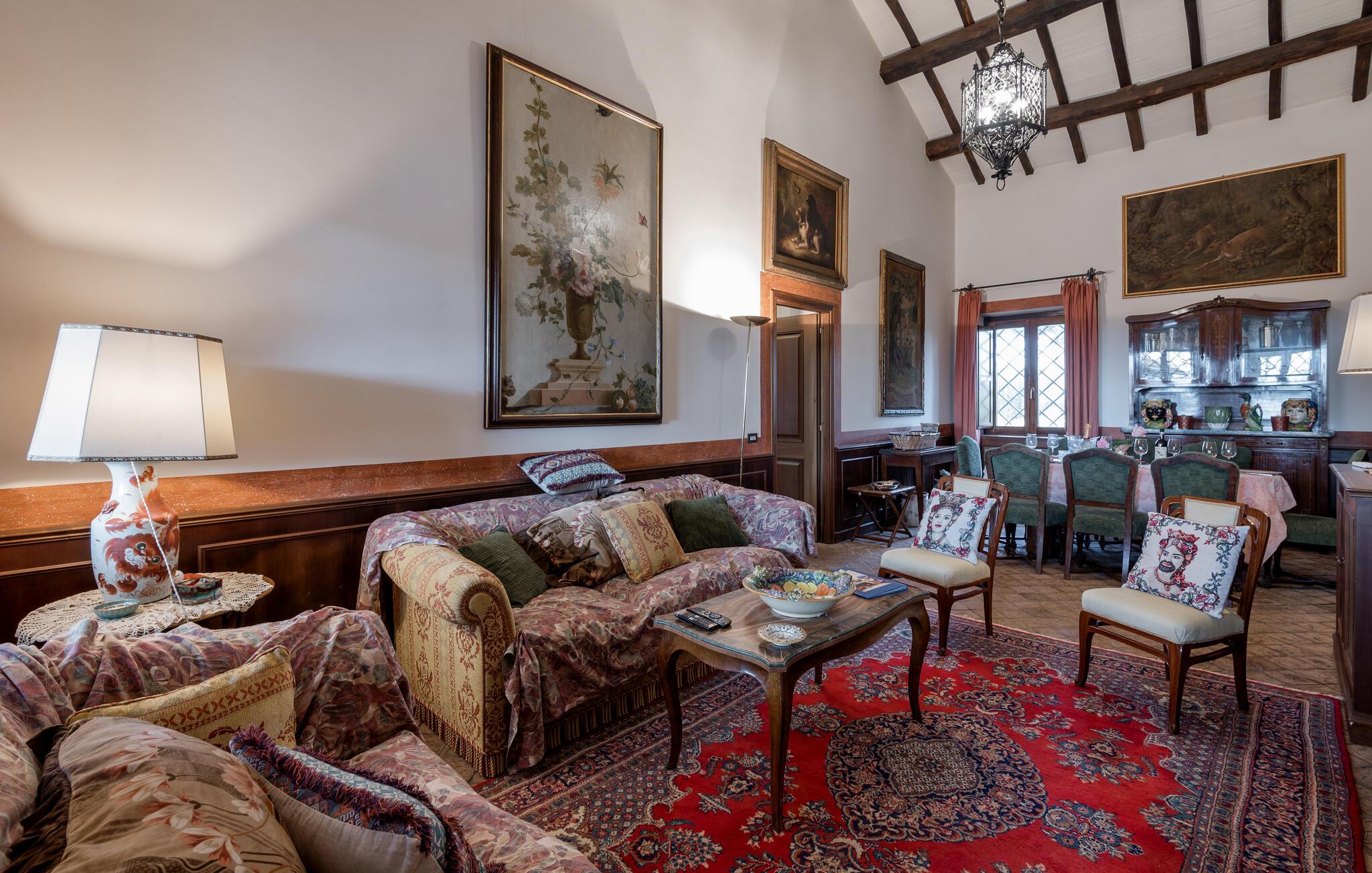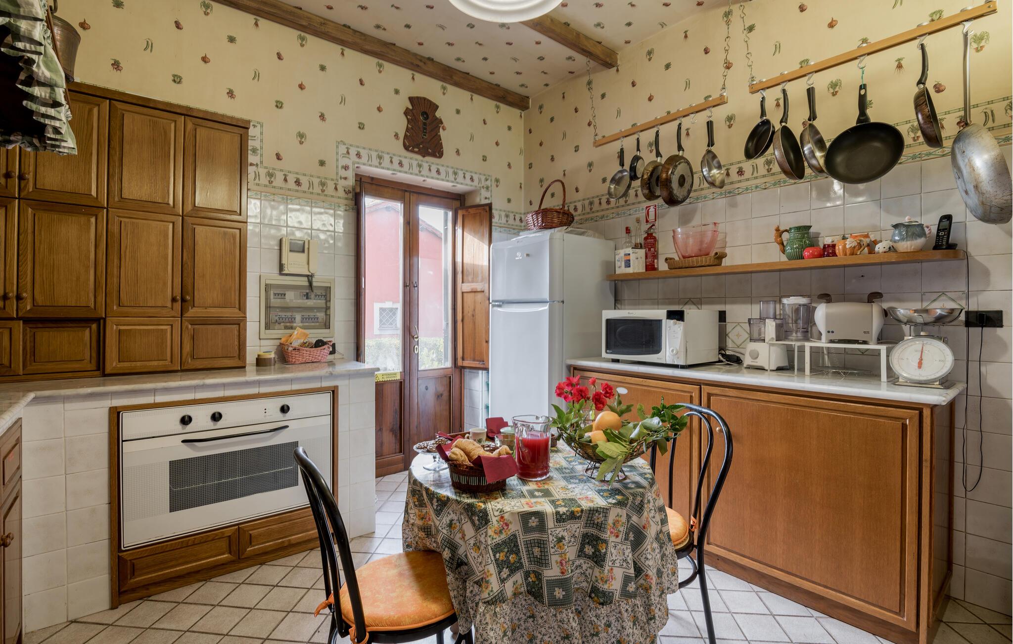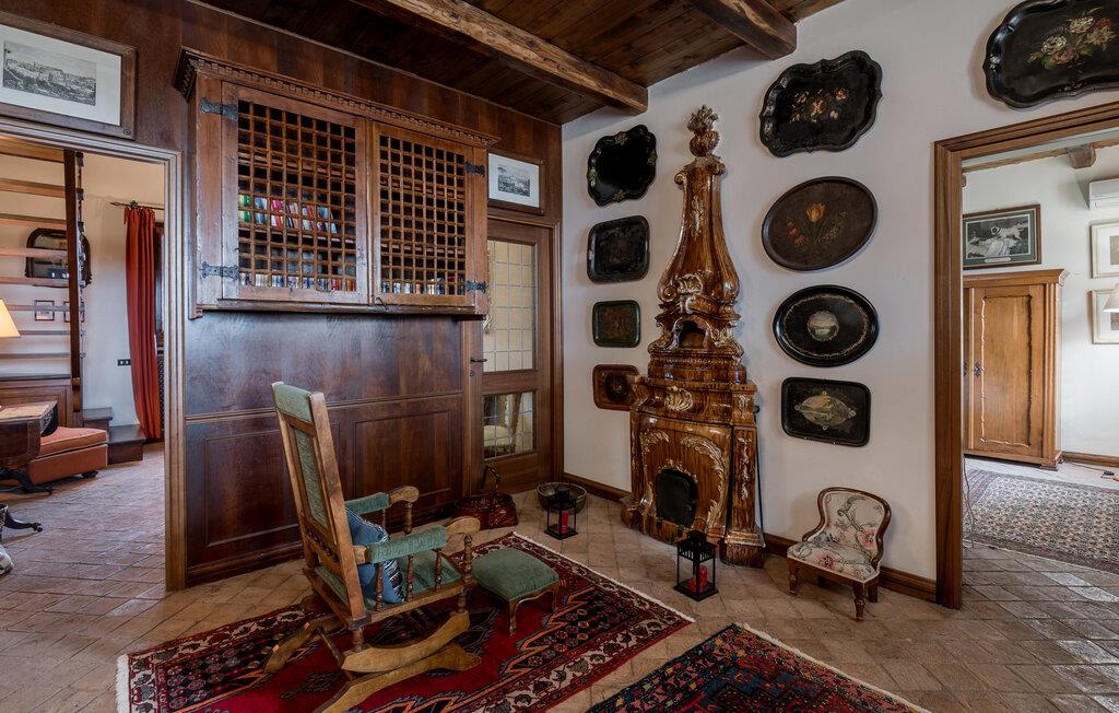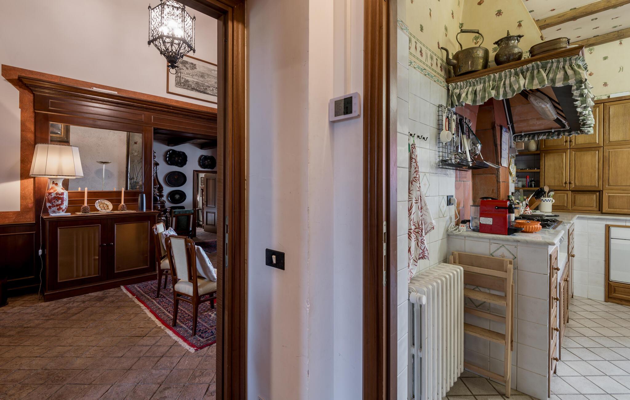 Verbringen Sie den Nachmittag im gemütlichen Wohnzimmer, das mit antiken Möbeln und kunstvollen Dekorationen ausgestattet ist. Die hohen Decken und die historische Einrichtung verleihen dem Raum eine besondere Atmosphäre. Und bereiten Sie ein traditionelles italienisches Mittagessen in der stilvollen Küche des Hauses zu. Nutzen Sie die Möglichkeit, im Freien zu speisen. Das Ferienhaus bietet einen wunderbaren Außenbereich mit einer überdachten Terrasse, ideal für ein gemütliches Abendessen an der frischen Luft.