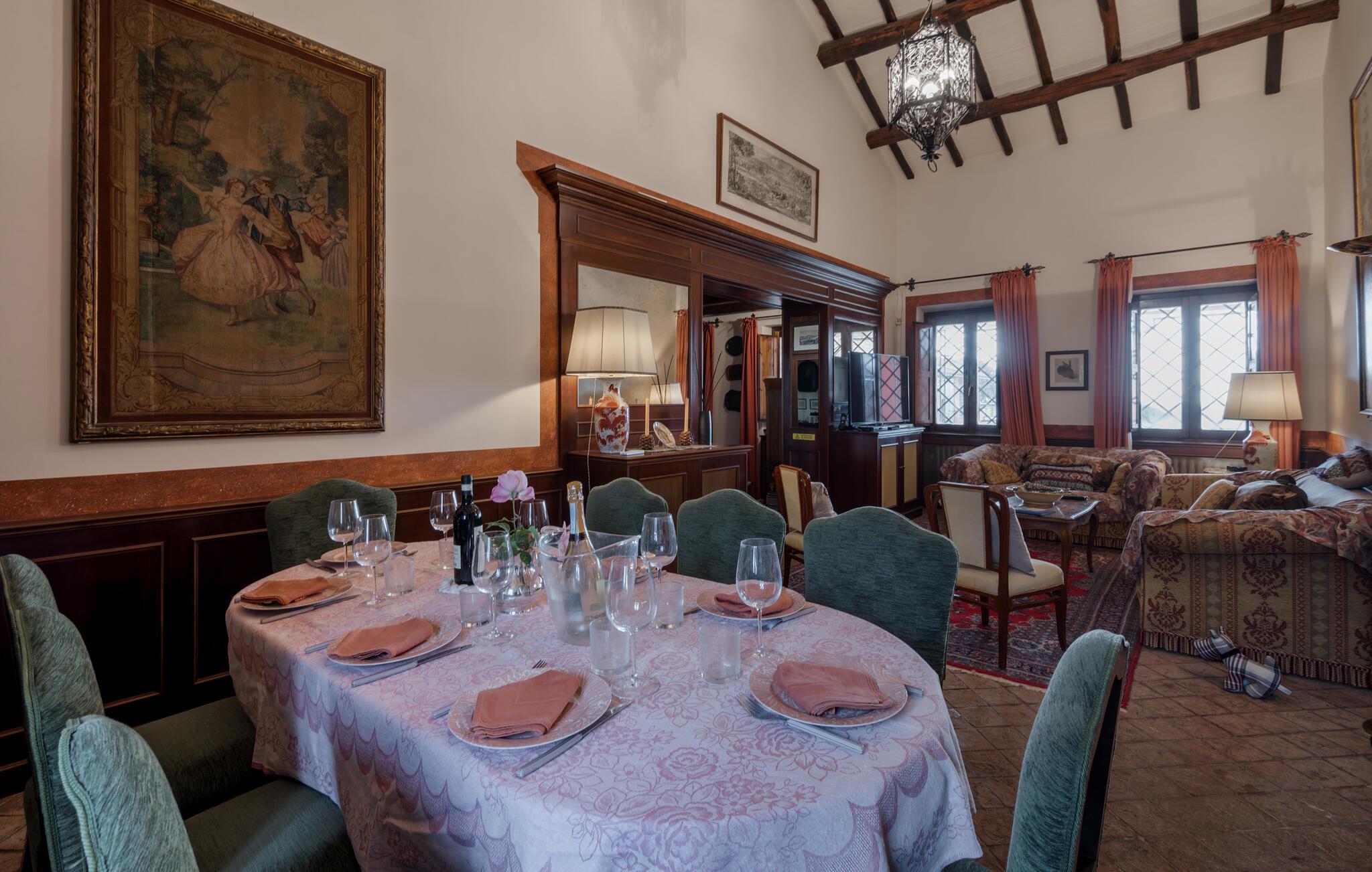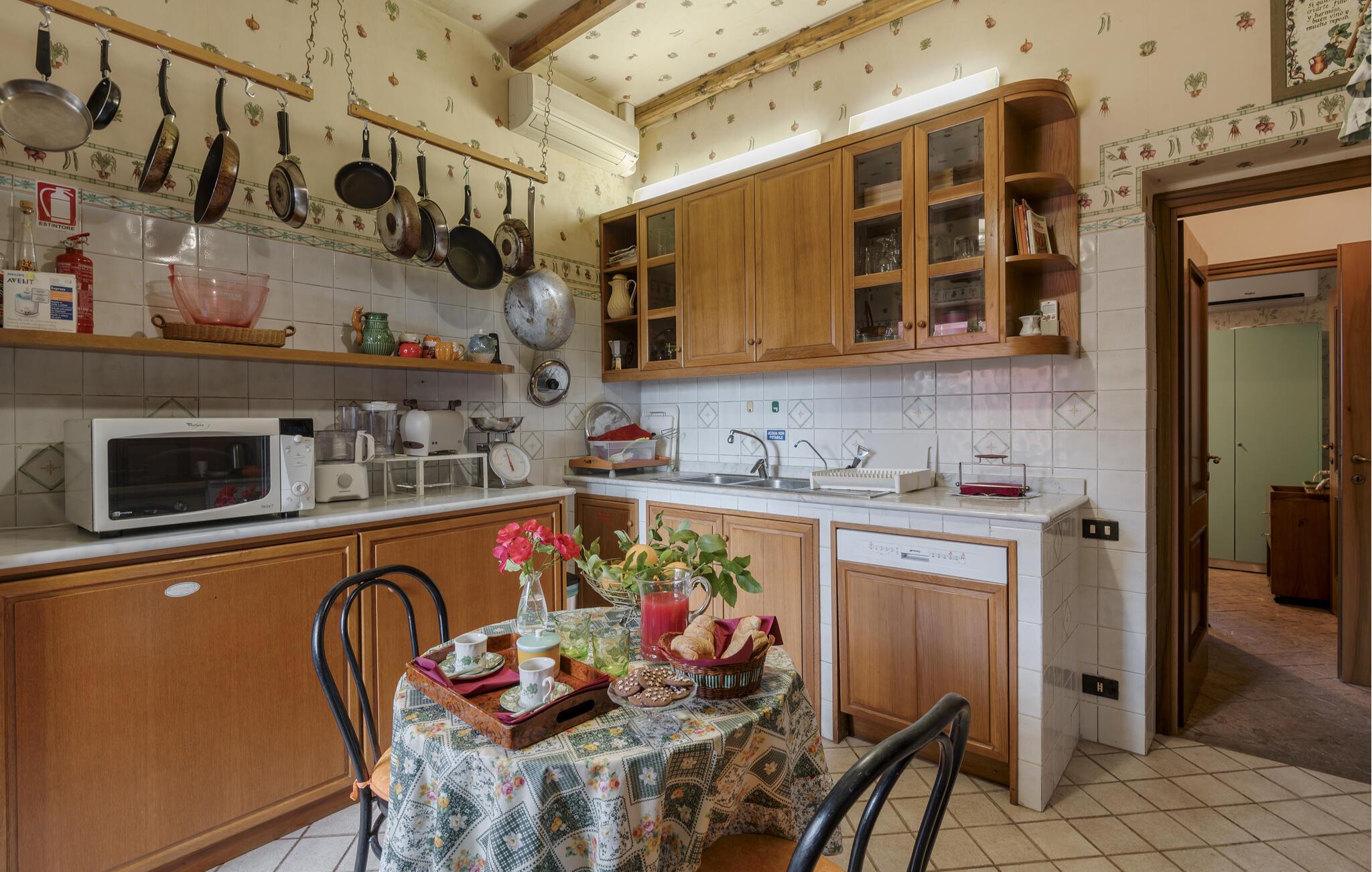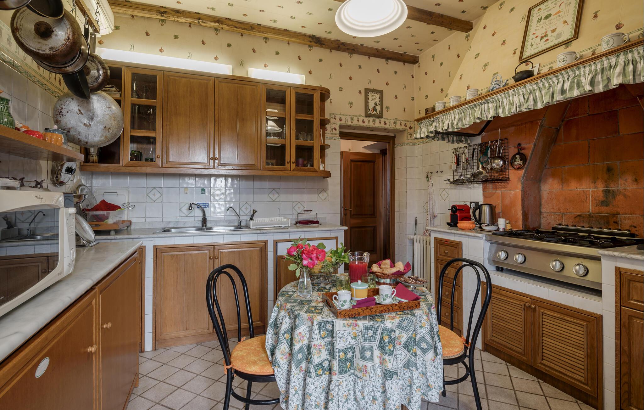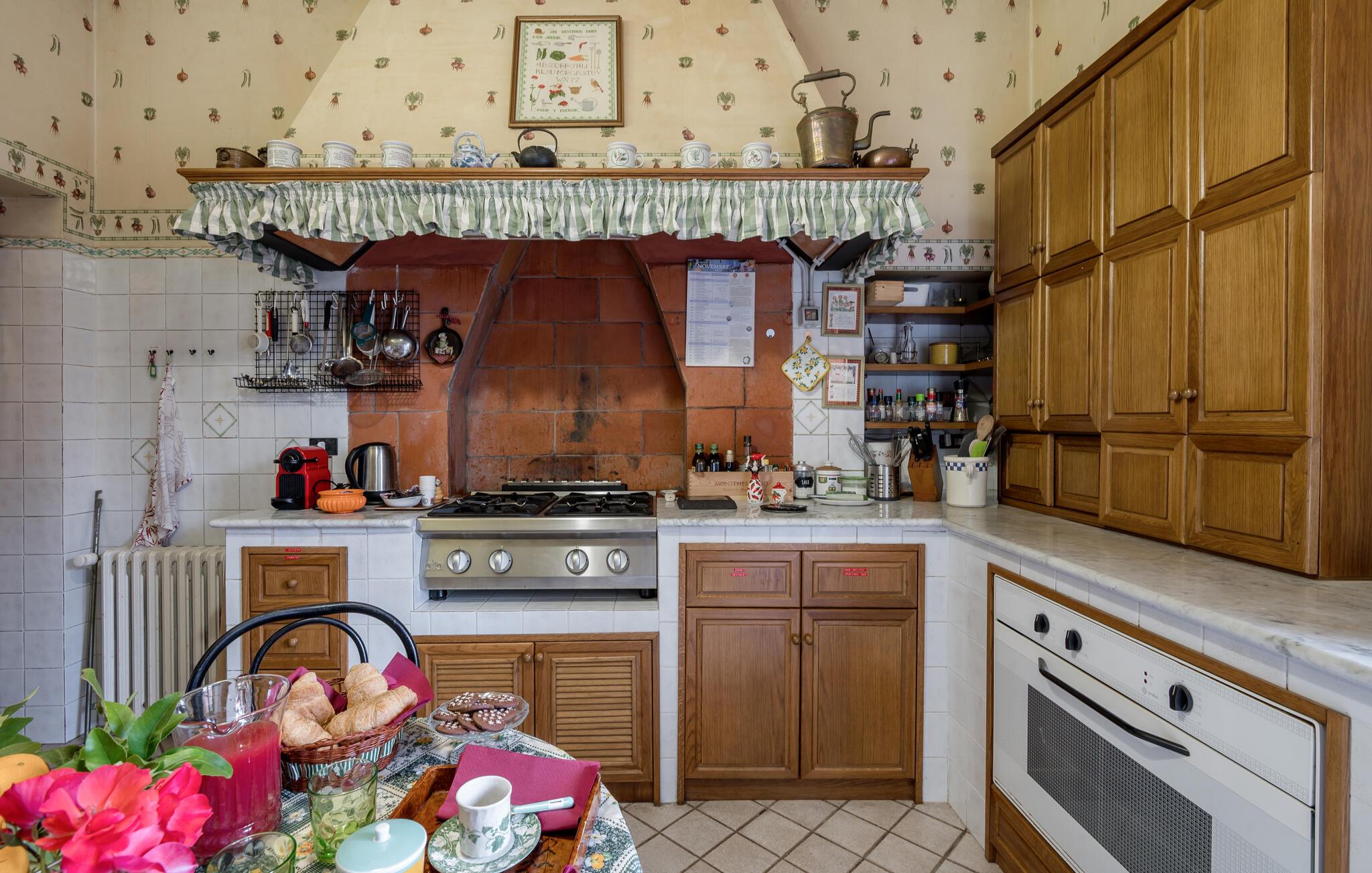 Verbringen Sie den Nachmittag im gemütlichen Wohnzimmer, das mit antiken Möbeln und kunstvollen Dekorationen ausgestattet ist. Die hohen Decken und die historische Einrichtung verleihen dem Raum eine besondere Atmosphäre. Und bereiten Sie ein traditionelles italienisches Mittagessen in der stilvollen Küche des Hauses zu. Nutzen Sie die Möglichkeit, im Freien zu speisen. Das Ferienhaus bietet einen wunderbaren Außenbereich mit einer überdachten Terrasse, ideal für ein gemütliches Abendessen an der frischen Luft.