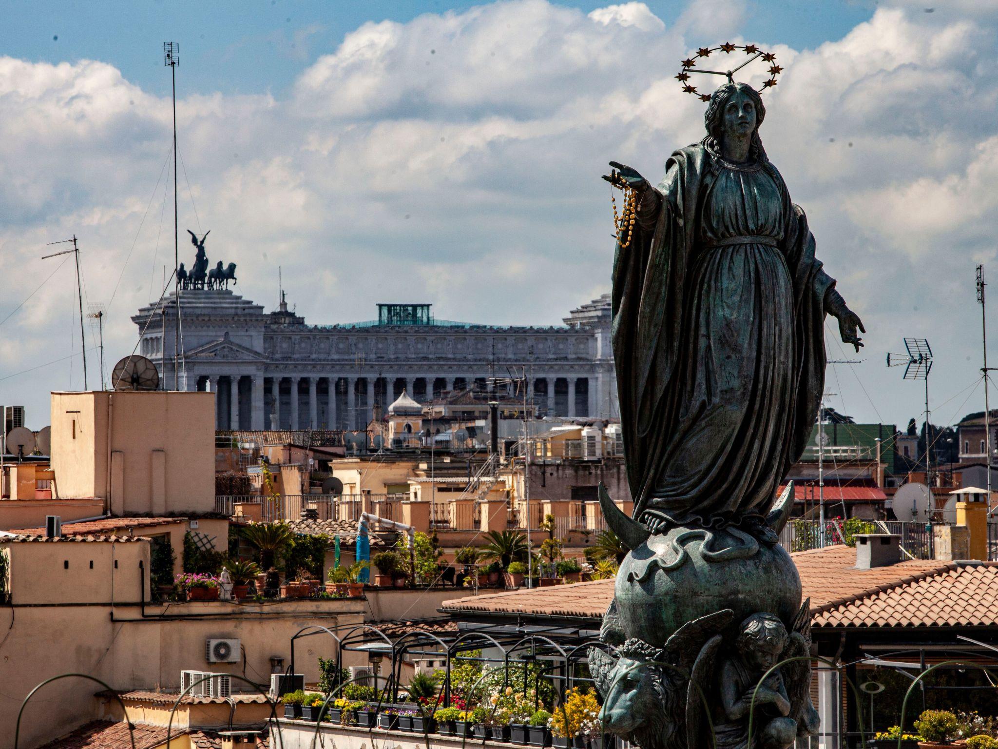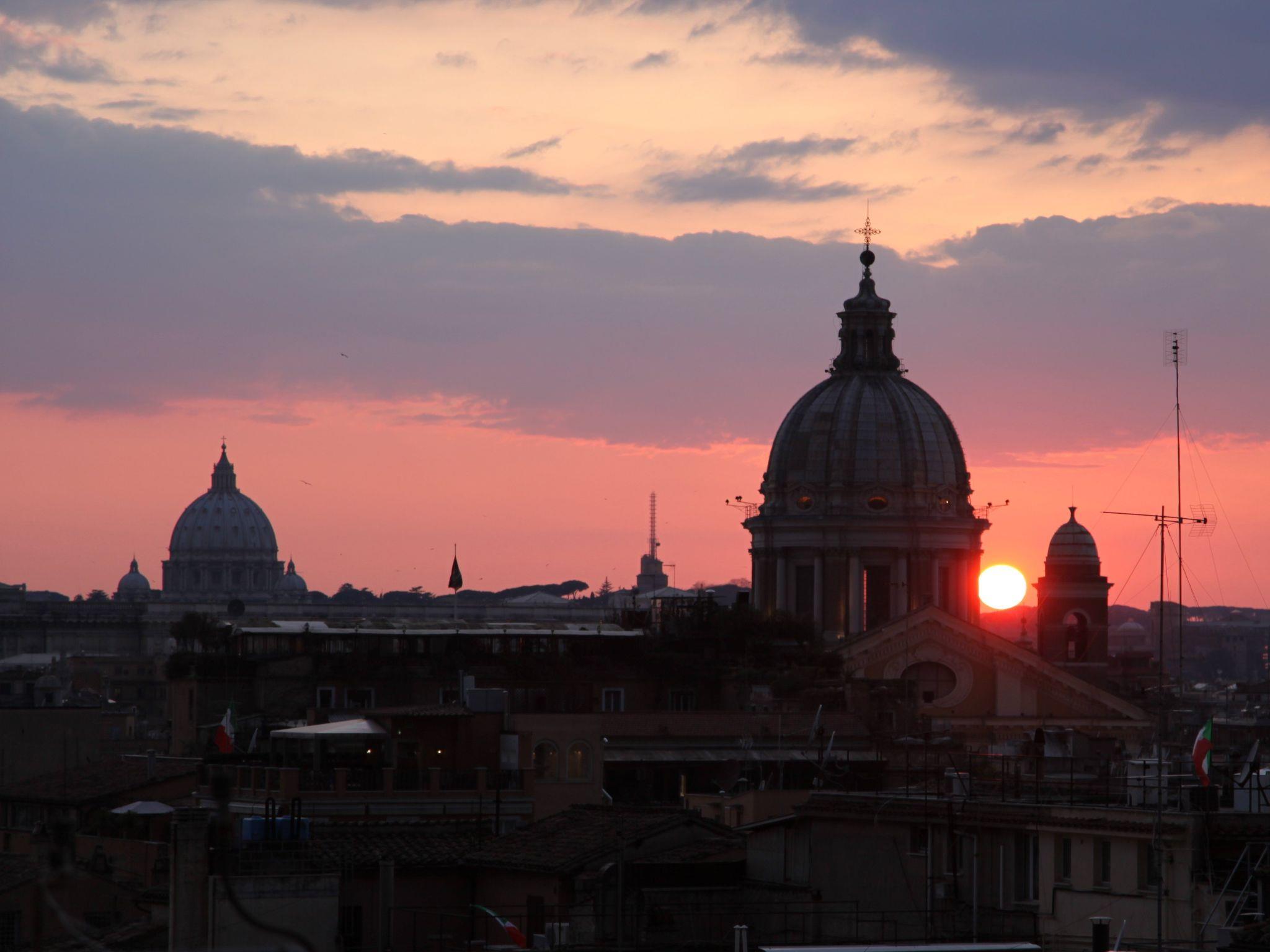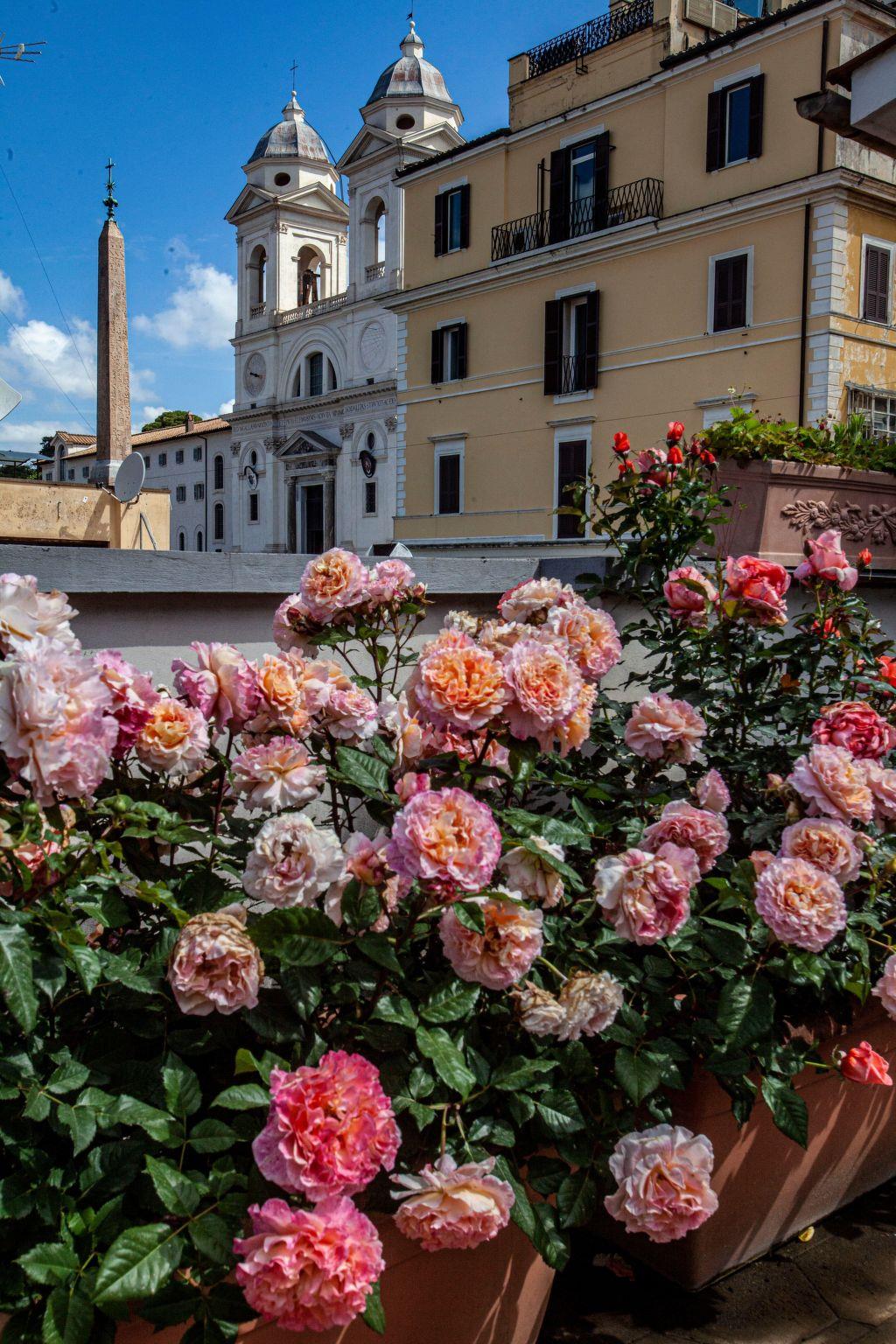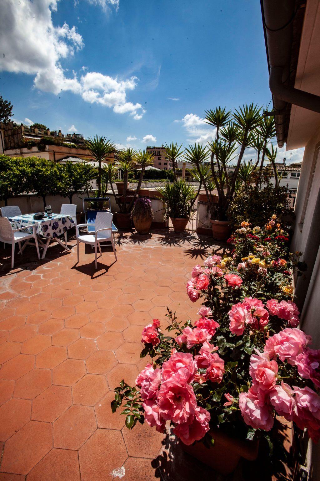 Die sonnige gepflegte 200-qm-Dachterrasse mit vielen Rosen, Zitronen- und Orangenbäumchen, Bougainvillea- und duftenden Lavendelpflanzen hat einen herrlichem 360 Grad-Blick über Rom. Sie liegt eine Etage höher über der Ferienwohnung und steht den Gästen zum Relaxen mit Terrassenmöbeln und Liegebetten zur Verfügung. Ein besonderes Erlebnis ist der Sonnenuntergang mit Blick über Rom und die Sankt Peter-Basilika. An Silvester in Rom ist das Panorama auf der pittoresken Dachterrasse einmalig. Um Mitternacht sieht man das Feuerwerk von ganz Rom.