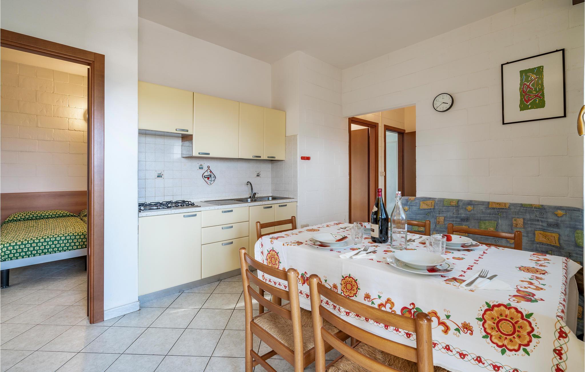 Diese Ferienwohnung in Rosolina Mare bietet Ihnen eine kompakte und praktische Unterkunft, nur einen Katzensprung vom Meer entfernt. Die Umgebung ist ideal für einen entspannten Urlaub mit Zugang zu Natur, Stränden und kulturellen Ausflugszielen. Nutzen Sie die Nähe zur Adriaküste und entdecken Sie die malerische Halbinsel, die von Lagunen und Pinienwäldern geprägt ist. Im Inneren erwartet Sie eine zweckmäßig eingerichtete Wohnung im ersten Stock. Der Wohnbereich verfügt über einen Esstisch, eine Kochnische und eine Sitzgelegenheit.