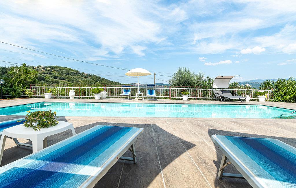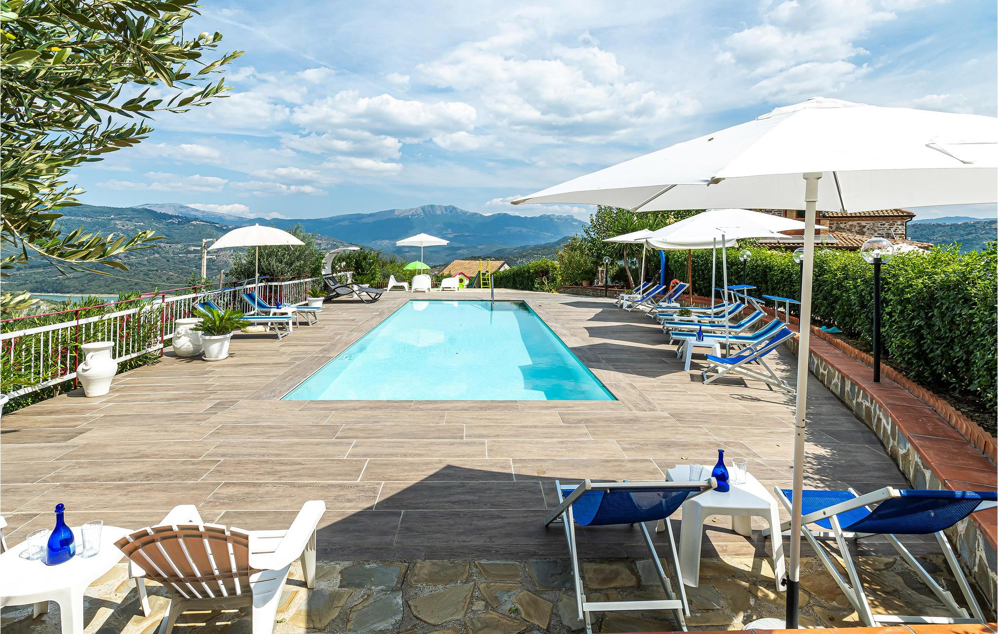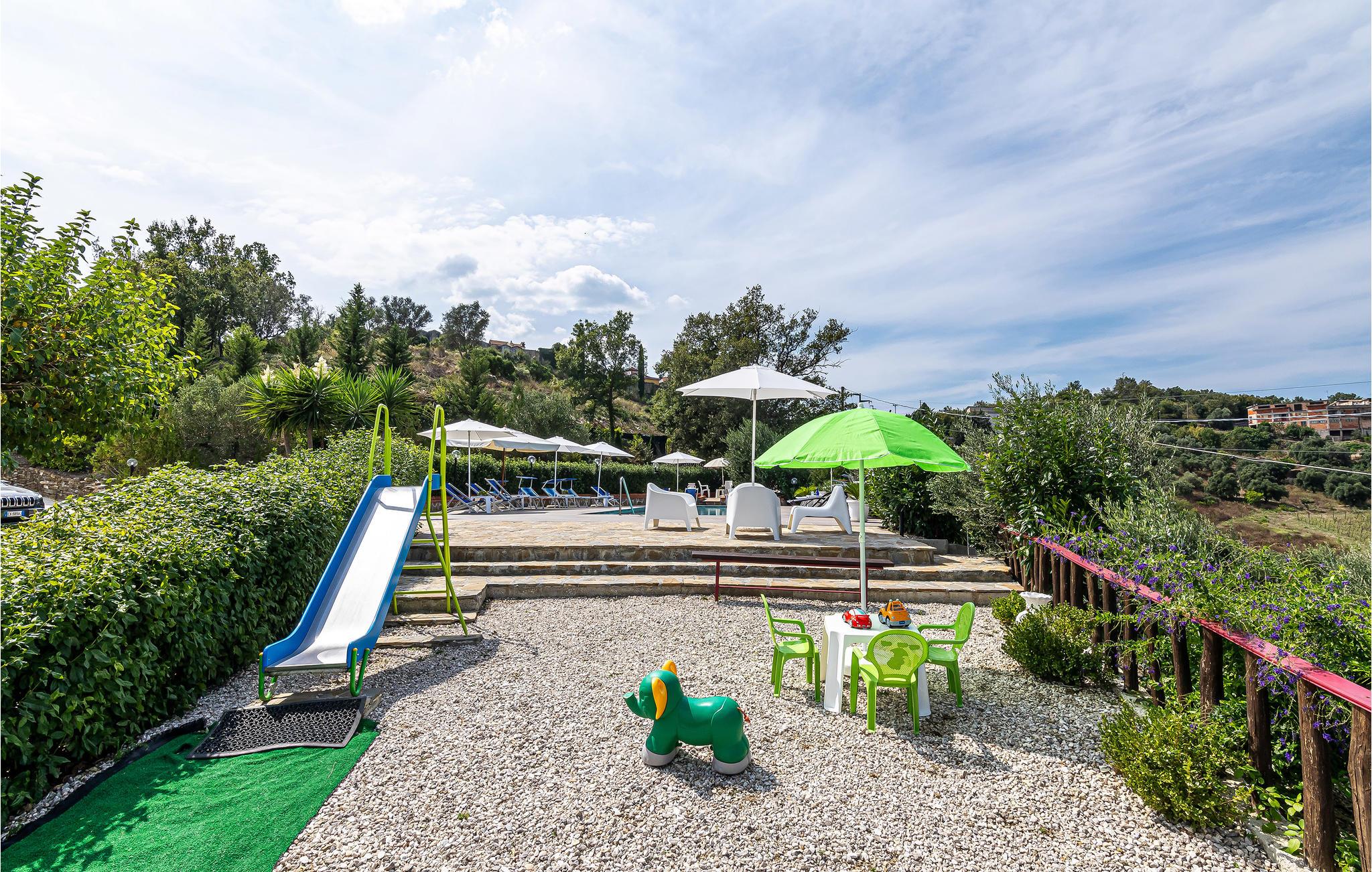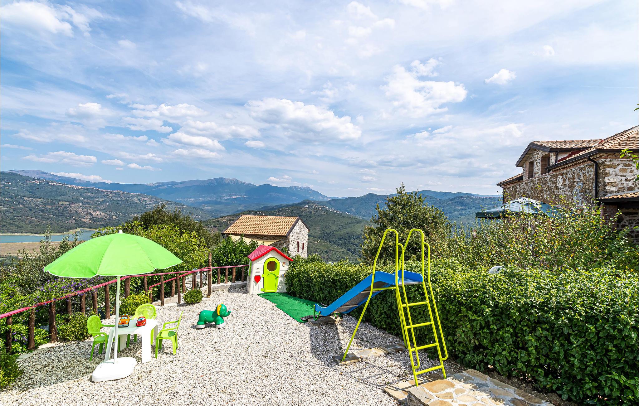 Genießen Sie vom Balkon den atemberaubenden Blick auf die Berge. Im Garten bietet der sichtgeschützte Pool herrliche Erfrischung und in der Außenküche können Sie wunderbar gemeinsam kochen, während die Kinder sich am Spielhaus vergnügen. Gemütliche Gartenmöbelladen zum Entspannen ein und ein Grill ist ebenfalls vorhanden.