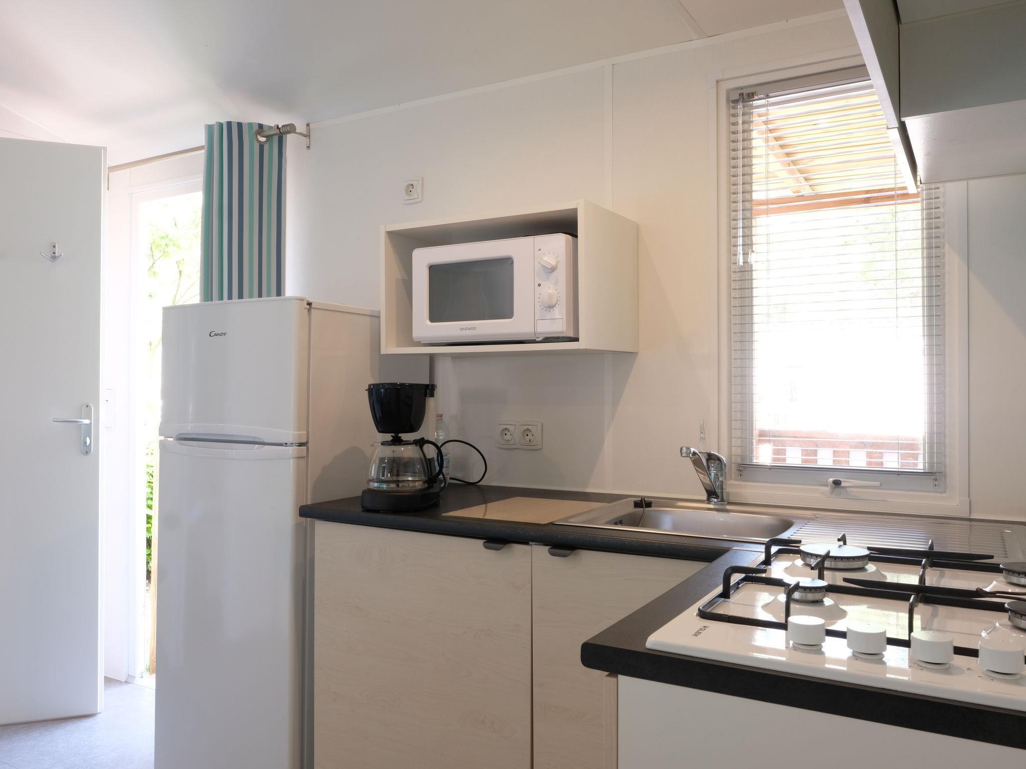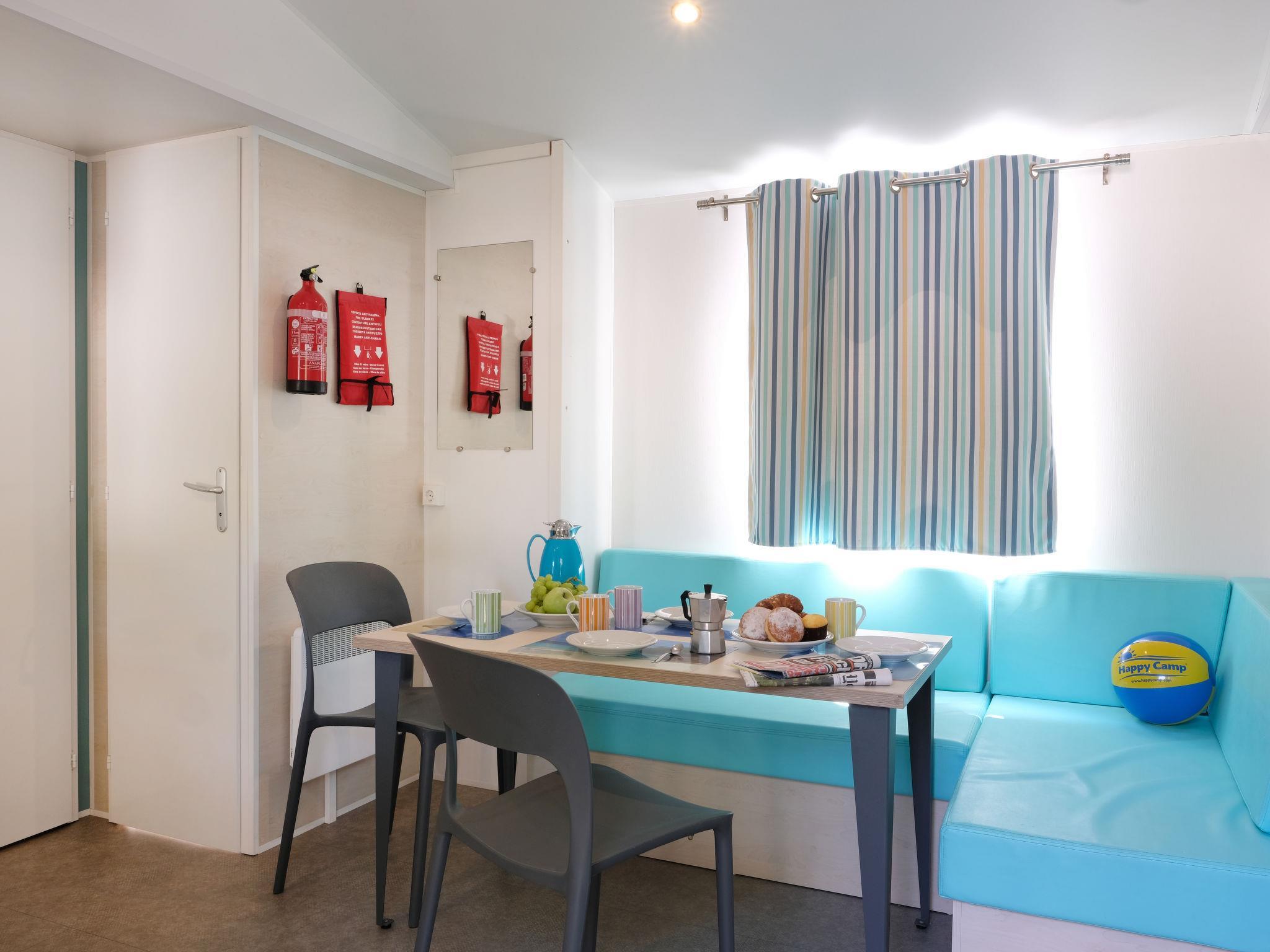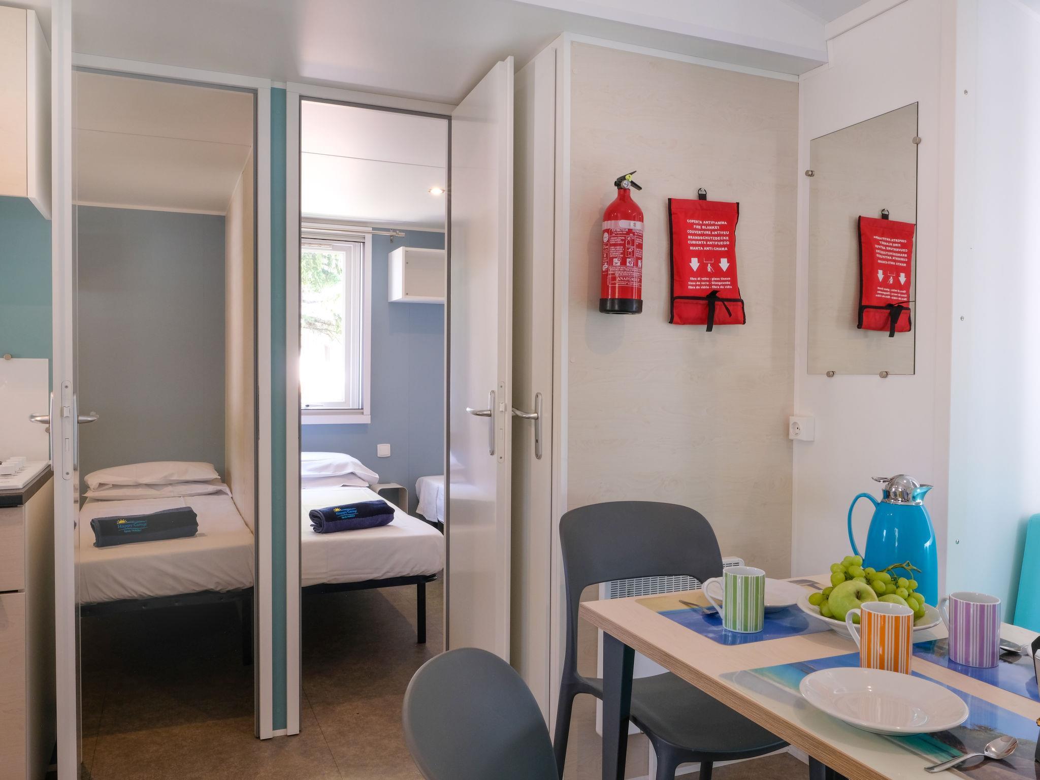 "Happy Premium", 4-Zimmer-Mobilheim 30 m2. Komfortabel eingerichtet: Wohn-/Esszimmer mit E-Heizung und Klimaanlage. 1 Zimmer mit 1 franz. Bett (140 cm, Länge 190 cm). 2 Zimmer, jedes Zimmer mit 2 Betten (70 cm, Länge 190 cm). Offene Küche (4 Kochplatten, Mikrowelle, Tiefkühler, elektrische Kaffeemaschine). Dusche/WC. Klimaanlage (extra). Terrasse teilweise überdacht. Terrassenmöbel, Gartengrill (mobil), Liegestühle (2). Zur Verfügung: Fliegengitter. Parkplatz (1 Auto). Bitte beachten: Nichtraucher-Unterkunft. IT017171B1LCE2B6U8