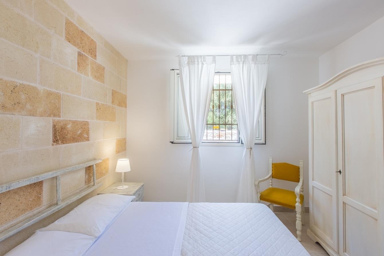 n.1 Doppelzimmer mit Kleiderschrank, n.1 Schlafzimmer im Trullo-Zimmer mit n.1 Doppelbett und einem kleinen Fenster von 50 cm x 50 cm, n.1 Nische im Wohnzimmer mit n.1 Einzelbett, ein klimatisiertes Esszimmer, 1 Badezimmer mit Dusche.
