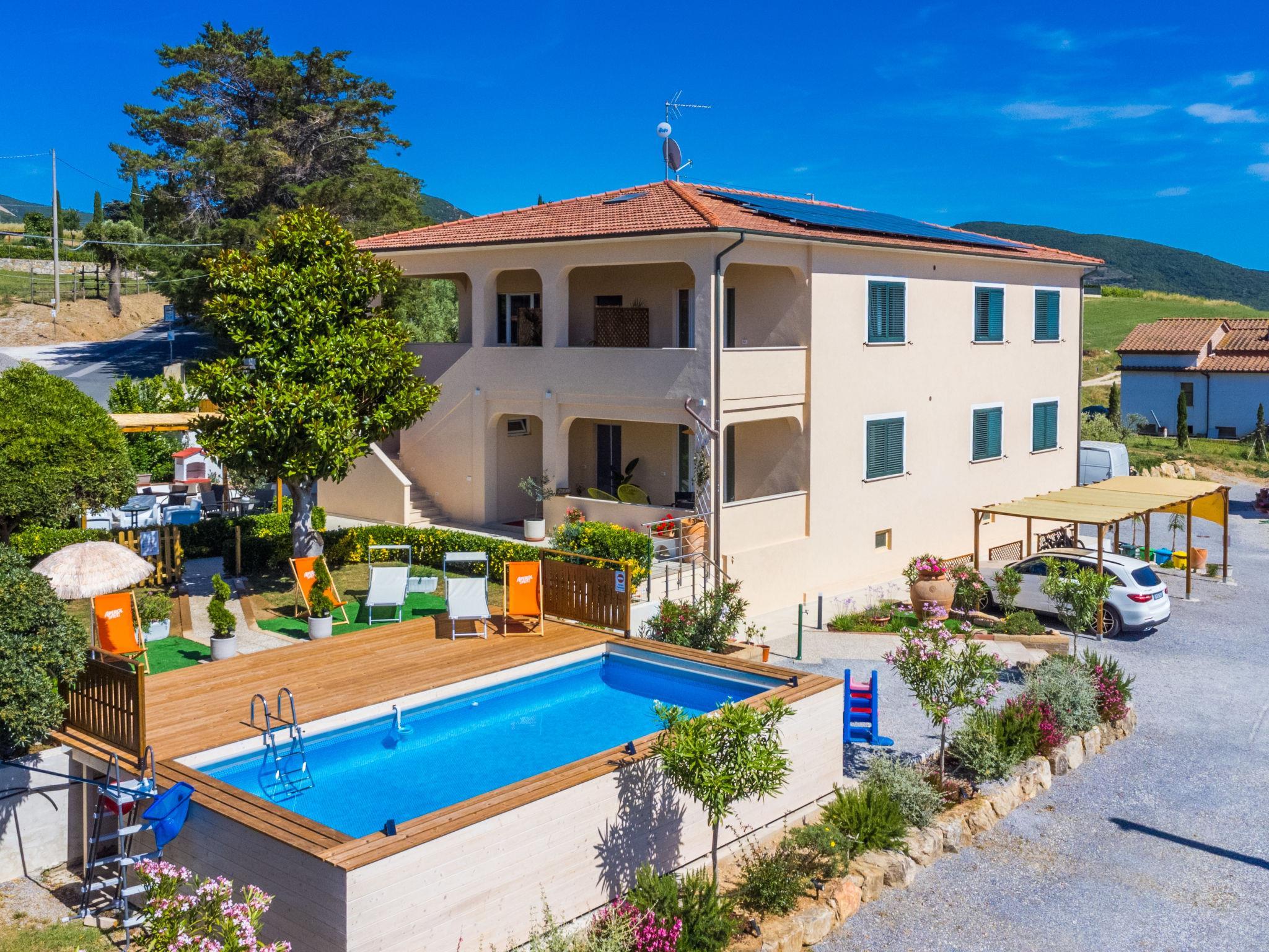 Exklusive Wohnungen in herrlicher Panoramalage. Modernes Mehrfamilienhaus "San Paolo", auf 2 Stockwerken, renoviert im Jahre 2025. 3 km vom Zentrum von San Vincenzo, auf einem Hügel, 3 km vom Meer, 3 km vom Strand. Zur Mitbenutzung: Grundstück (eingezäunt), Liegewiese, Aufstellpool (8 x 4 m, 125 - 125 cm tief, saisonale Verfügbarkeit: 17.Mai. - 15.Okt. Öffnungszeiten Schwimmbad: 09:00-19:00). Gartenmöbel, Grill, Poolpflege durch den Besitzer/Gärtner. Im Hause: Waschmaschine (extra) (zur Mitbenutzung). Parkplatz auf dem Grundstück. Einkaufsgeschäft 3 km, Supermarkt 2 km, Restaurant 50 m, Bushaltestelle 1.7 km, Bahnstation "San Vincenzo" 3 km. Jacht-Hafen 4 km, Golfplatz (18 Loch) 40 km. Nahe gelegene Sehenswürdigkeiten: Grosseto 75 km, Siena 115 km, Firenze 140 km. Bitte beachten: Der Besitzer wohnt im selben Haus.