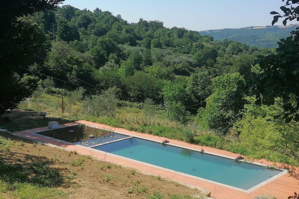 Das Zelt steht auf einen großen Holzterrasse im Schatten jahrhundertealter Kastanienbäume, und hat ein Maximum an Privatsphäre. Im Zelt finden Sie ein Doppelbett und auf Wunsch 2 Einzelbetten. Außerdem Teppiche auf dem Boden, Strom und Wasser. Auf der Terrasse mit Blick auf dem Tal gibt es einen Esstisch mit Stühlen, Sonnenschirm und Sonnenliegen. Es gibt eine geräumige Küche zur gemeinsamen Nutzung, die mit allem ausgestattet ist, was Sie für einen angenehmen Aufenthalt benötigen: Backofen, Gasherd, privat Kühlschrank, Besteck, Teller usw. Die Duschen und Toiletten (privat) befindet sich neben dem Zelt, der Pool ist etwas 50 m vom Zelt entfernt.