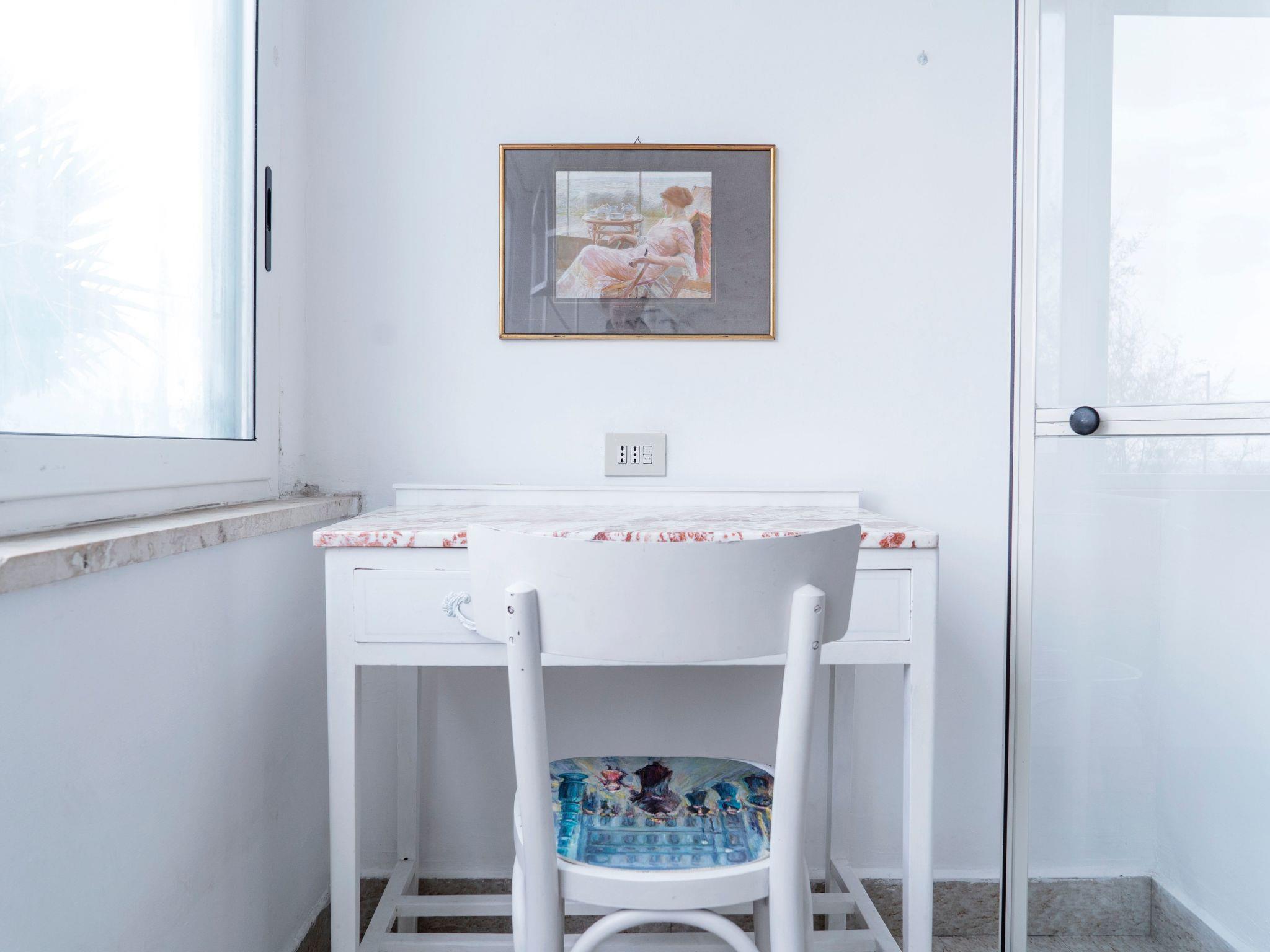 Das Innere der Wohnung ist sorgfältig gestaltet, um maximalen Komfort zu gewährleisten. Im Erdgeschoss lädt ein geräumiges Wohnzimmer mit Meerblick und Kamin zum Entspannen ein, flankiert von einer voll ausgestatteten offenen Küche und einem Service-Bad. Im ersten Stock befinden sich zwei gemütliche Doppelschlafzimmer und ein Bad mit Dusche. Vom Zimmer mit Meerblick gelangt man auf einen schönen verglasten Balkon und über eine Wendeltreppe auf die Sonnenterrasse, die sich perfekt für ein Frühstück im Freien oder ein Abendessen unter dem Sternenhimmel eignet, das in Erinnerung bleiben wird.