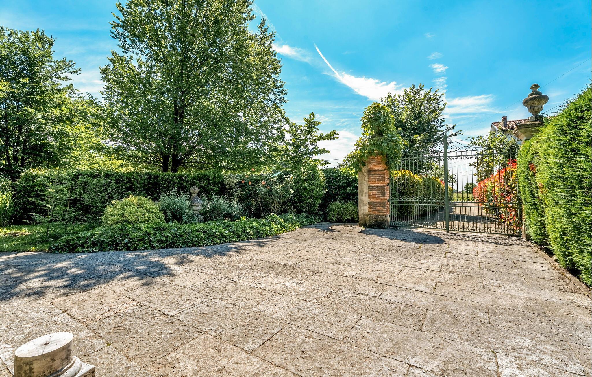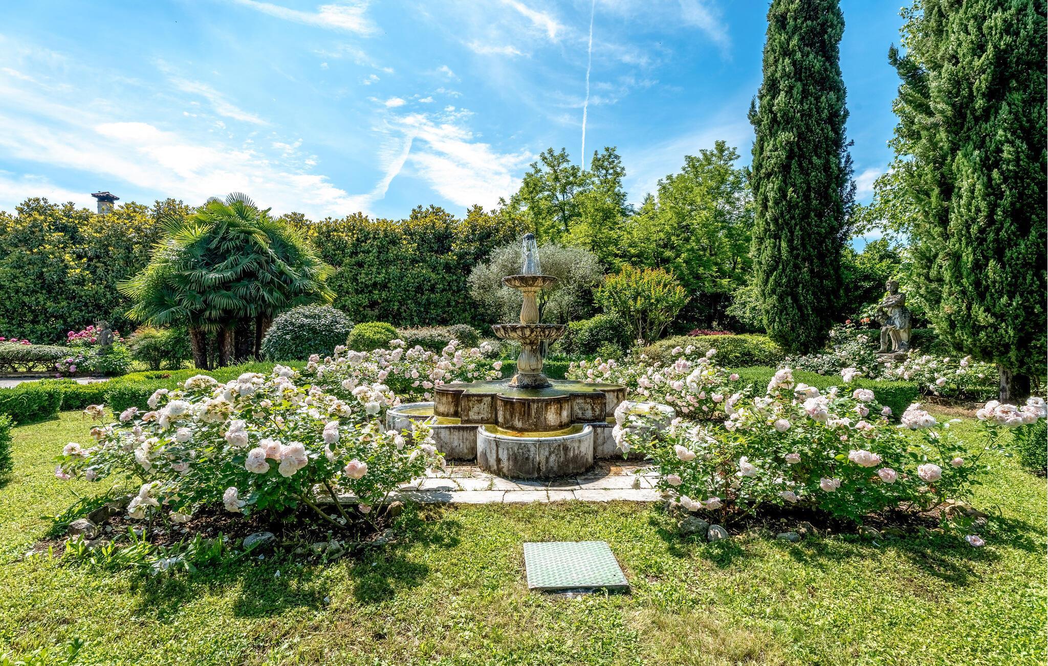 Das Haus, Teil des Weilers, war ursprünglich das Jagdschloss einer Adelsfamilie und ist von einem umzäunten Park mit einem herrlichen Garten voller Blumen, Pflanzen, Brunnen und Obstbäume umgeben. Der für Gäste reservierte Teil des Hauses erstreckt sich über zwei Etagen. Im Erdgeschoss befindet sich ein Portikus mit Säulen mit Blick auf den Garten. Über eine antike Marmortreppe vom Wohnzimmer erreichen Sie die Wohnküche, aus deren Fenstern Sie einen Teil des Gartens sehen können und den Dachboden mit einem Doppelbett, ein paar Stufen führen hinunter zu den beiden anderen Schlafzimmern.