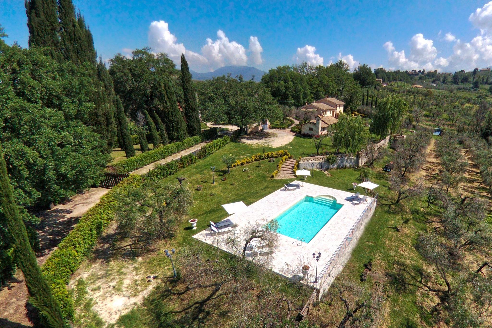 Dieses wunderschöne Ferienhaus bietet einen herrlichen Blick auf die Landschaft der Sabiner Grafschaft, nur 60 km nördlich von Rom. Das Haus liegt mitten im Grünen in einer sehr ruhigen Gegend und bietet vier gemütliche Apartments im Landhausstil. Das Apartment Ulivo verfügt über einen privaten Außenbereich mit Gartenmöbeln, ideal für Mahlzeiten im Freien. Genießen Sie den Panoramablick über Olivenhaine und die Landschaft von Selci in den Sabiner Hügeln. Die Gäste teilen sich einen großen Garten und eine fantastische Pergola zum Entspannen und für Mahlzeiten am Grill. Privatsphäre ist garantiert, da das Grundstück komplett eingezäunt ist. Am Pool im unteren Bereich des Anwesens, inmitten von Natur und Olivenbäumen, genießen Sie einen wunderschönen Panoramablick. Die Salzwasserpools bieten zahlreiche Vorteile, darunter weniger Haut- und Augenreizungen und sind daher ideal für empfindliche Personen. Sie haben keinen starken Chlorgeruch und benötigen weniger Chemikalien, was sich positiv auf die Umwelt auswirkt. Salzwasser sorgt außerdem für glattere Haut, verbessert die Wasserqualität und trägt durch wohltuende Sinneserlebnisse zum allgemeinen Wohlbefinden bei. Das Anwesen liegt in der Nähe von Selci, im Herzen der wunderschönen Sabina, die für ihre Olivenölproduktion bekannt ist. Sie ist noch immer authentisch und vom Massentourismus verschont geblieben. Die sanfte Hügellandschaft, in der die Landwirtschaft perfekt mit der umgebenden Natur harmoniert, bietet Kirchen und Klöster, römische Villen, mittelalterliche Burgen, ausgezeichnete Restaurants und lokale Spezialitäten, Wanderwege sowie einen Naturpark in der Nähe des Tiber, der sich ideal zum Wandern, Radfahren, Reiten und zur Vogelbeobachtung eignet.