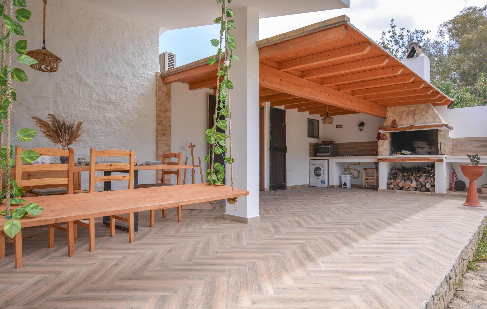Auf der Terrasse erwartet Sie eine Schaukel, die sowohl Groß als auch Klein Freude bereitet. Die überdachte Terrasse beherbergt zudem eine Sommerküche mit Grill, ideal für Ihre geselligen Abende im Freien.