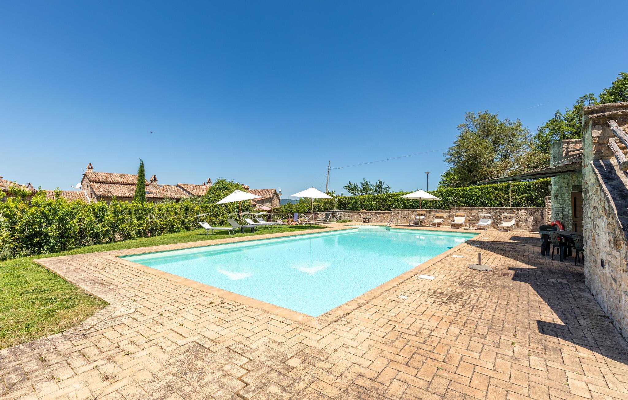 Gemütliches, typisches Appartement in einem winzigen und ruhigen, mittelalterlichen Weiler mit nur 6 Ferienappartements. Besonders schöner Blick auf die Hügel. Ruhige Lage. In Gemeinschaft: großer Aussenbereich mit Olivenbäumen, Sonnenterrasse beim Schwimmbecken, kleines, rundes Schwimmbecken (Durchm. 2,5 m) und Club-Haus (Esszimmer mit Kochecke). Komfortable Einrichtung. S. auch das angrenzende Appartement IUP695.